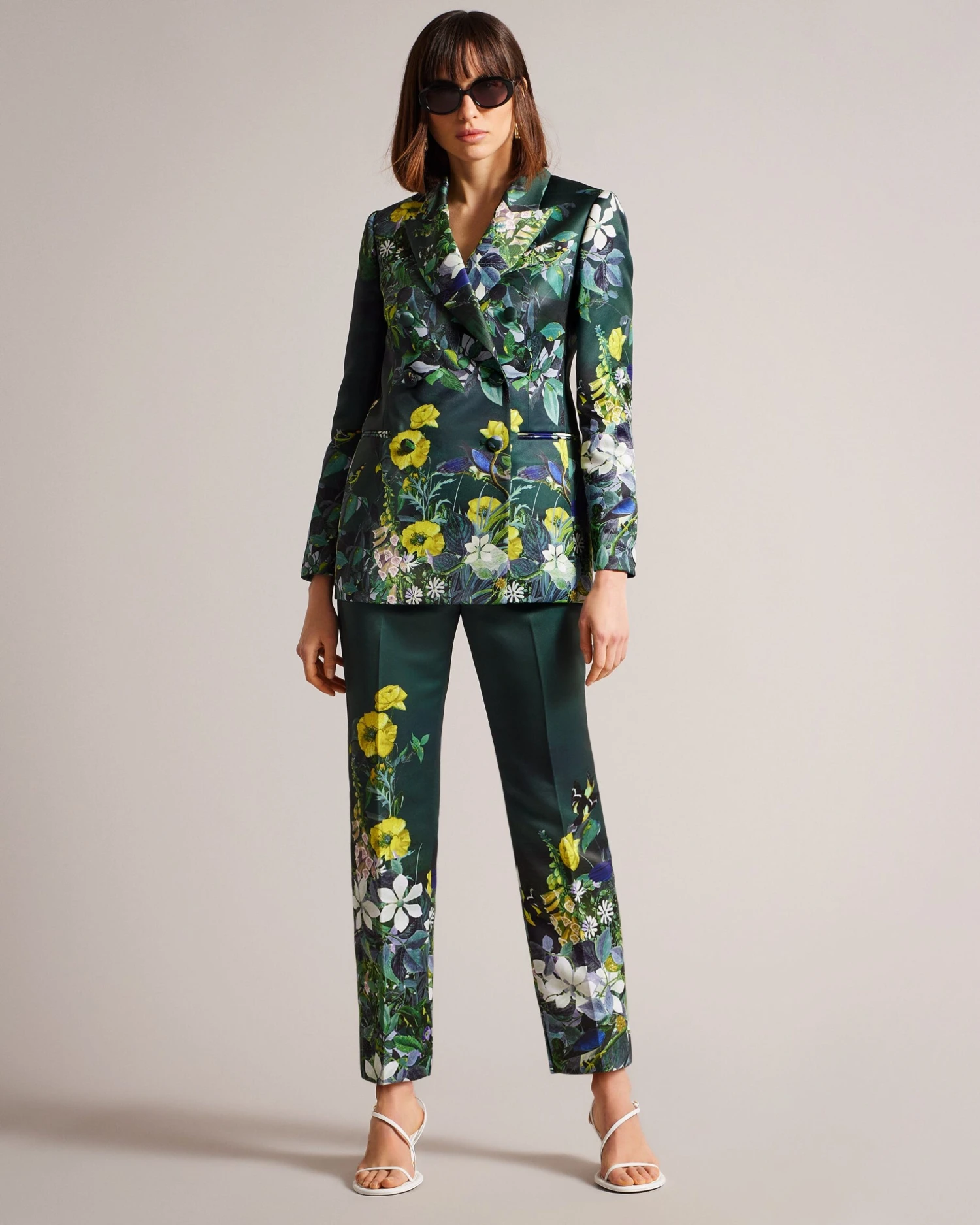 Suit jacket Satin finish Double breasted buttons Peaked lapel Pockets Botanical scene print Matching trousers available: AIKAAT Julia is 5’10” / 1.78m and wears Dark Green in a Ted size 1