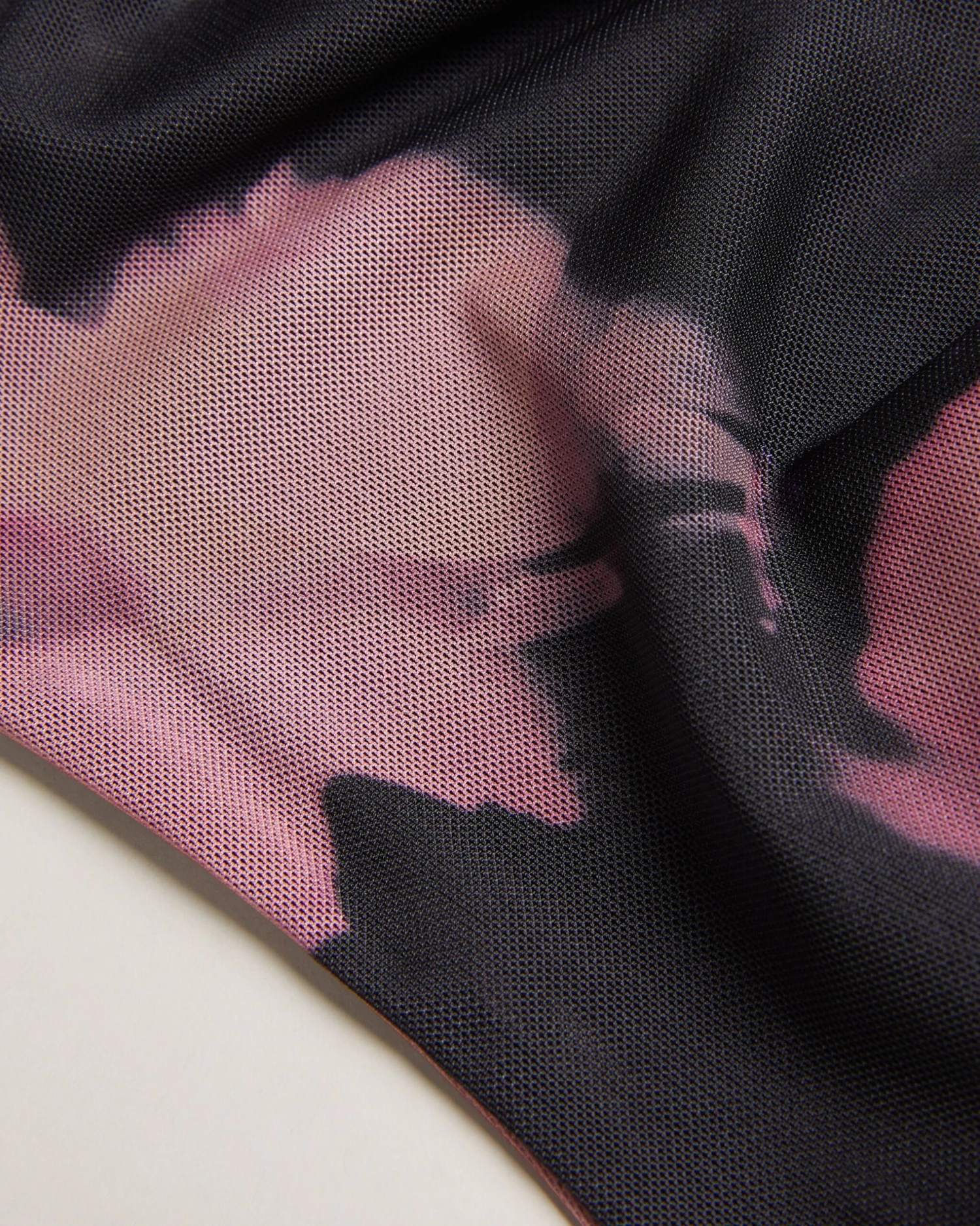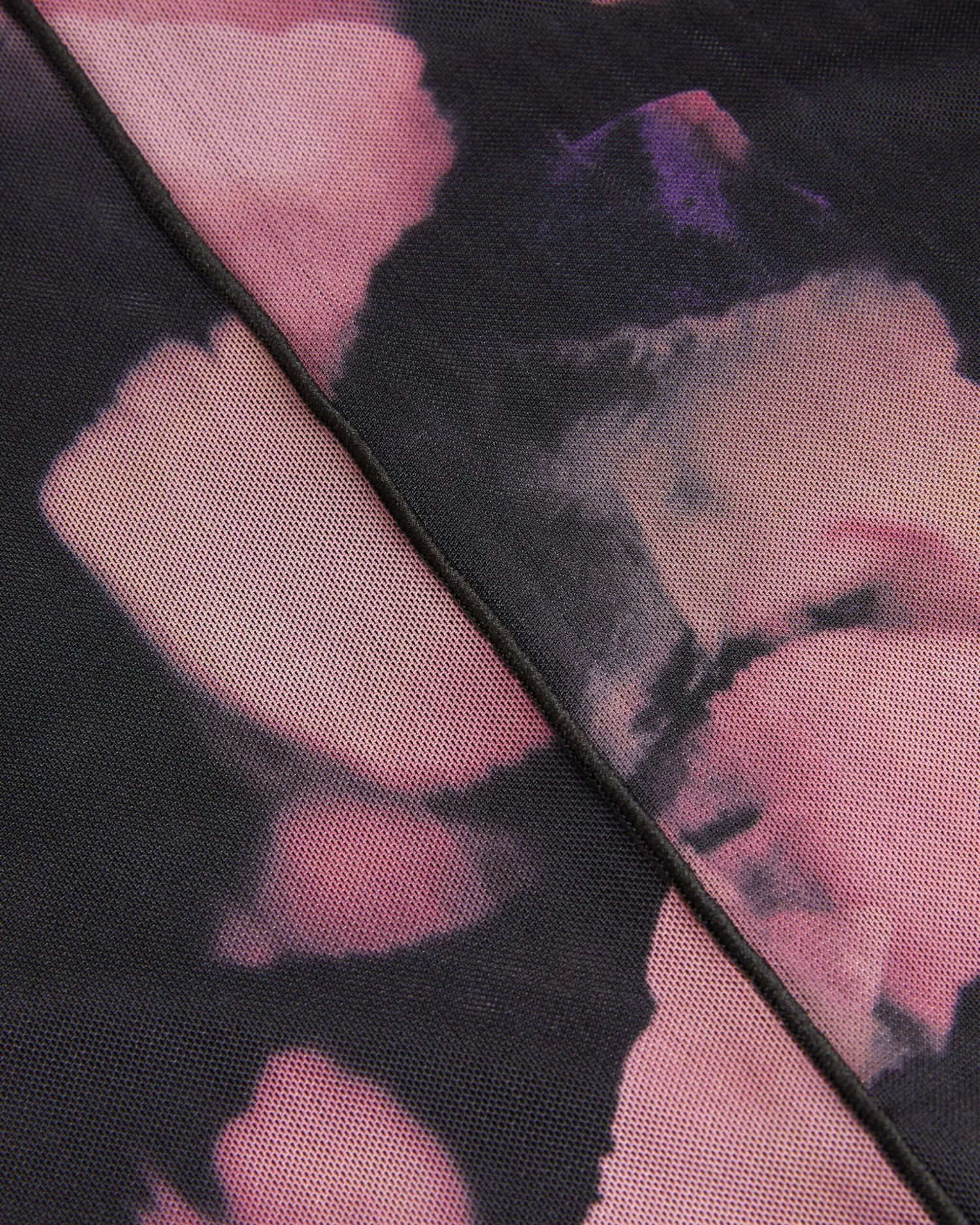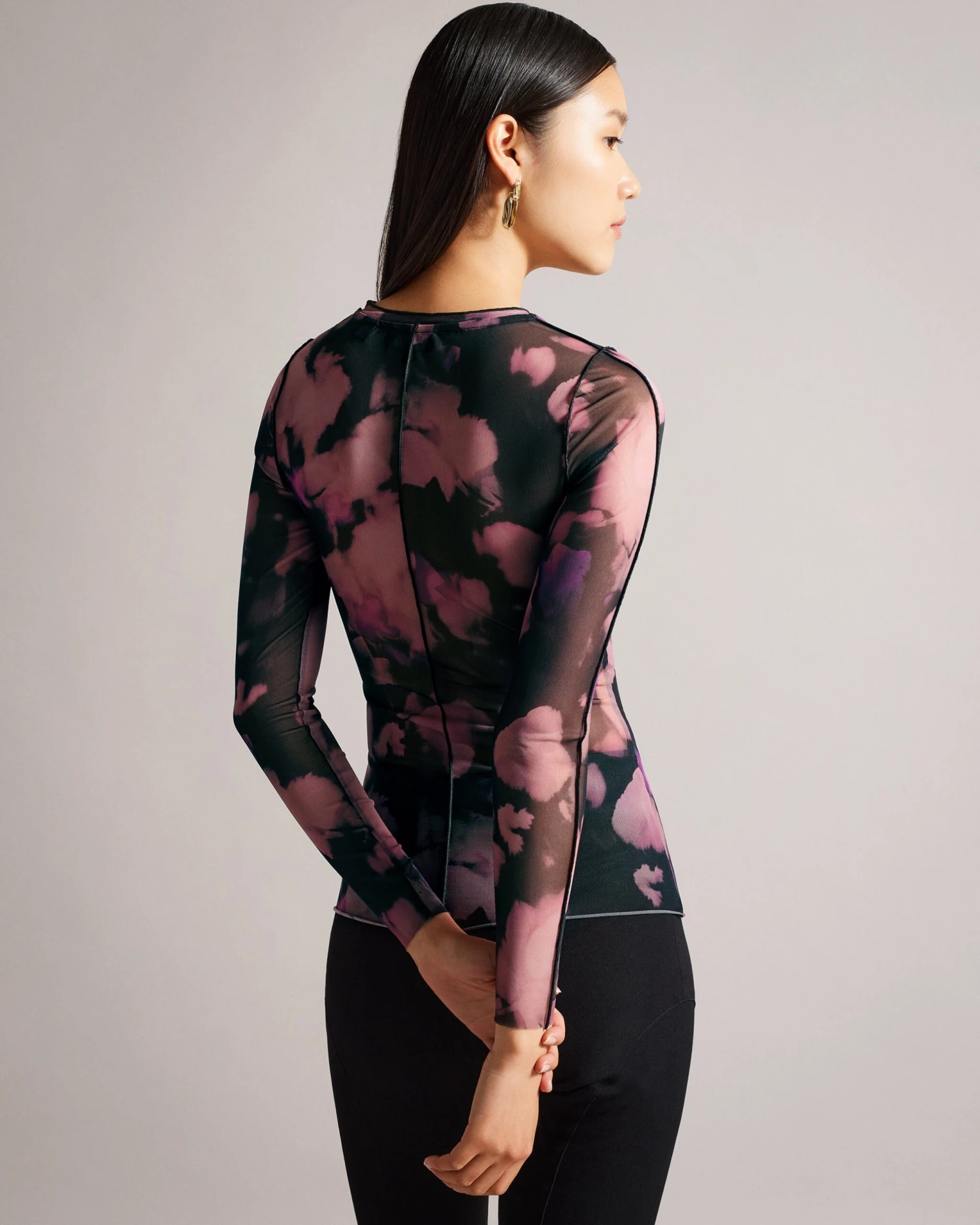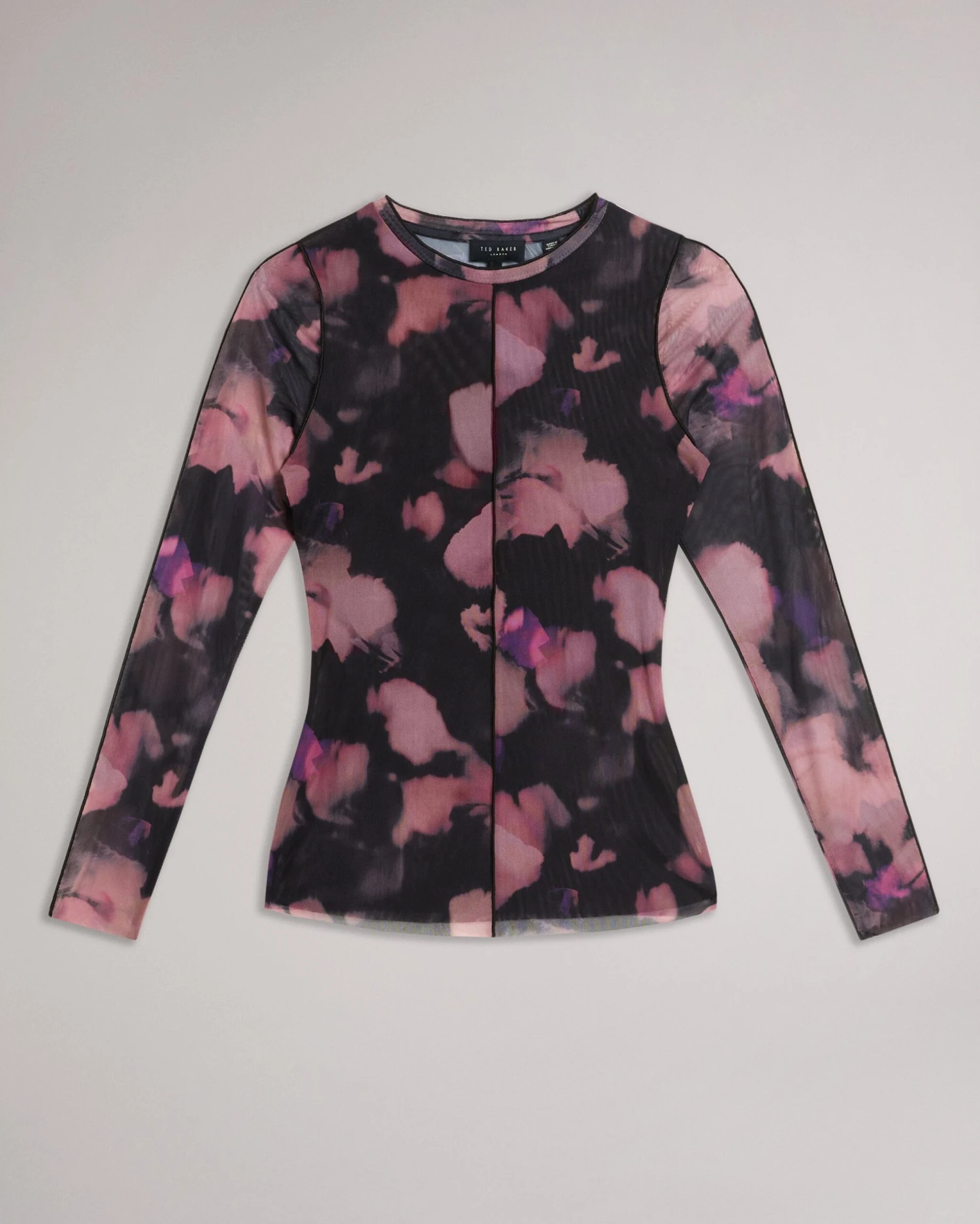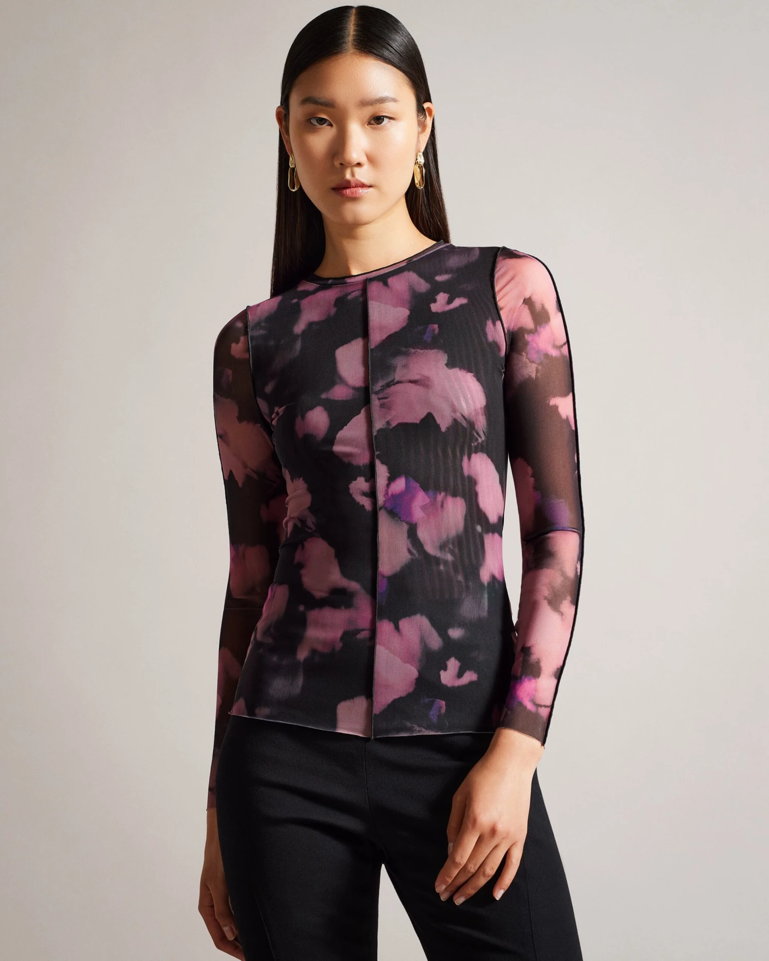 Fitted mesh top Long sheer sleeves Crew neck Overlock seam detailing Abstract print Lined body Hyunser is 5’10.5″ / 1.79m and wears Black in a Ted size 1