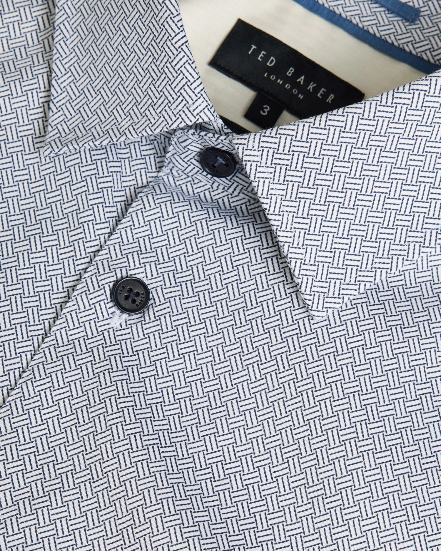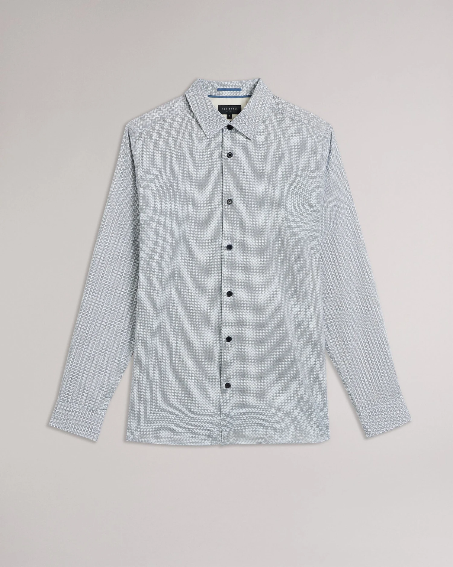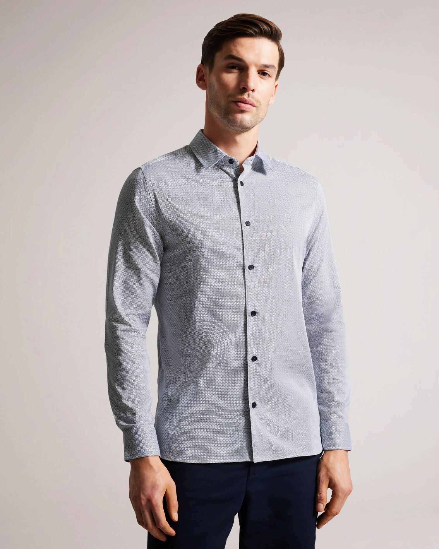 Shirt Button fastening Long sleeved Classic collar Mini geometric print Cotton blend Magnolia label Joseph is 6’1″ / 1.85m and wears Navy in a Ted size 3