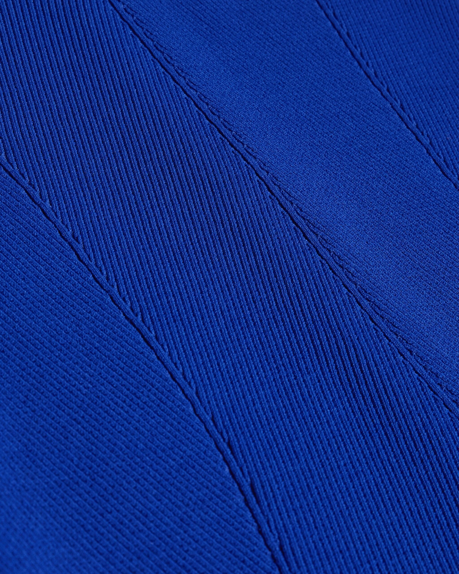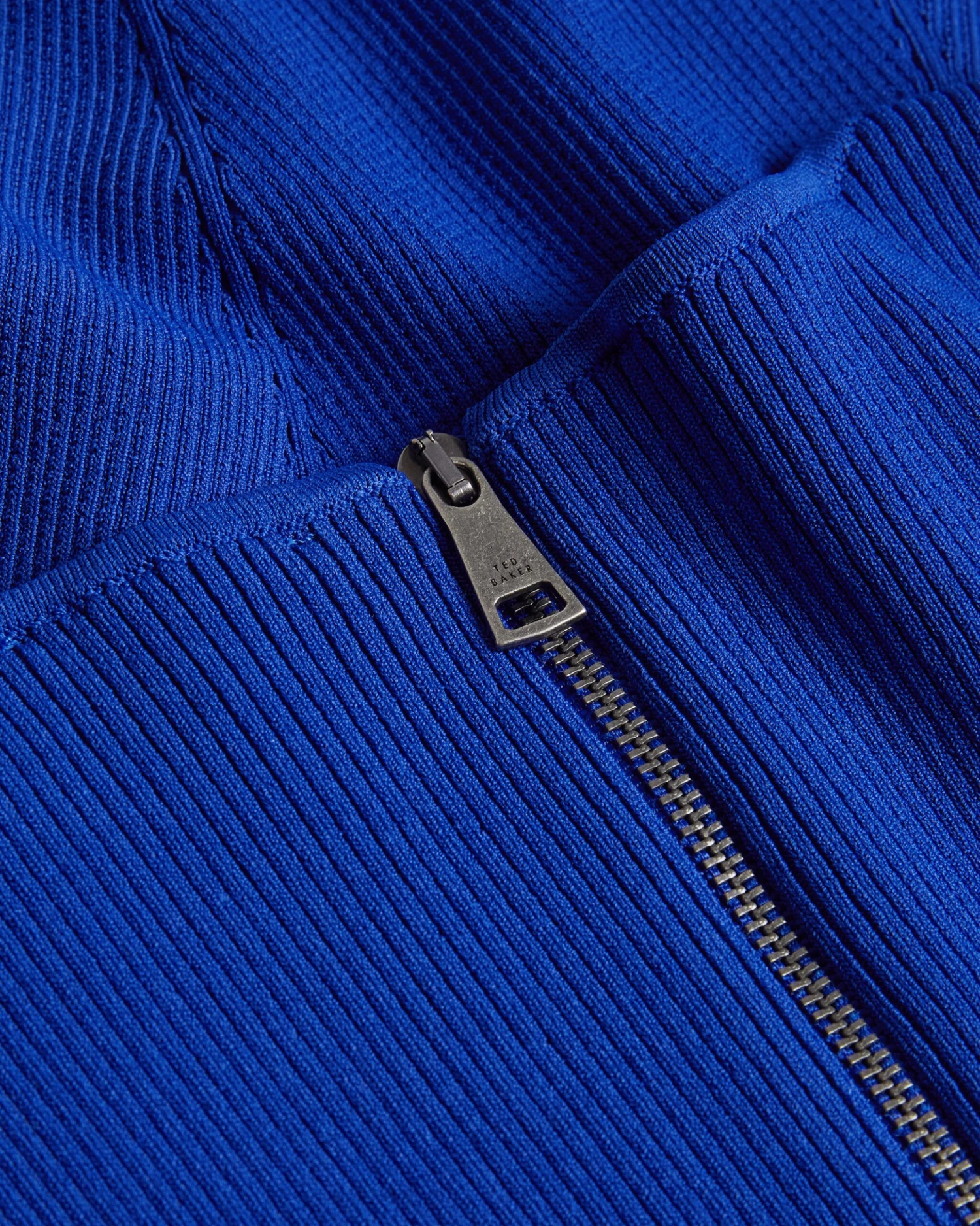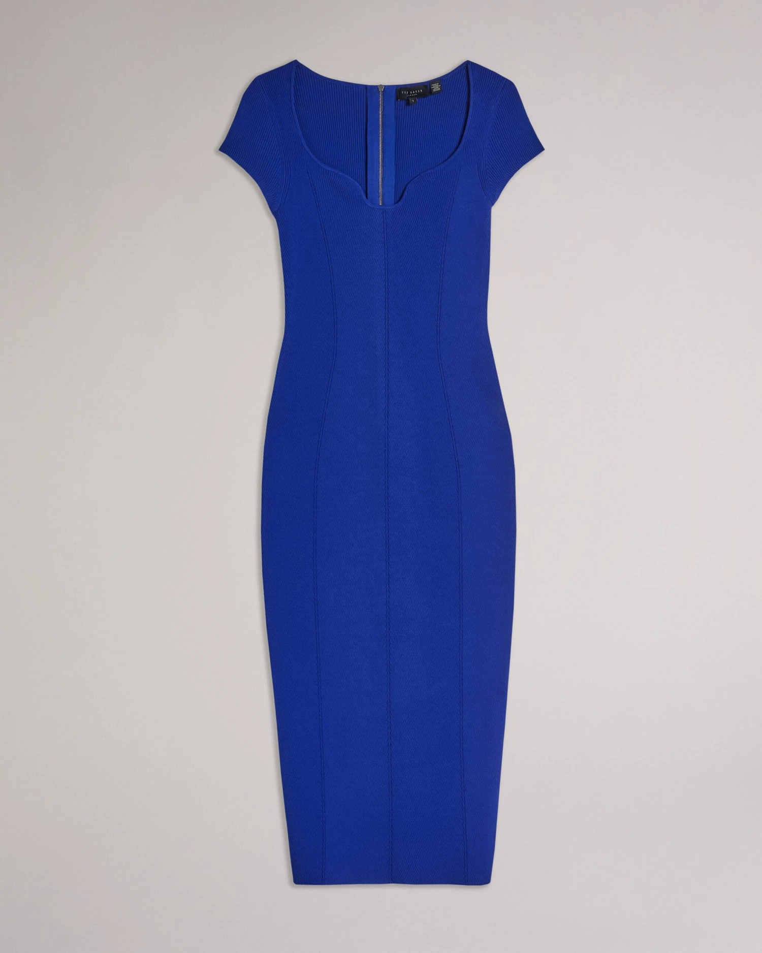 Midi bodycon dress Ribbed knit Stretch fabric Short sleeves Notched scoop neck Zip fastening Chae is 5’9.5″ / 1.77m and wears Blue in a Ted size 1