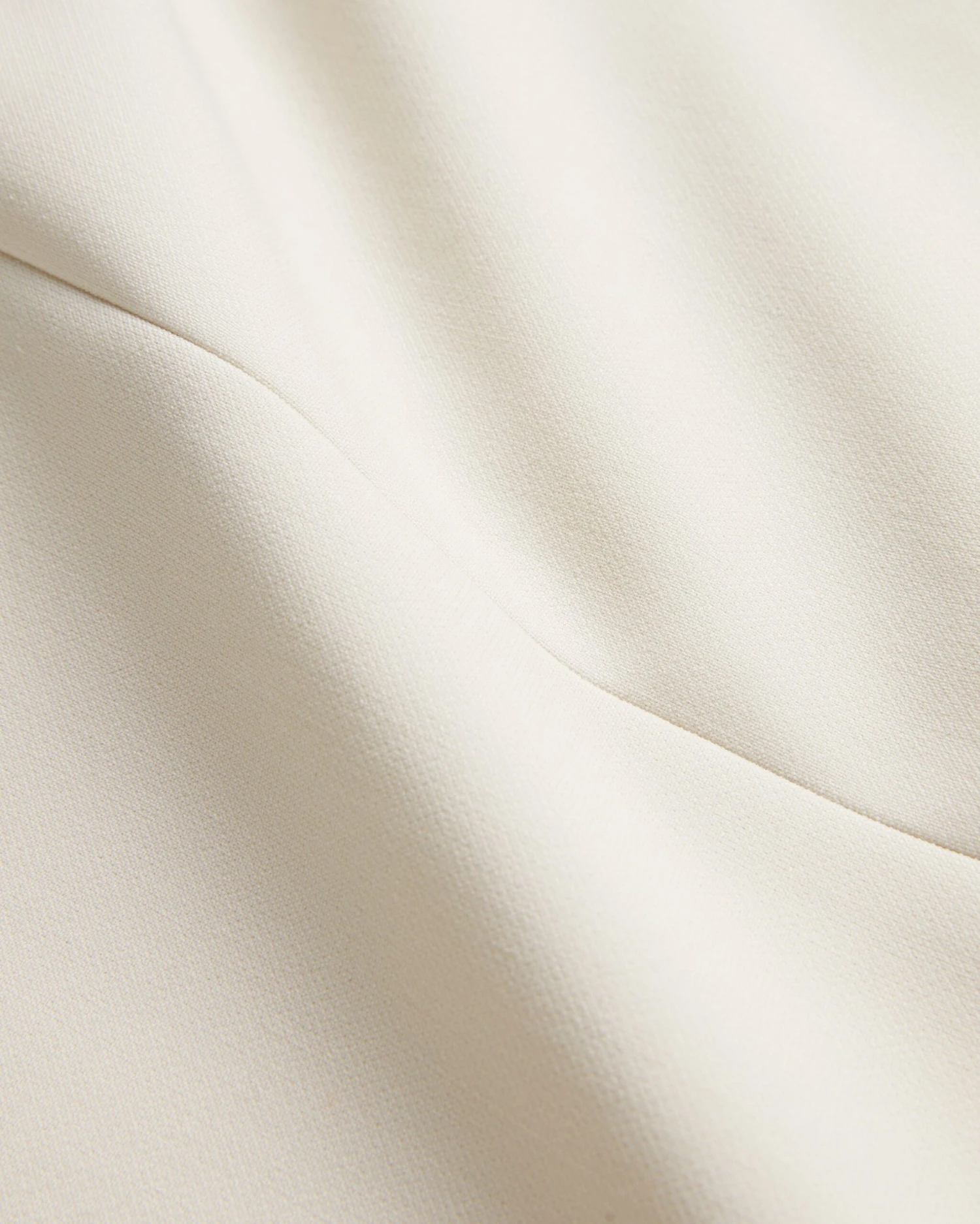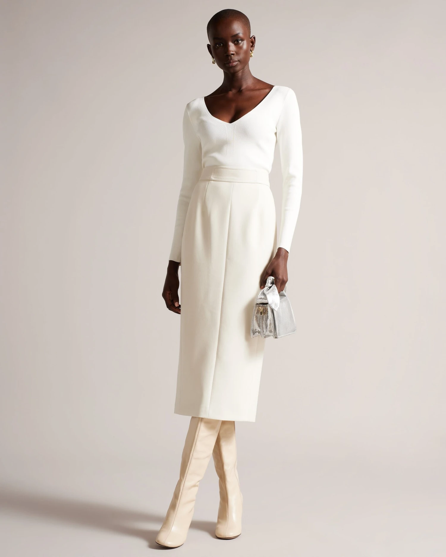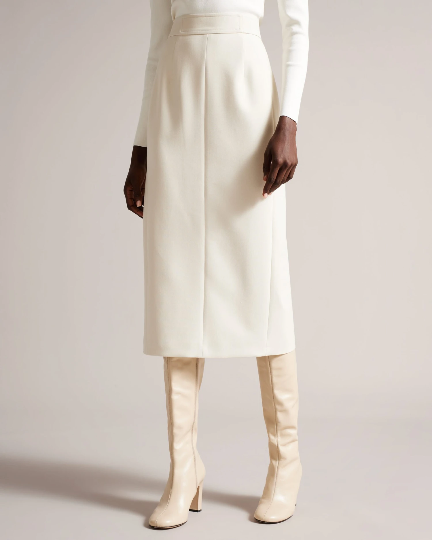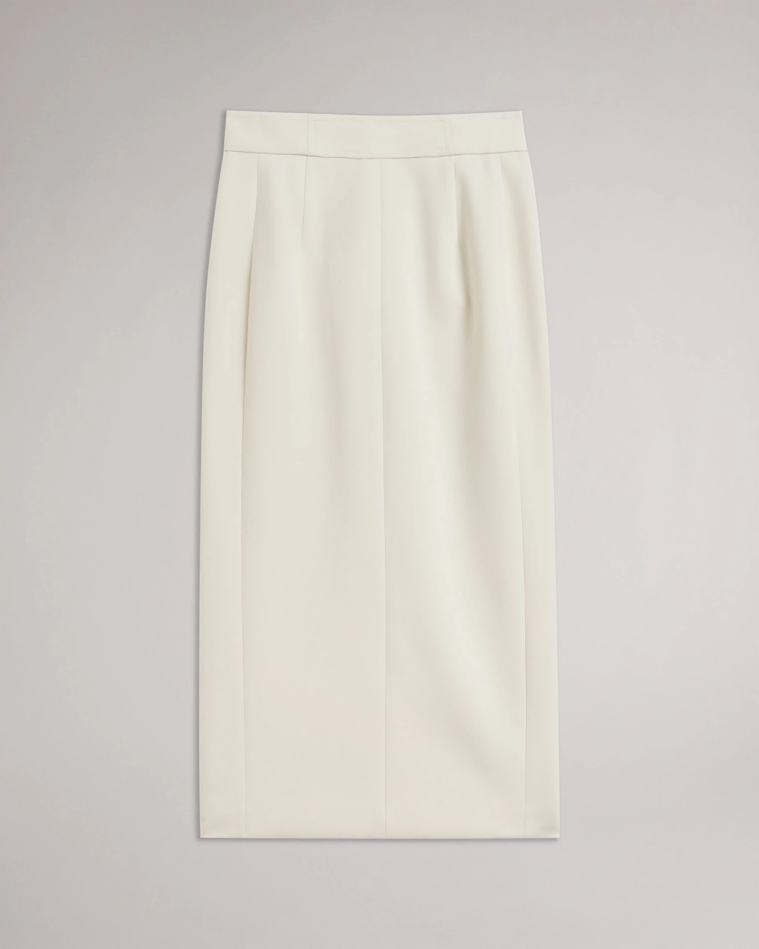 Pencil skirt Midi length Split back Tailored Zip fastening Awuoi is 5’10.5″ / 1.79m and wears Natural in a Ted size 1