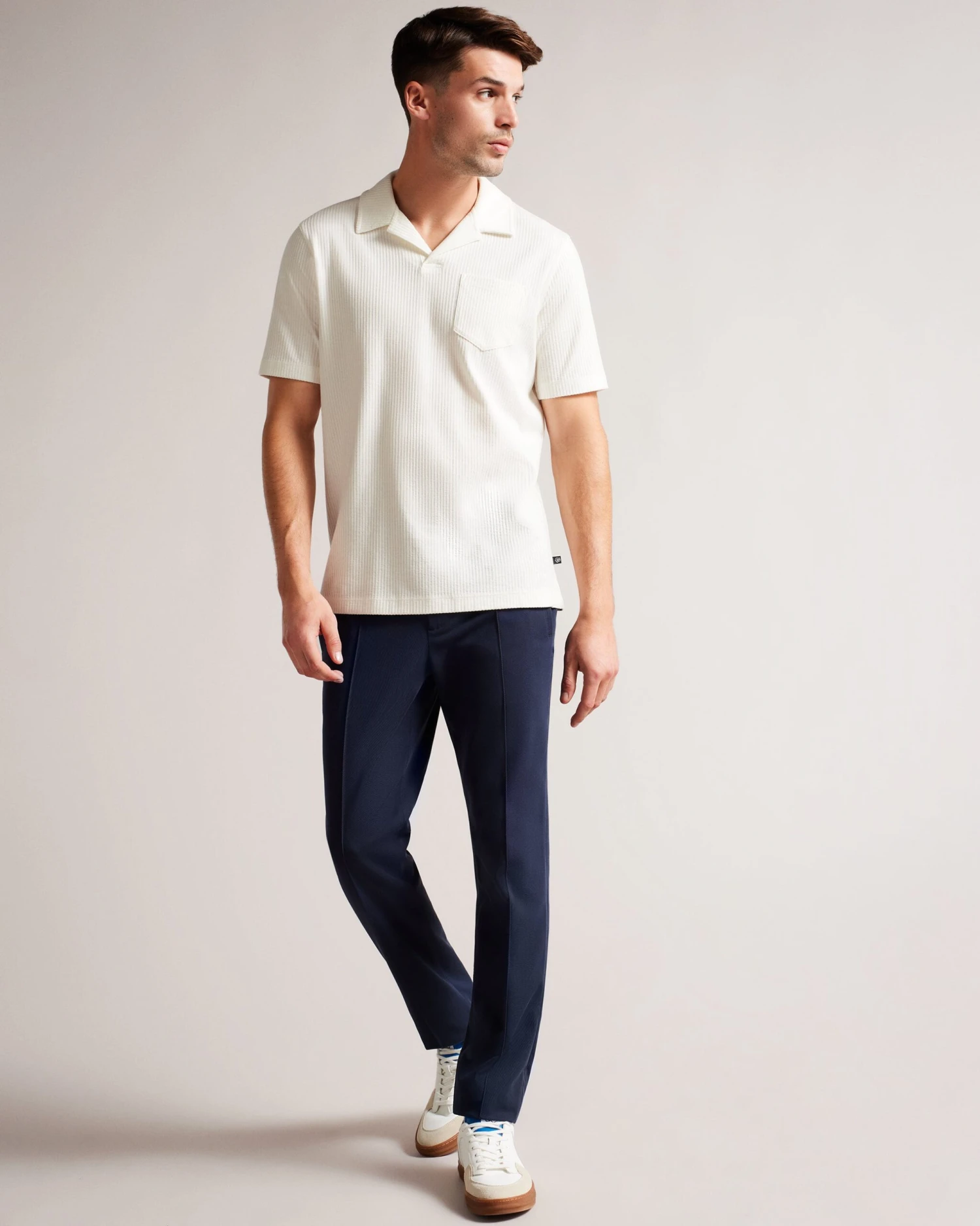 Polo shirt Open collar 100% cotton Short sleeved Stripe texture Chest pocket Regular fit O’Shea is 6’2.5″ / 1.89m and wears Navy in a Ted size 3