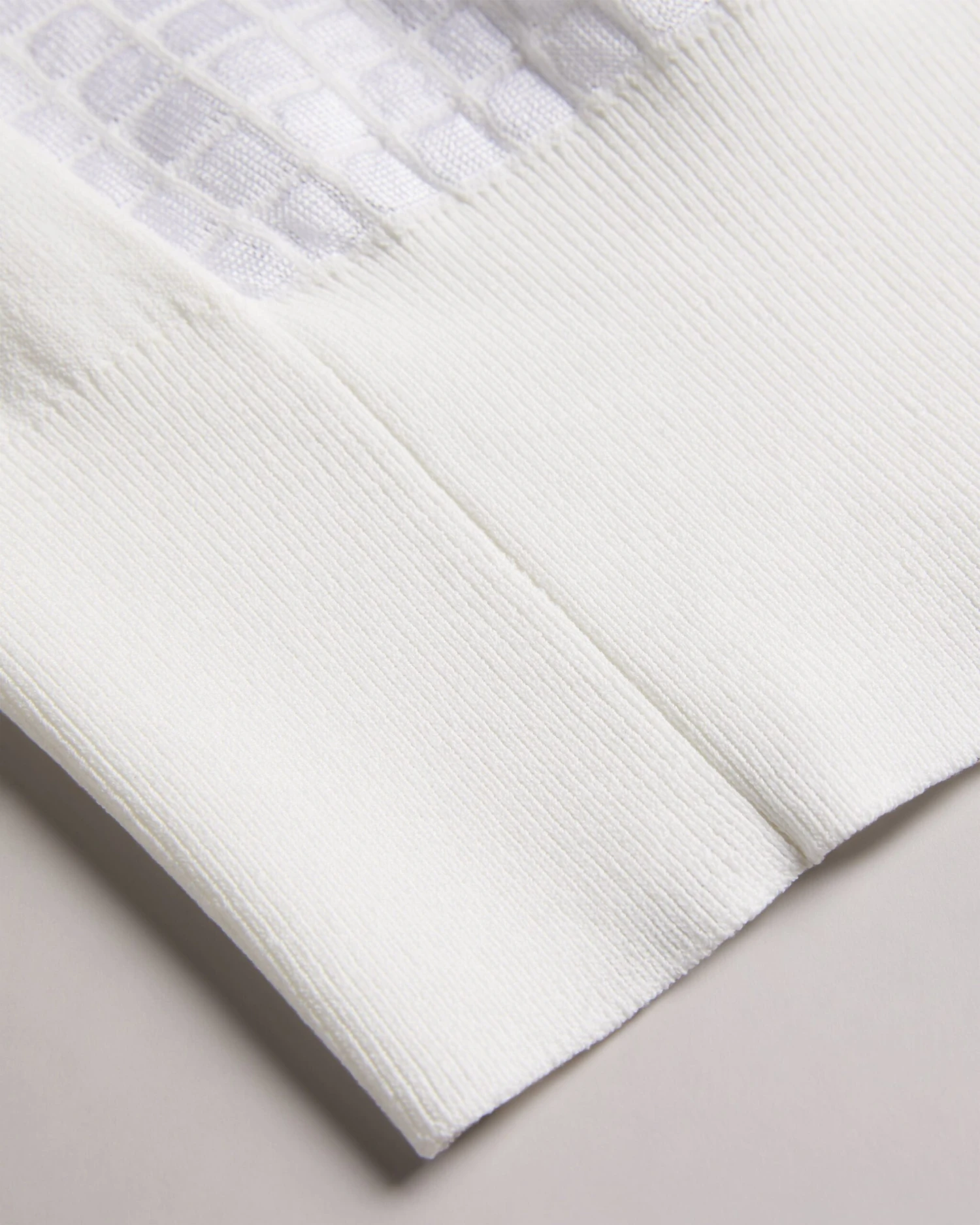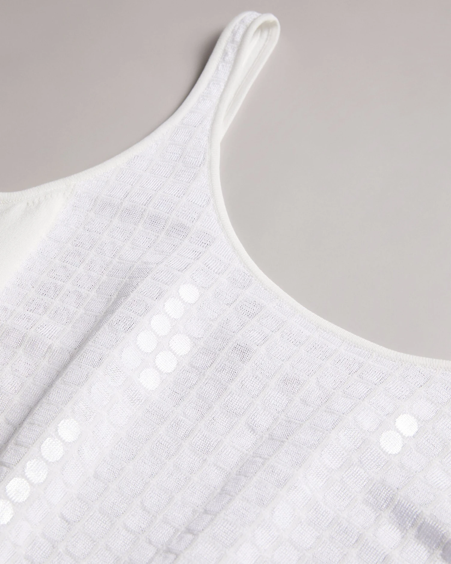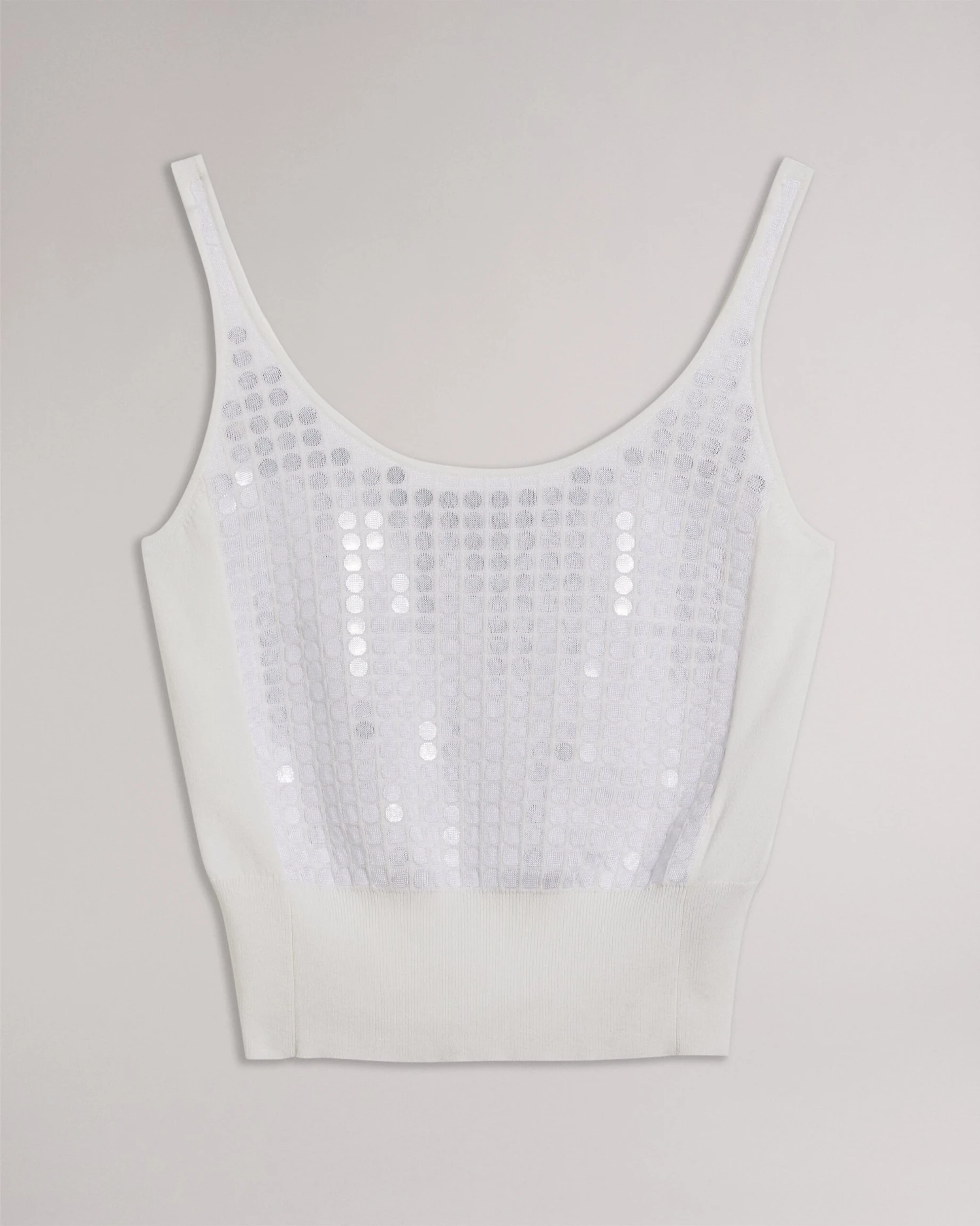 Knitted vestSequin embellishmentScoop neckLow backRibbed waistCropped fitJulia is 5’10” / 1.78m and wears White in a Ted size 1