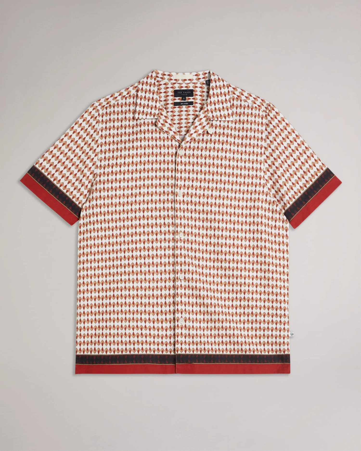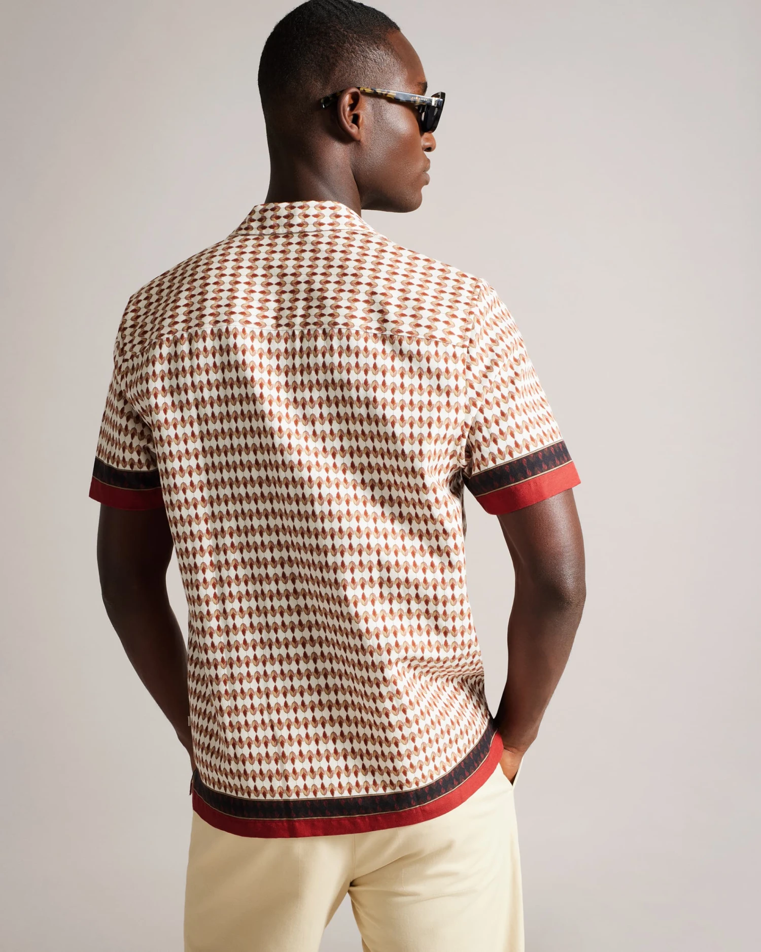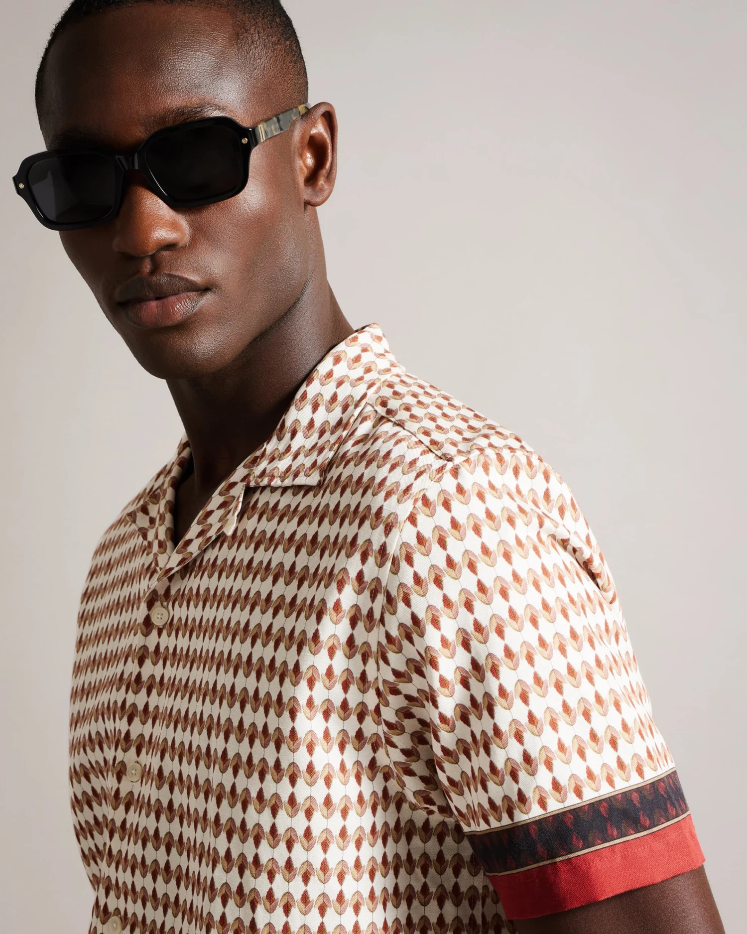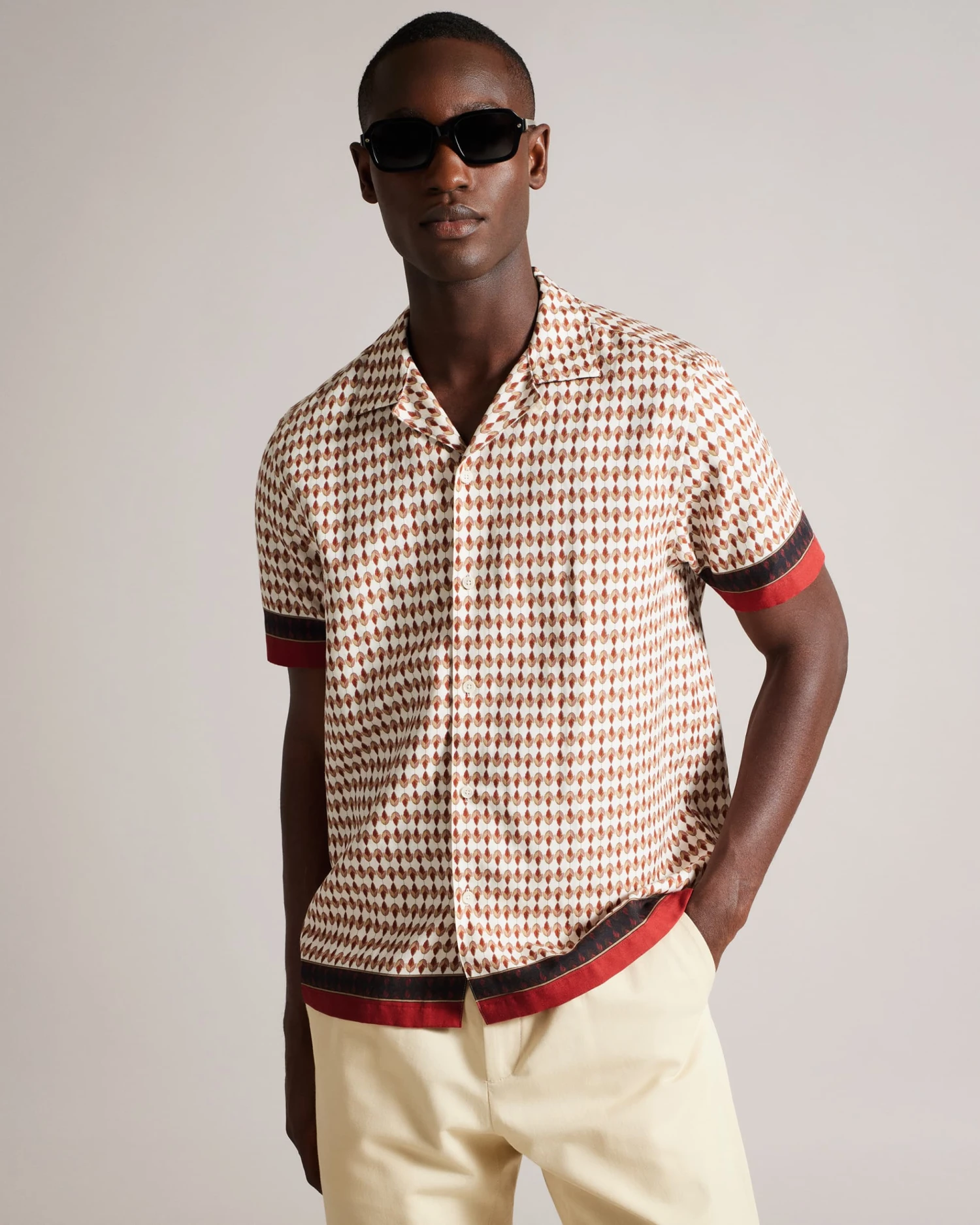 Upgrade your summer style with our BRAEMAR button-up shirt, crafted from a premium blend of lyocell, linen and cotton. Featuring a bold geometric print with contrasting borders and a trendy revere collar, this short-sleeved shirt is perfect for both casual and formal occasions.