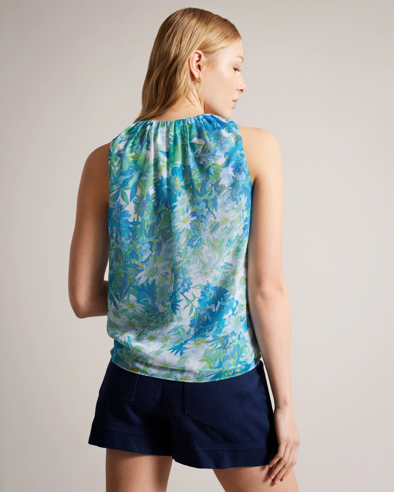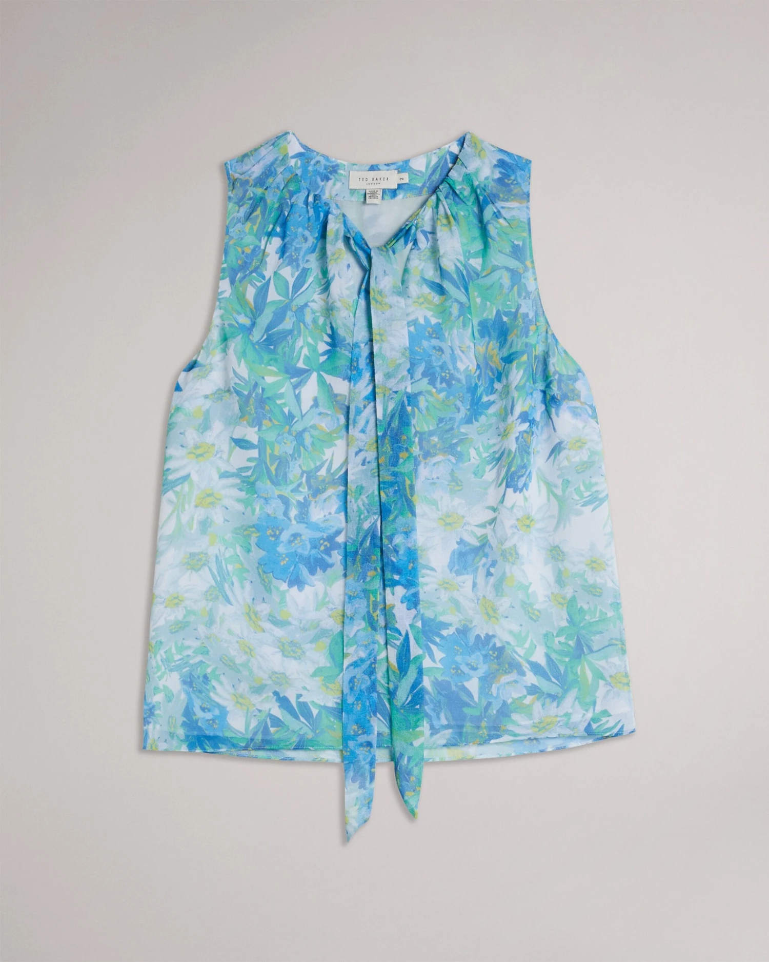 Sleeveless top Floral print Neck tie Gathered neckline Jara is 5’10.5″ / 1.79cm and wears White in a Ted size 1