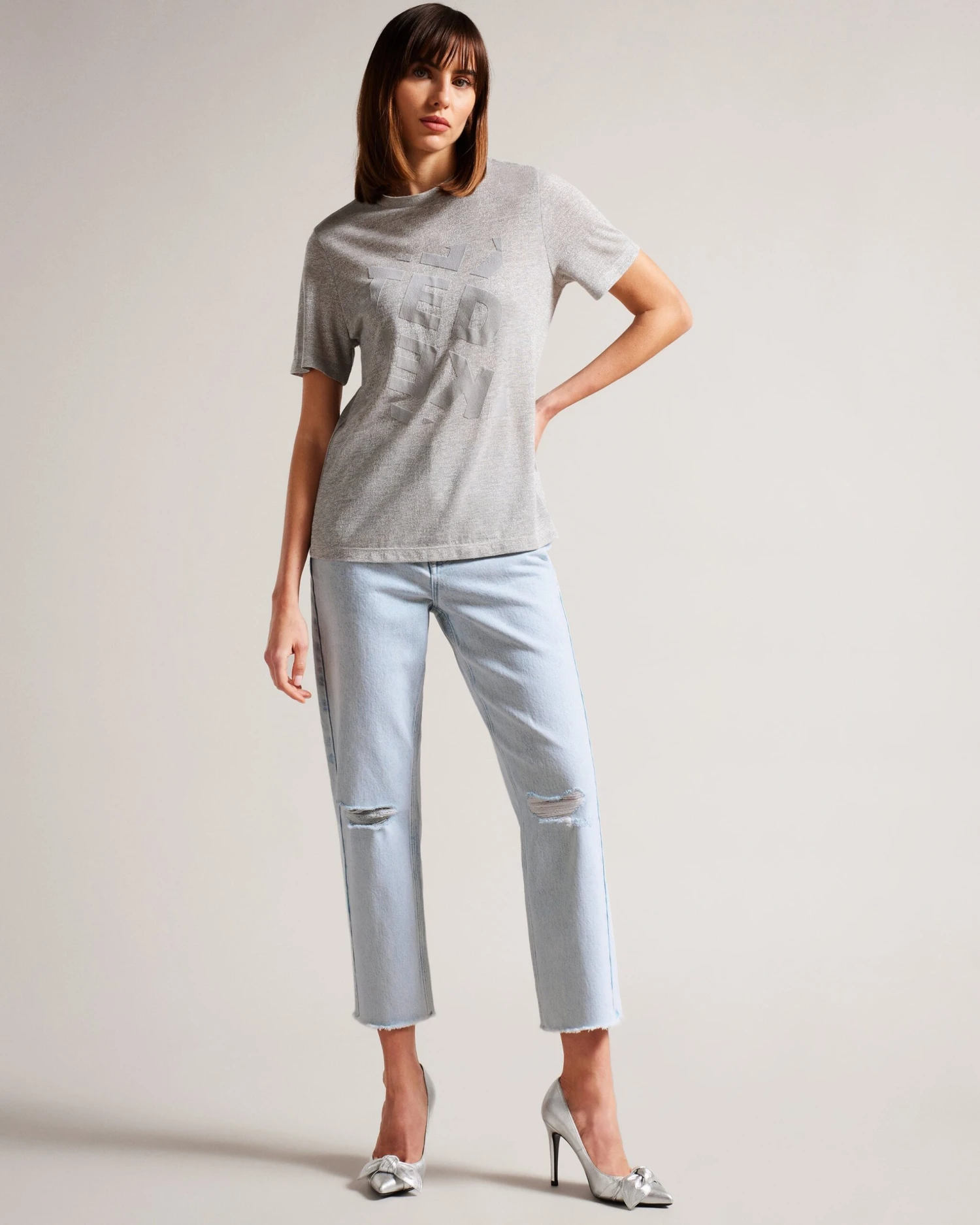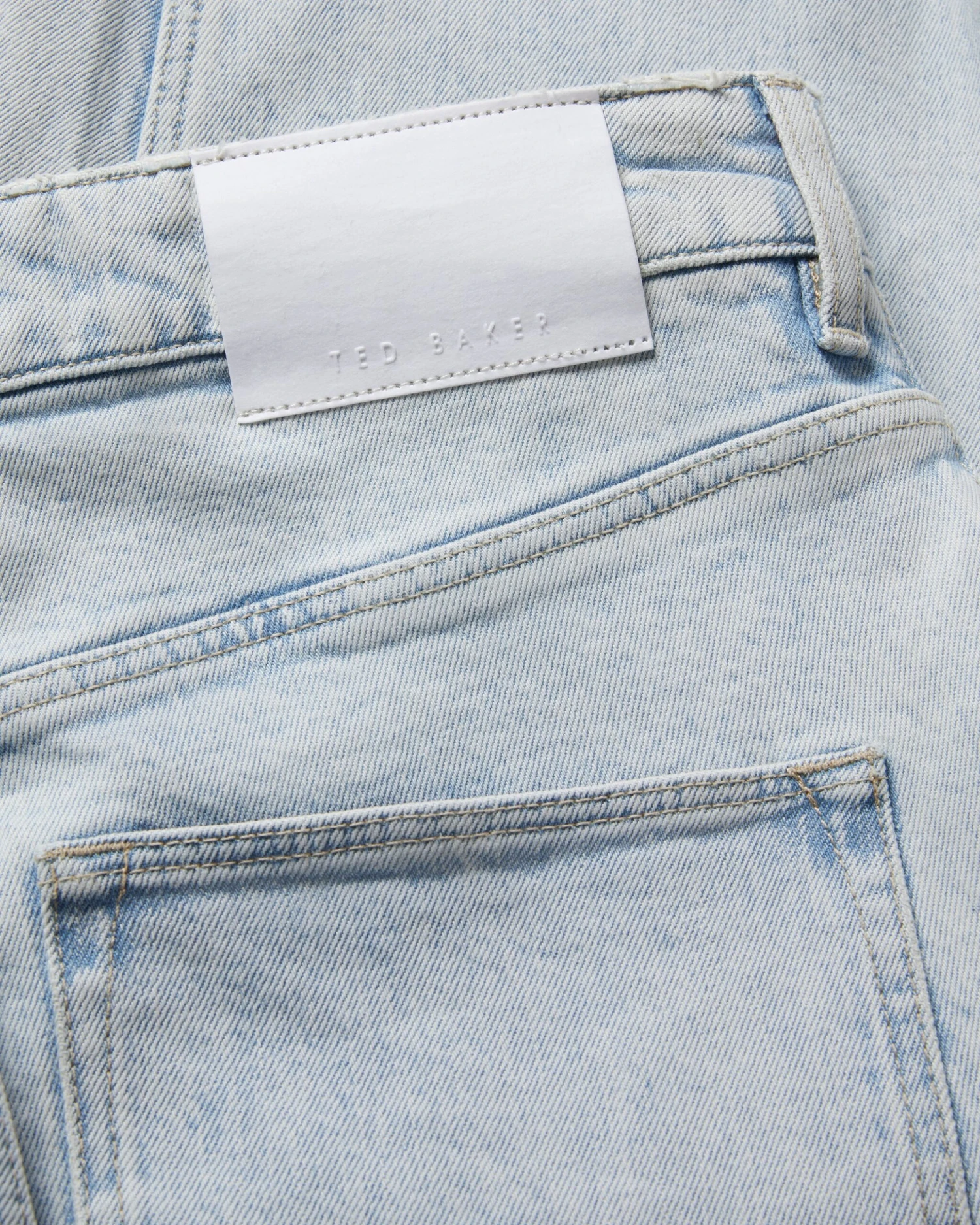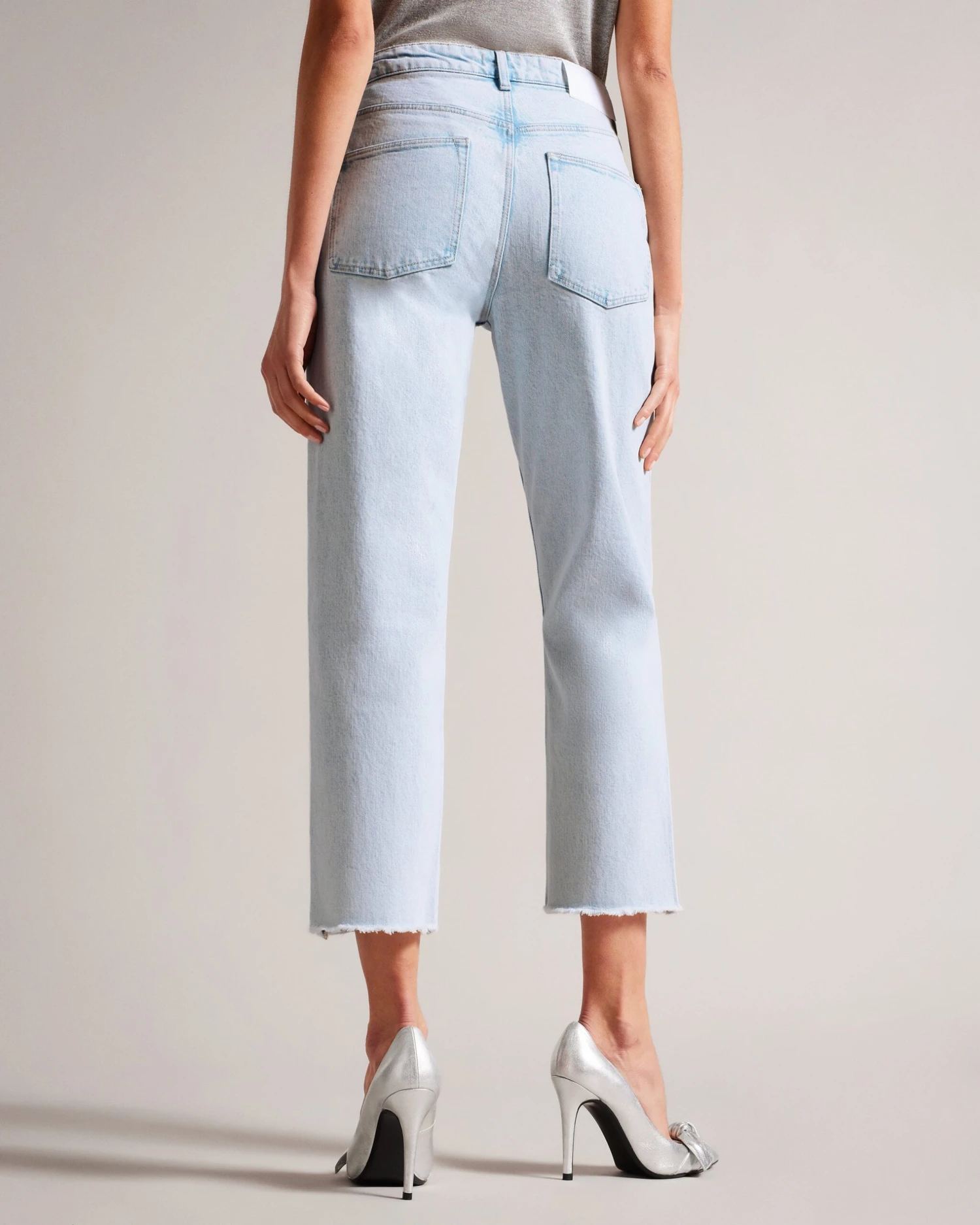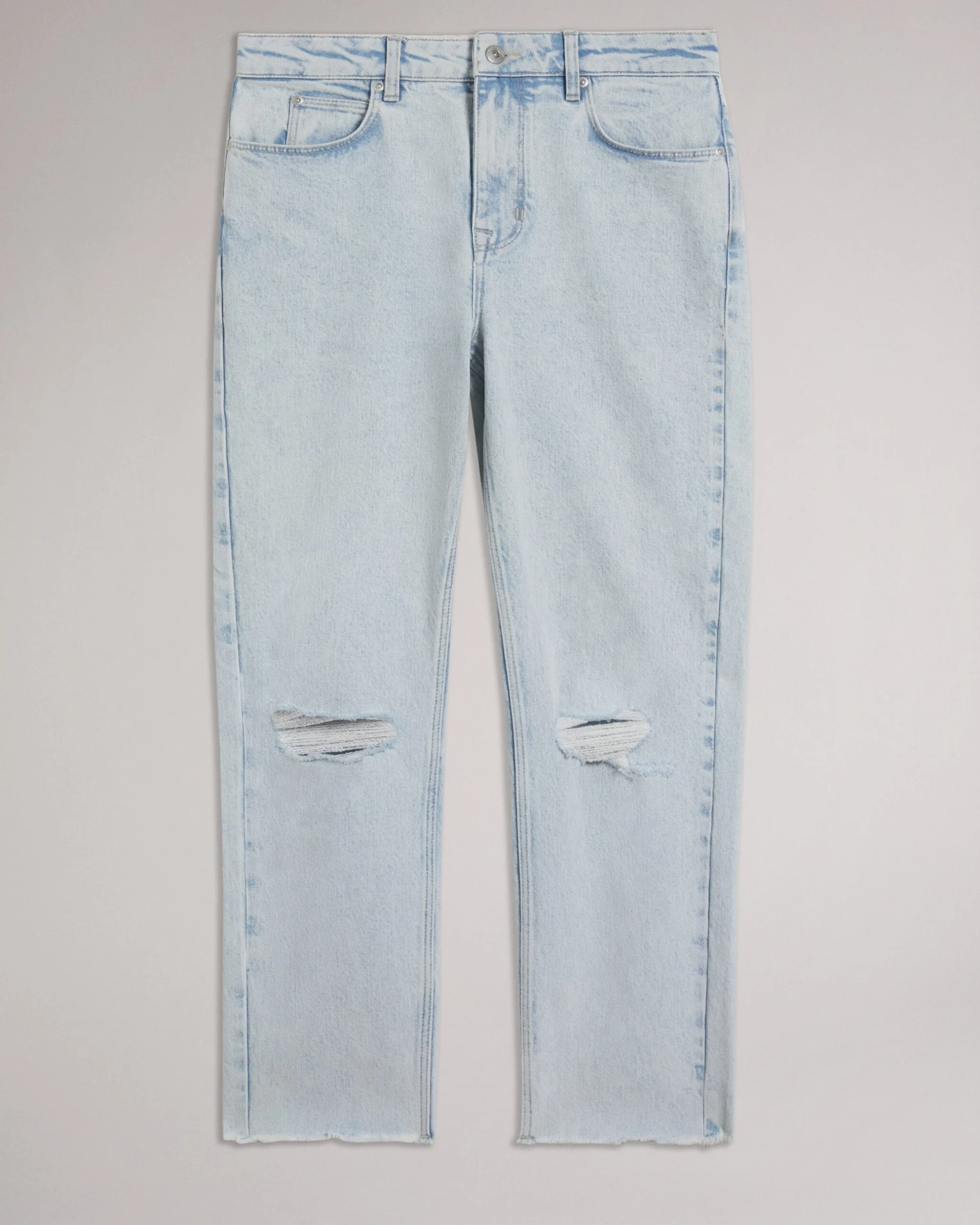 Jeans Straight leg Ankle grazer length Mid rise Ripped knees Raw hem Belt loops Julia is 5’10” / 1.78m and wears Light Wash in 25″
