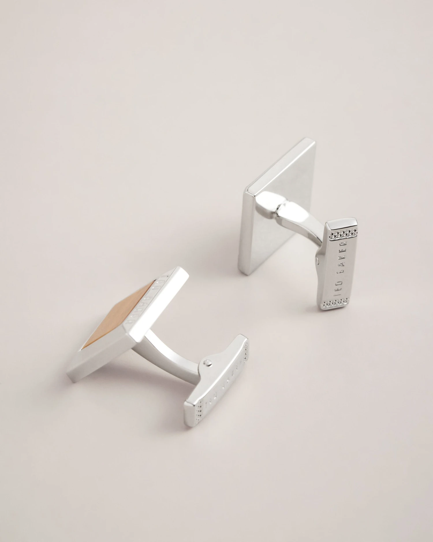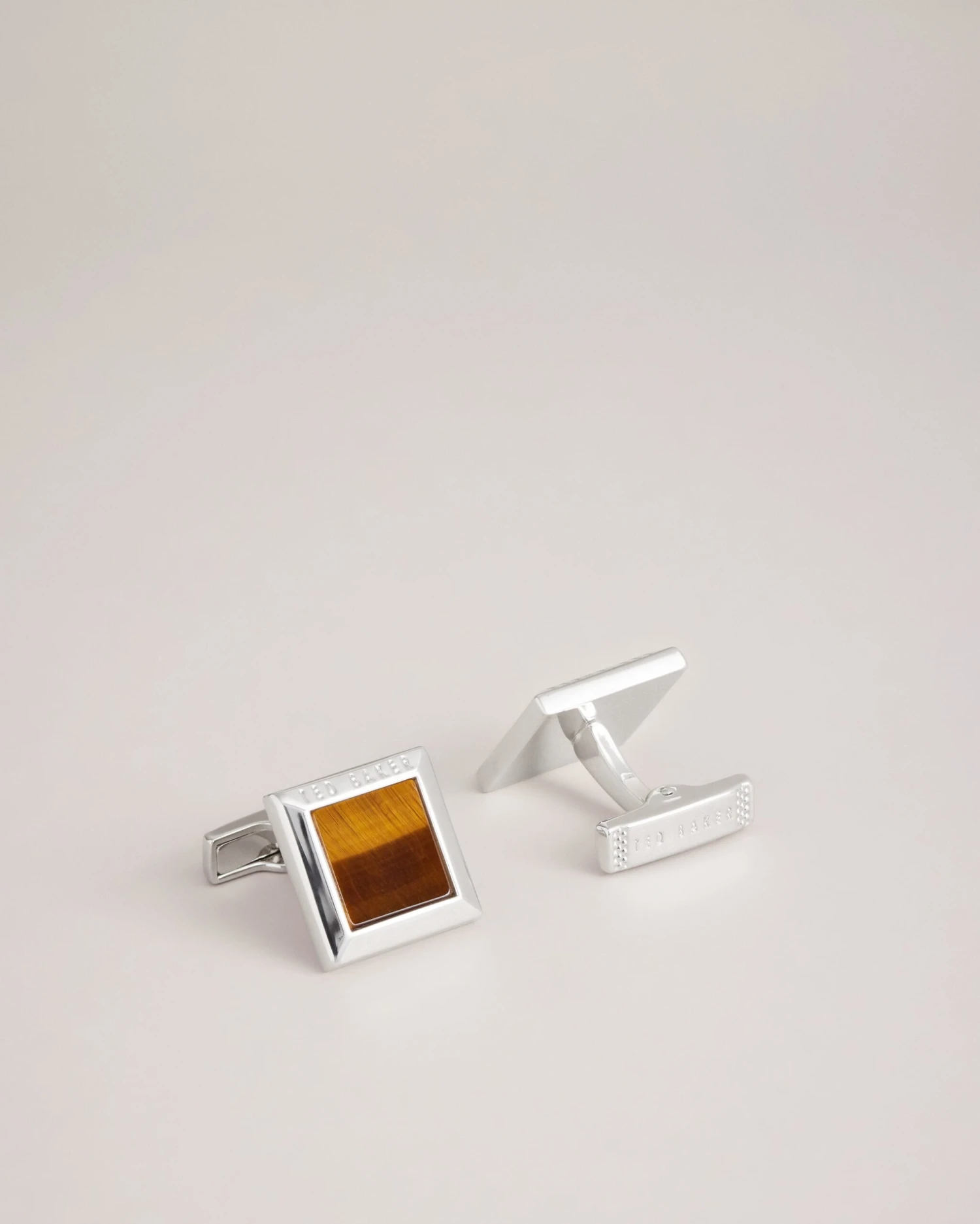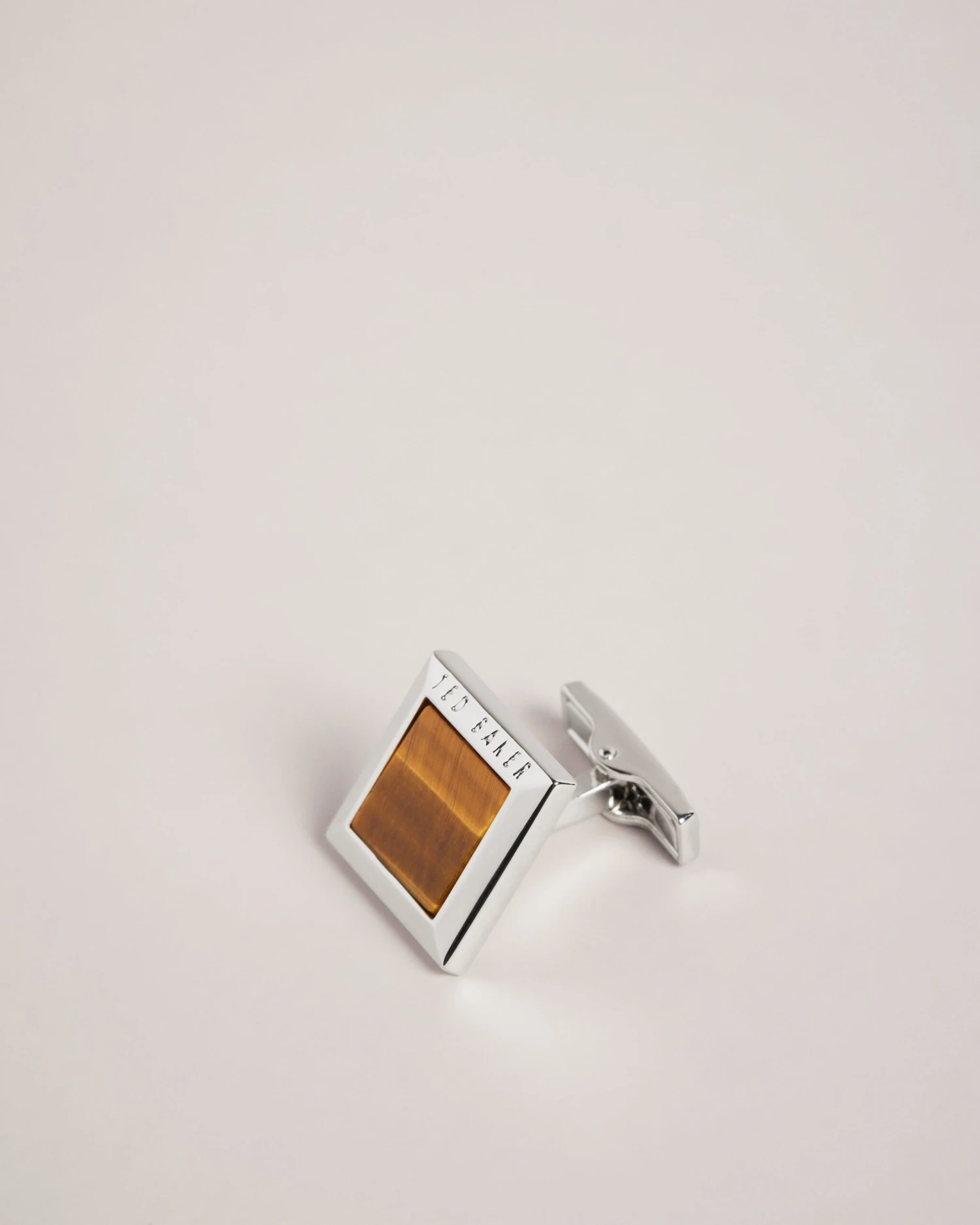 Square cufflinks Tiger’s eye stone Metal hardware Engraved logo Comes in Ted Baker branded gift box