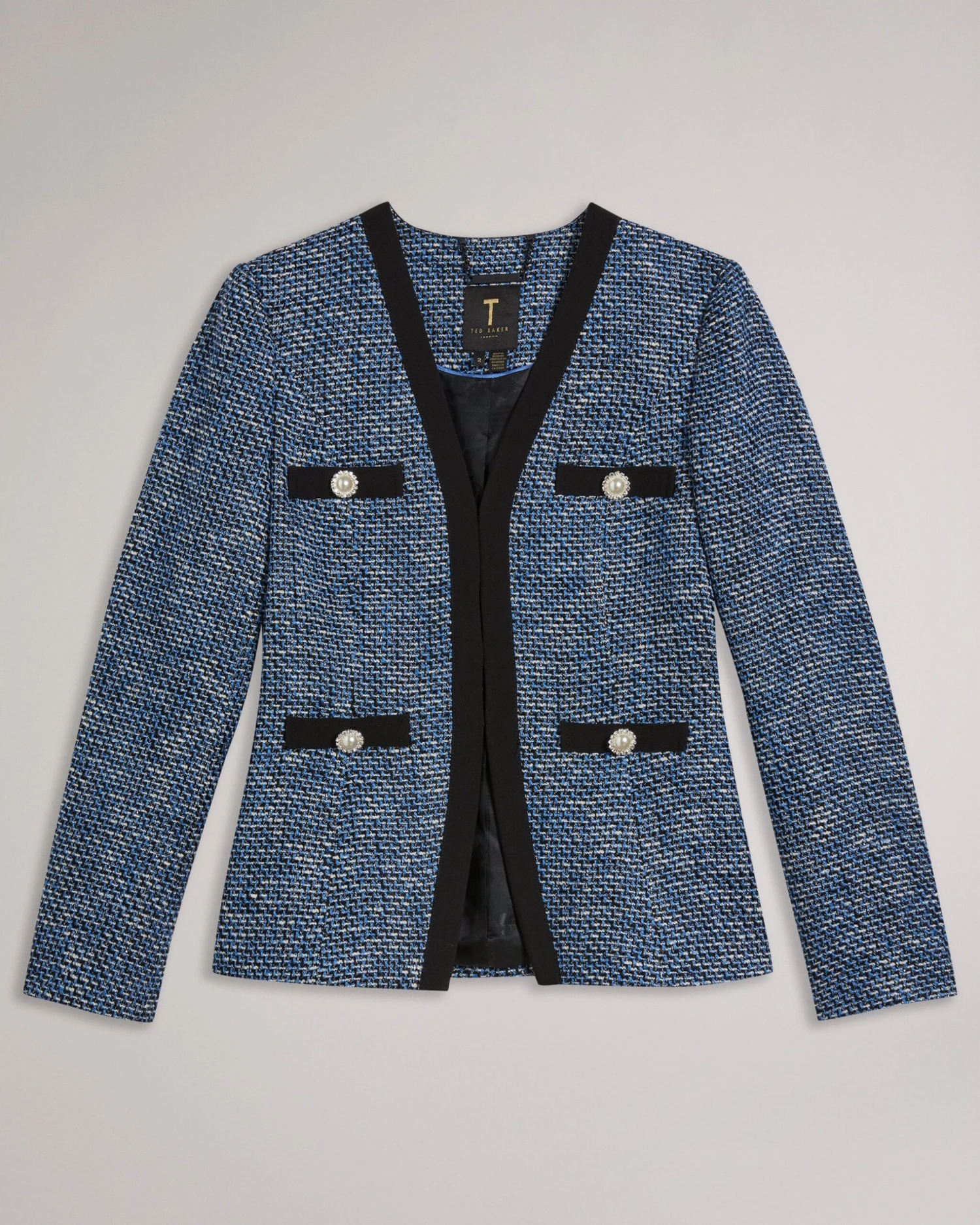 Jacket Boucle texture V-neck Check pockets Contrast details Slim fit Hook fastening Matching dress available Julia is 5’10” / 1.78m and wears Dark Navy in a Ted size 1