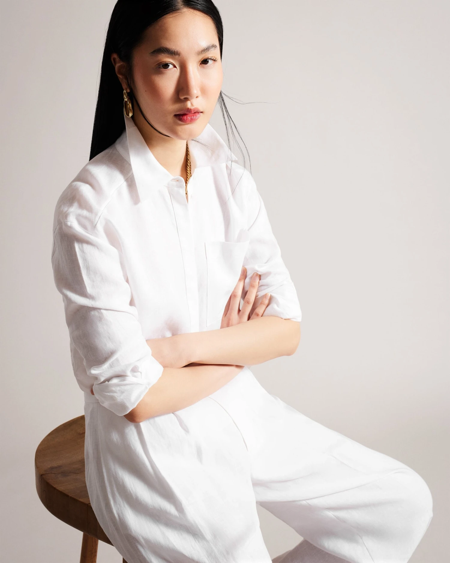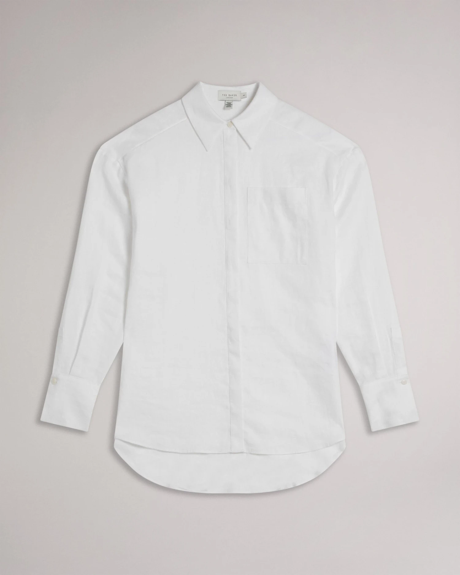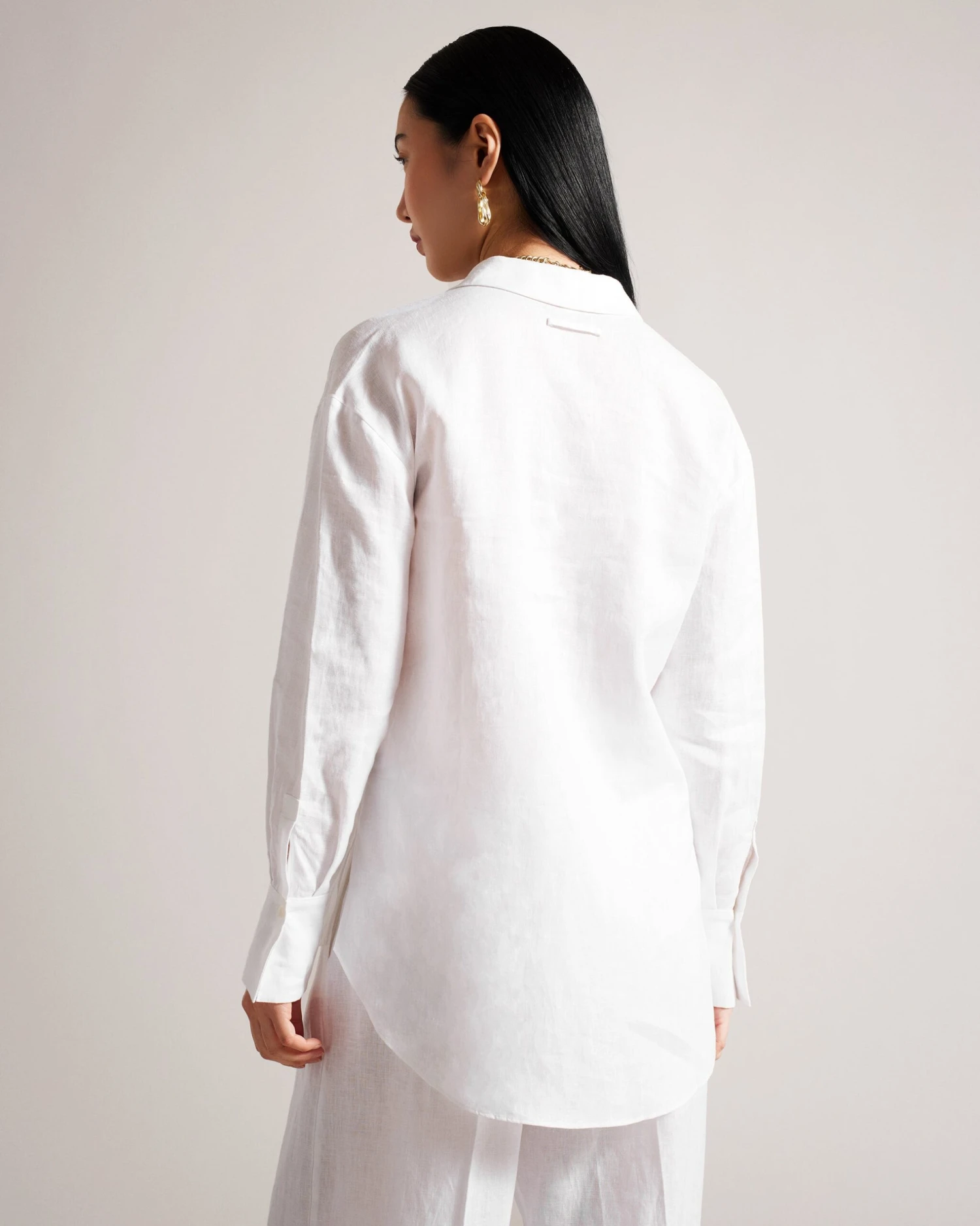 Longline shirt 100% linen Long sleeves Button up front Classic collar Chest pocket Cuffed sleeves Chae is 5’9.5″ / 1.77m and wears White in a Ted size 1