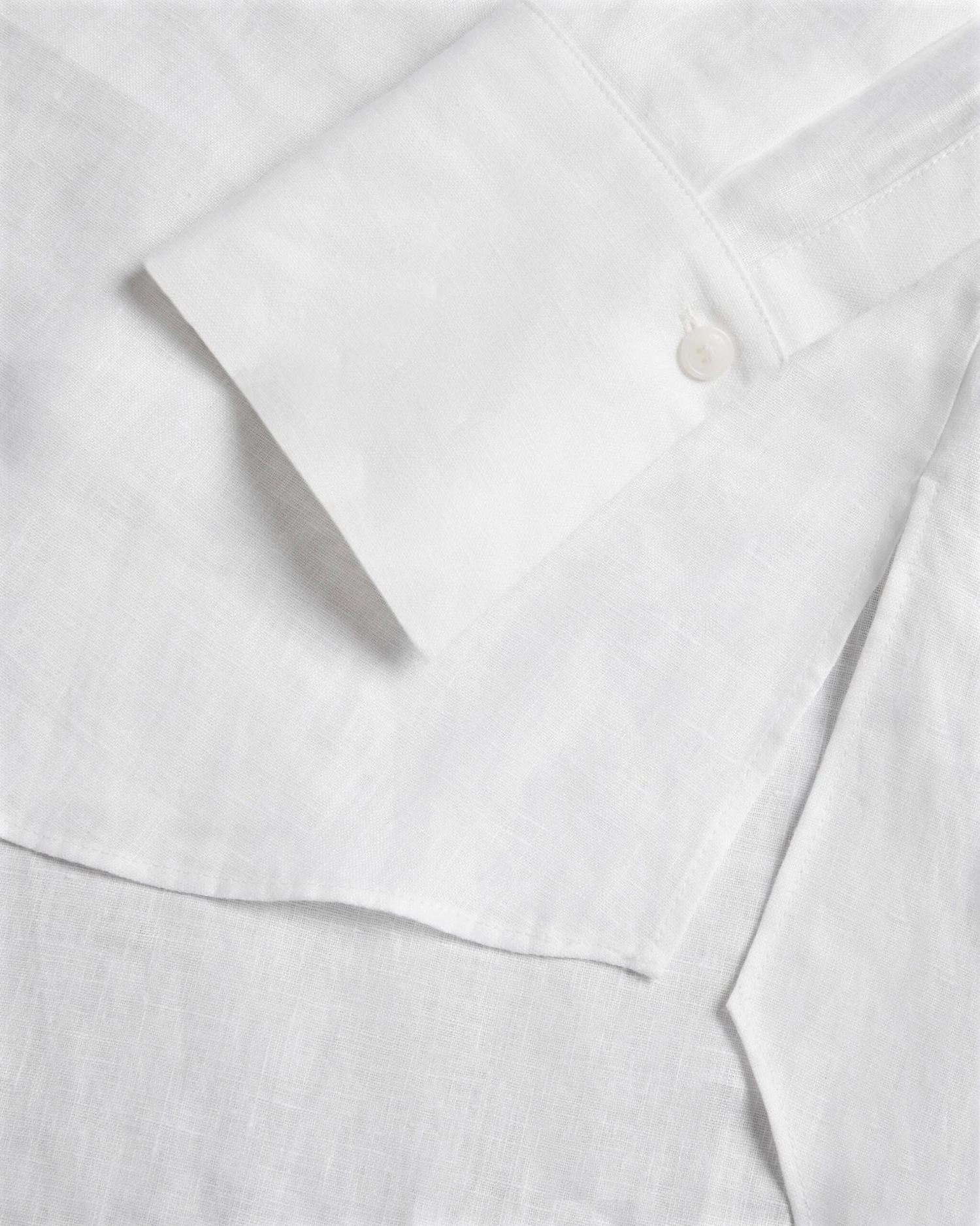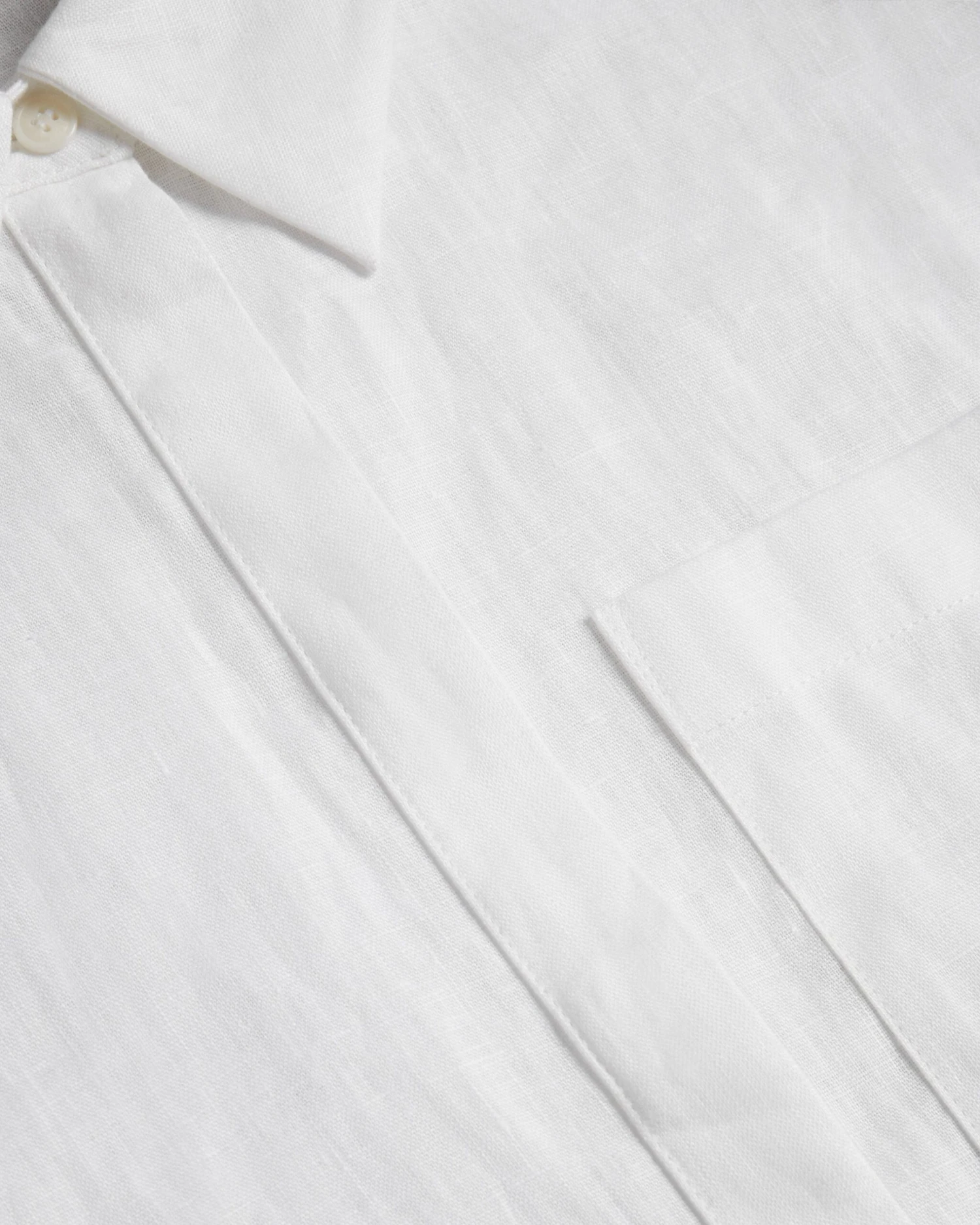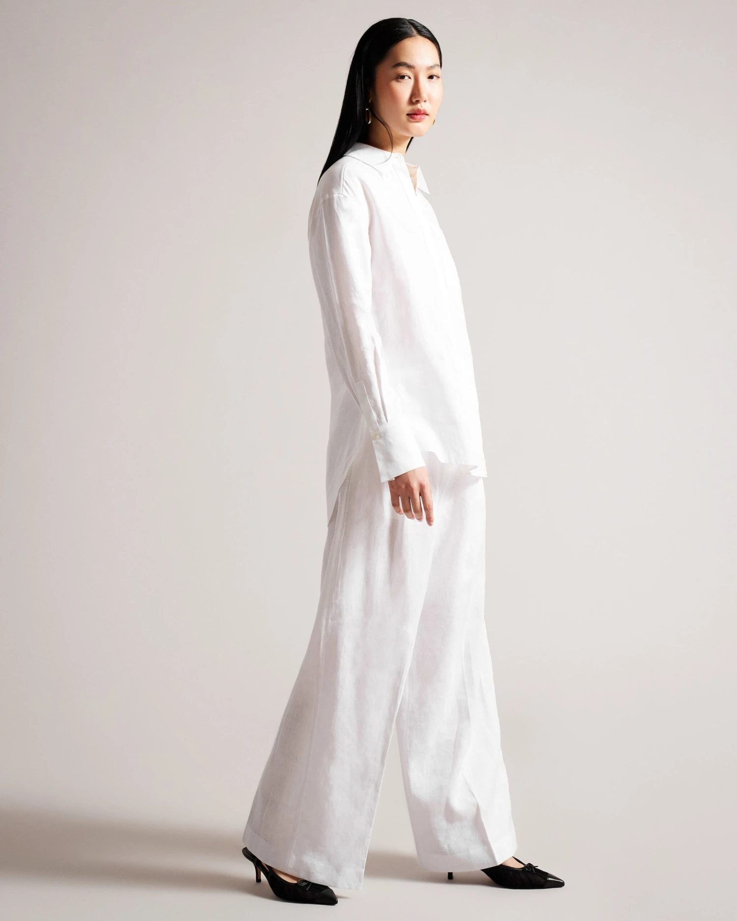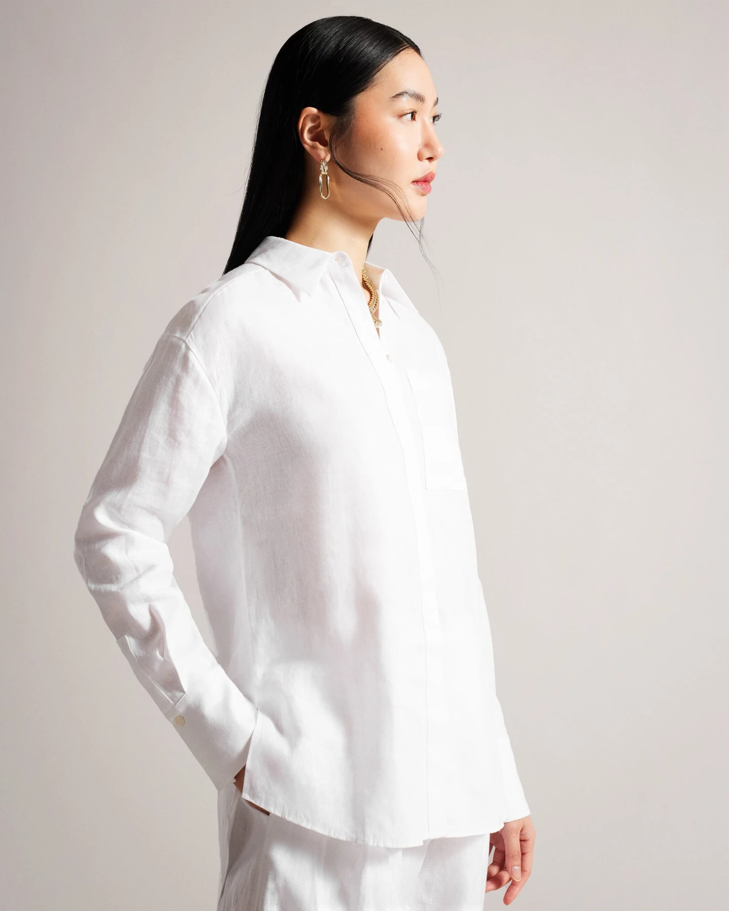 Longline shirt 100% linen Long sleeves Button up front Classic collar Chest pocket Cuffed sleeves Chae is 5’9.5″ / 1.77m and wears White in a Ted size 1