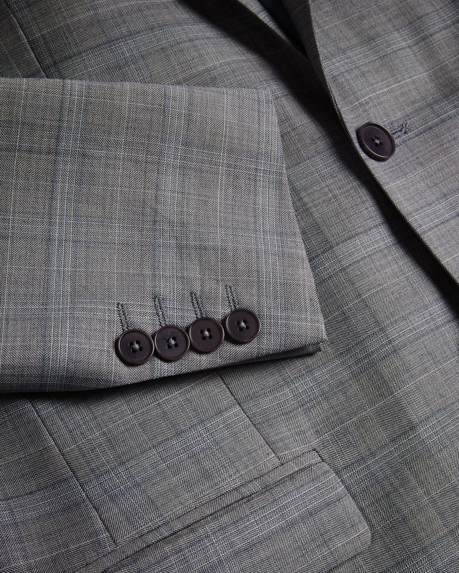 Suit jacket Wool blend Check pattern Notched lapel Magnolia lapel pin Single breasted buttons Pockets Pranav is 6’1″ / 1.85m and wears Grey in 38 R