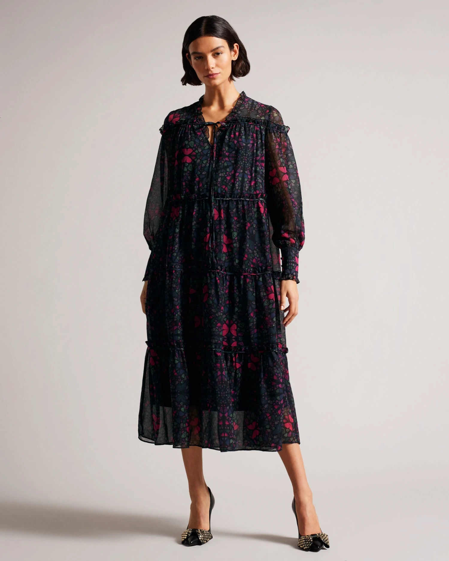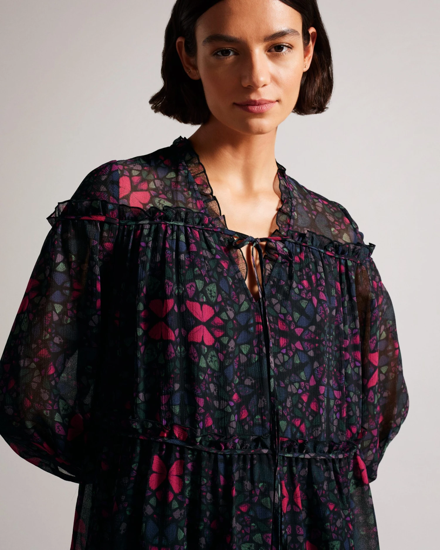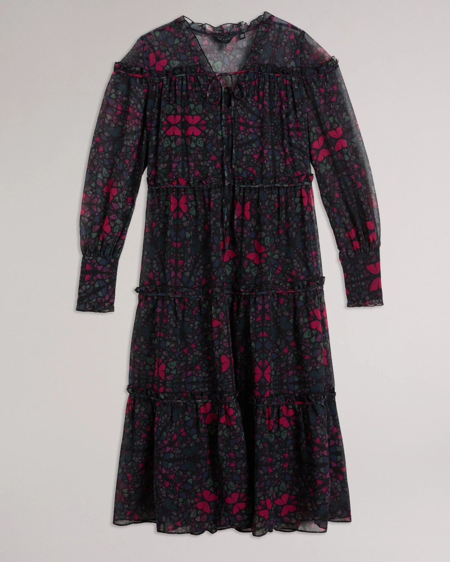 Make an entrance in ELLYAH. A floaty tieres dress with subtle ruffles and our kaleidoscope buttefly print all over, this ethereal maxi will wow at the bar, the park or at festive events.