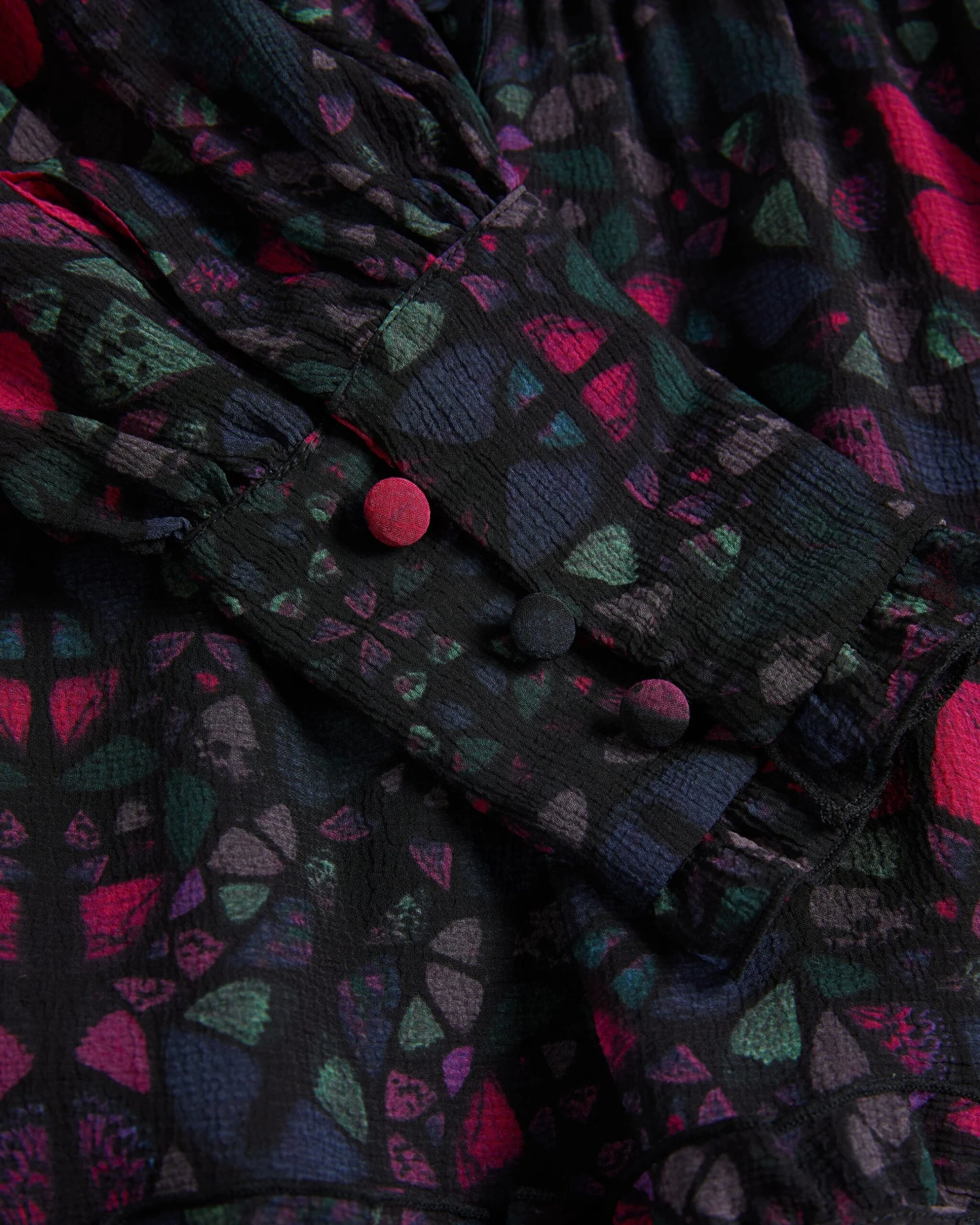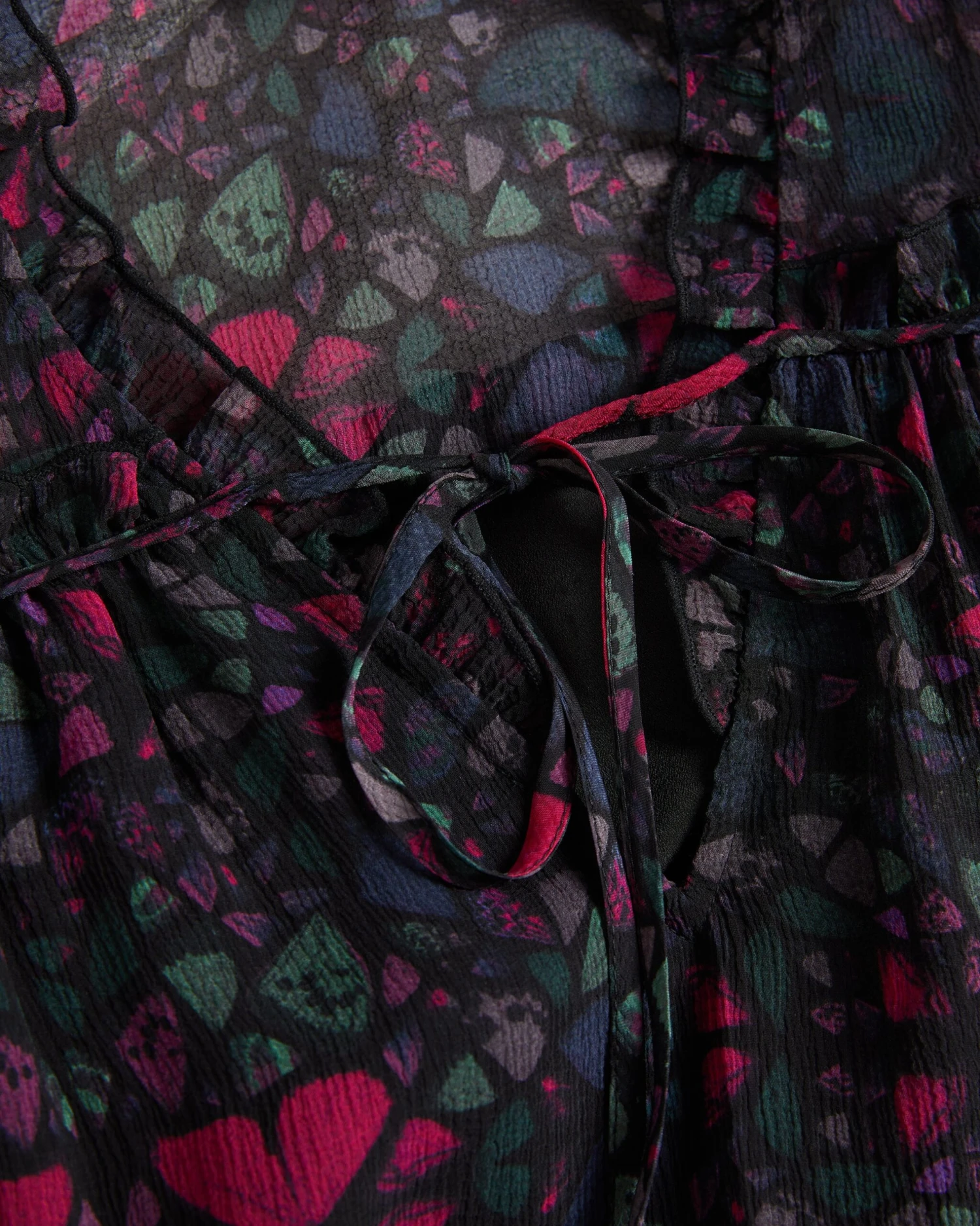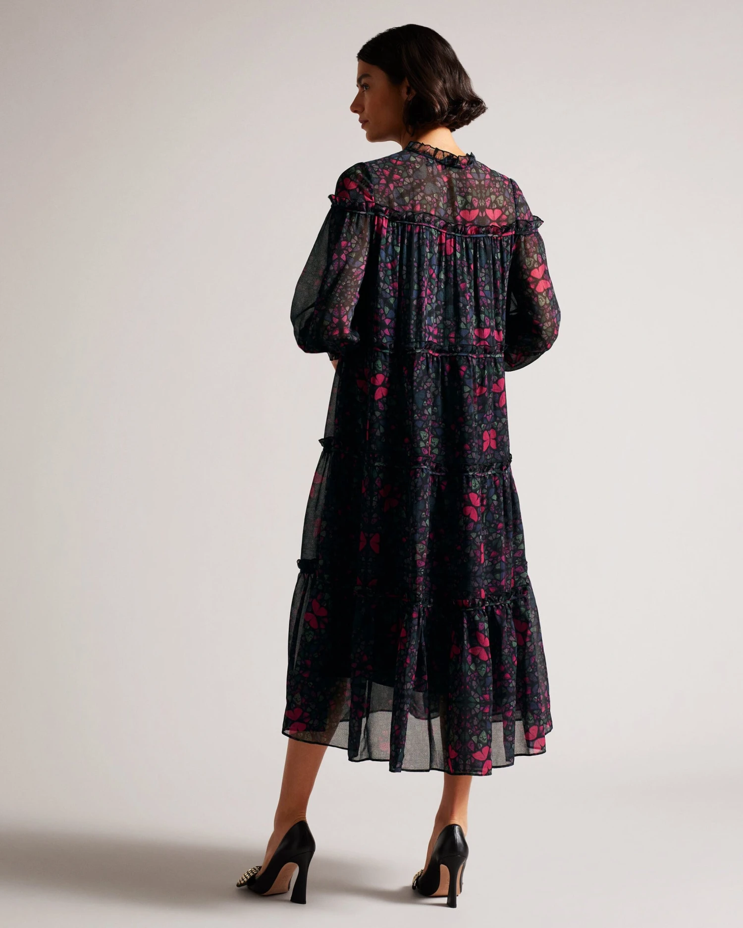 Make an entrance in ELLYAH. A floaty tieres dress with subtle ruffles and our kaleidoscope buttefly print all over, this ethereal maxi will wow at the bar, the park or at festive events.