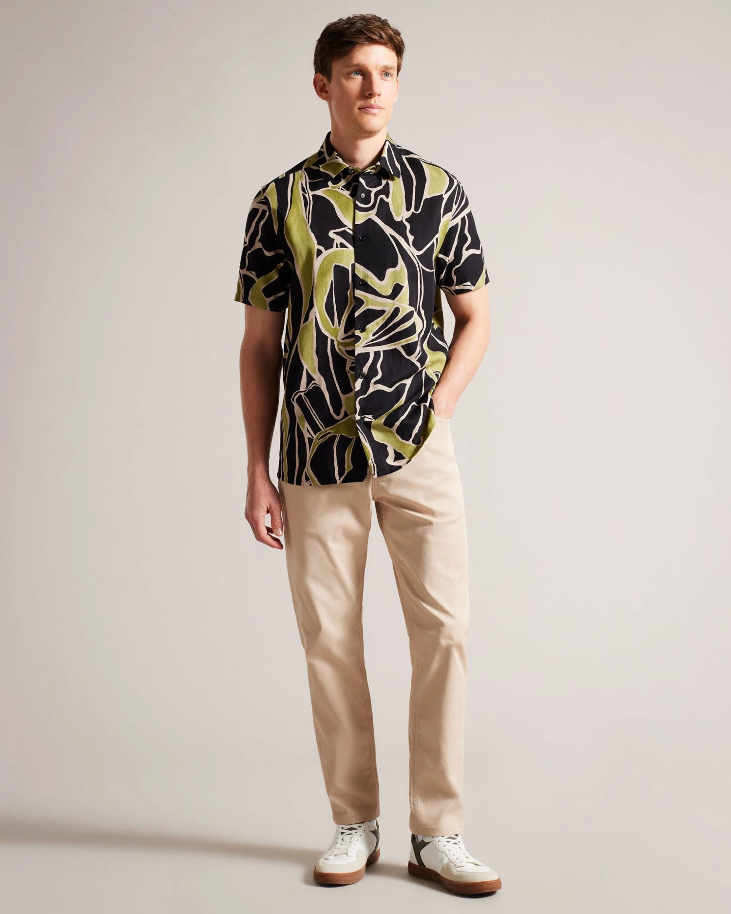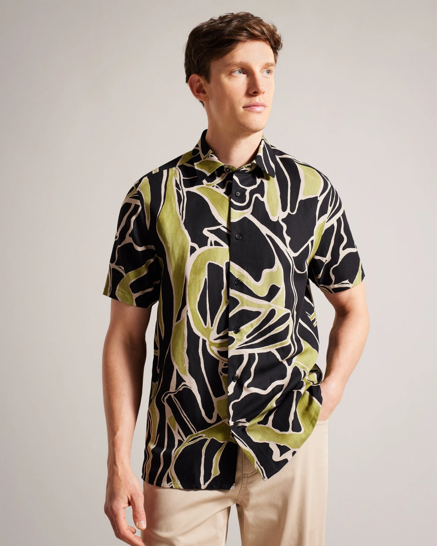 Button up shirt Short sleeved Classic collar Abstract print Lyocell, linen and cotton