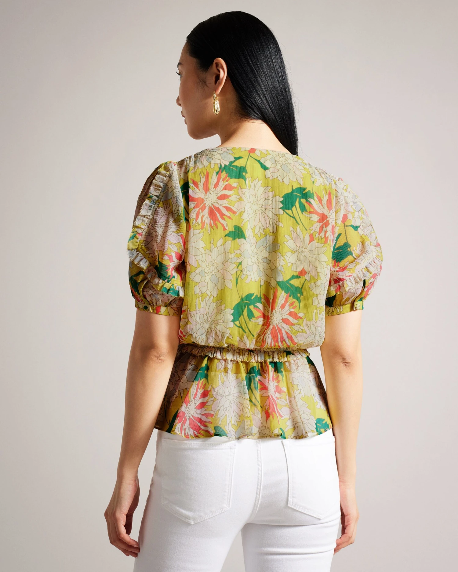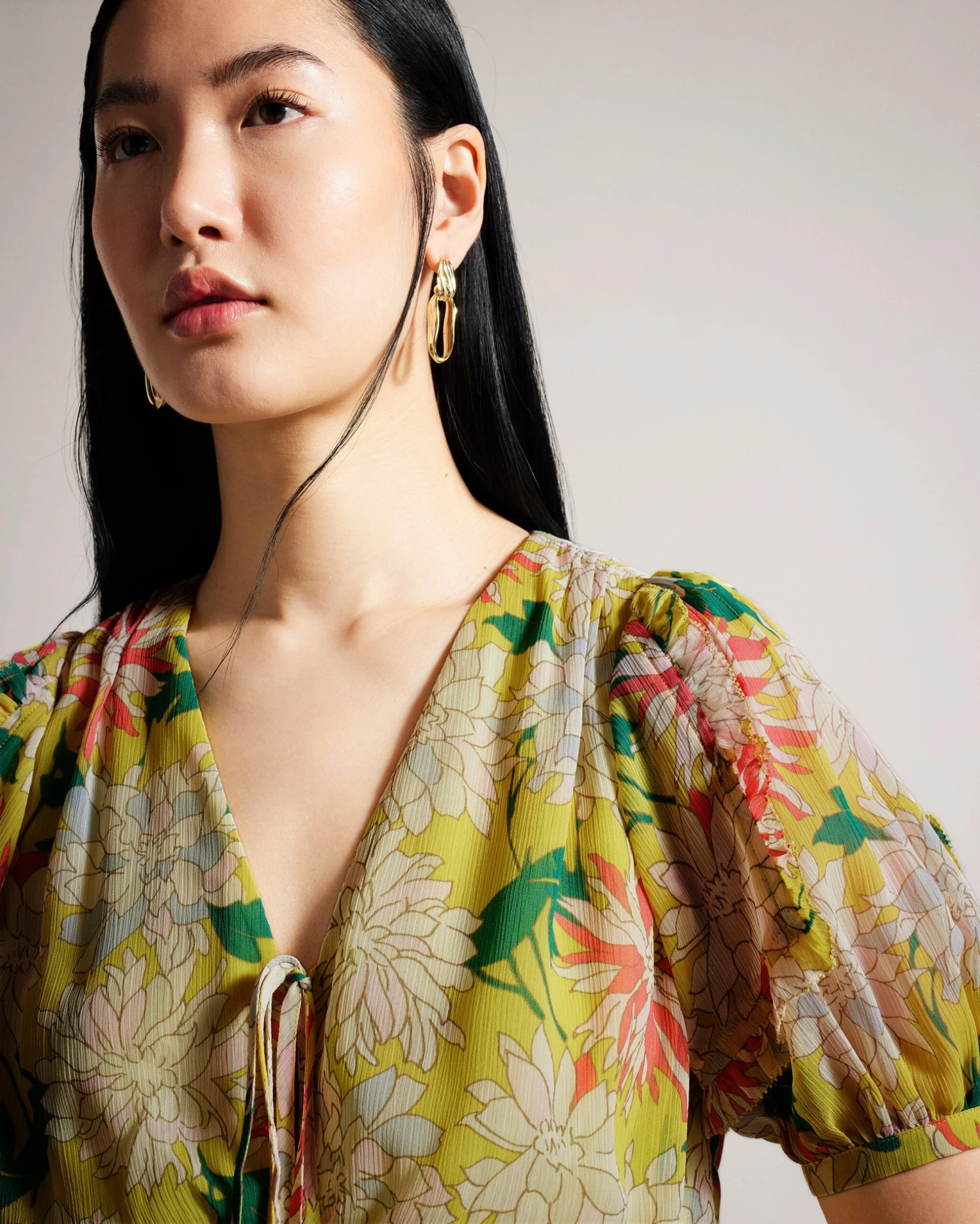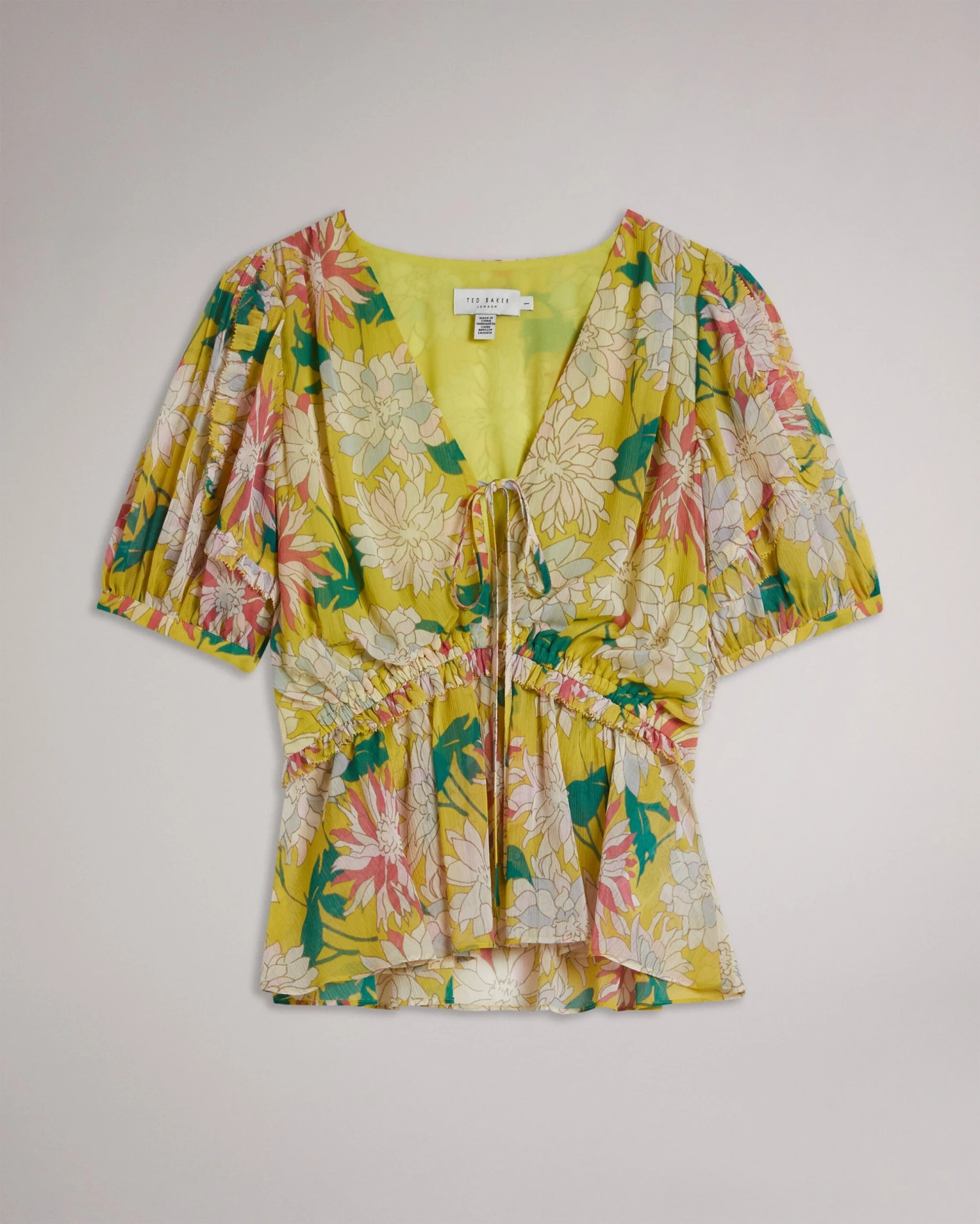Short sleeved top Puff sleeves Elasticated waist Ruffle details Tie front V-neck Chrysanthemum print