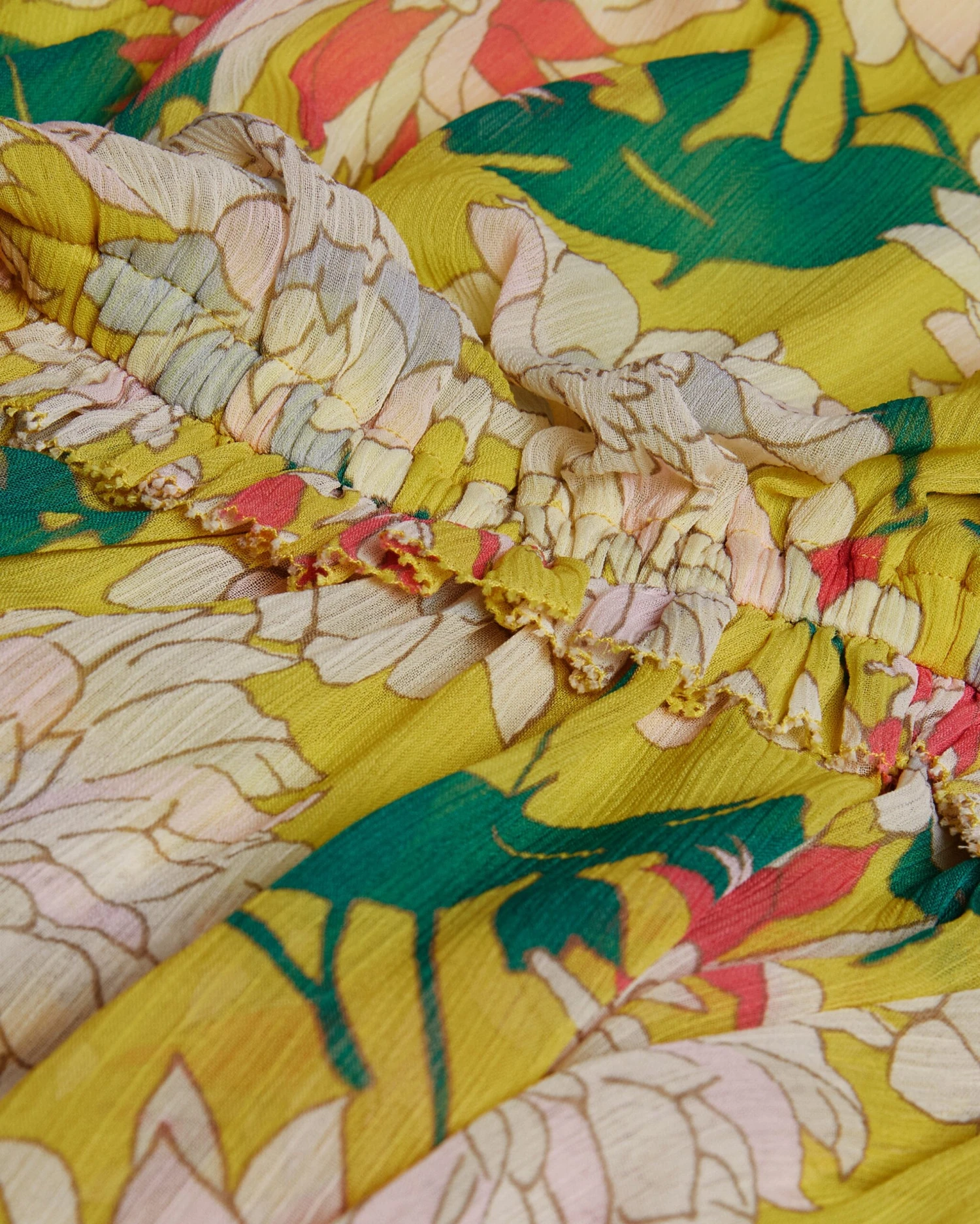 Hello, sunshine. With its playful puff sleeves and delicate ruffle details, GABBYIE is the epitome of feminine charm. Our vibrant chrysanthemum print is worthy of weekend brunches and casual workdays.