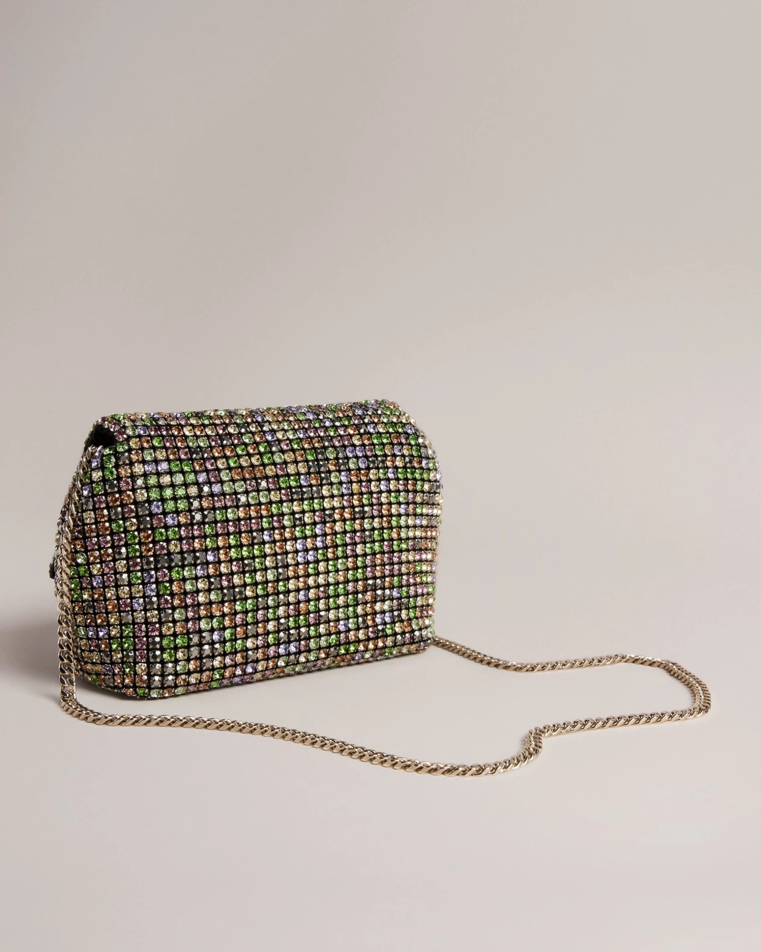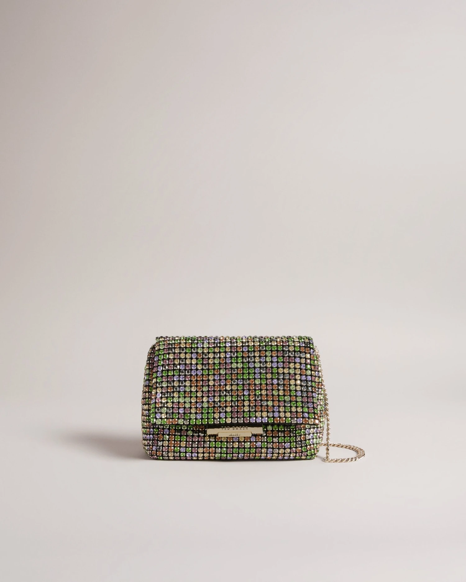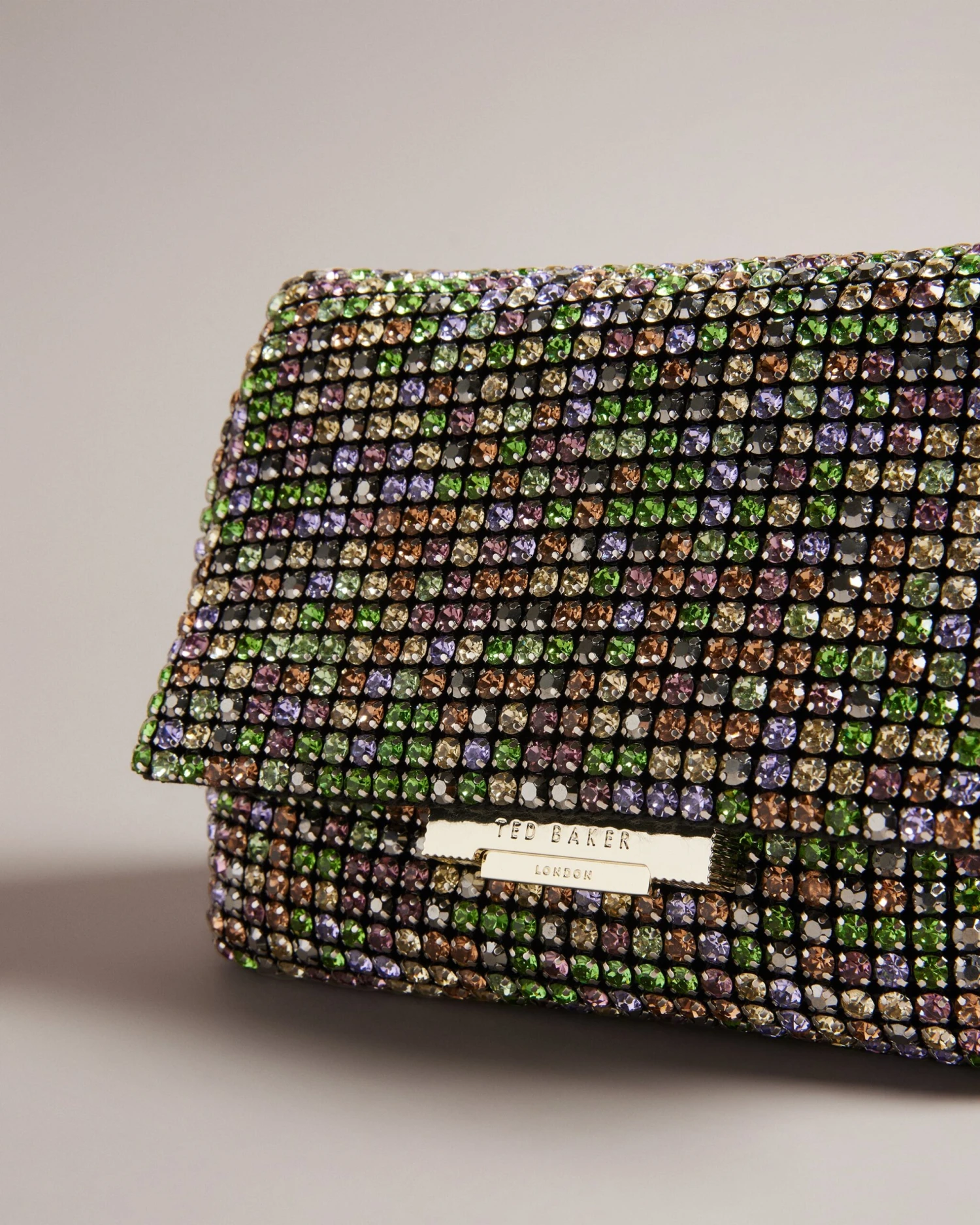 Crossbody bag All over crystal embellishment Chain shoulder strap Fold over cover Ted Baker branded Dimensions: 6.5cm x 10.5cm x 15cm