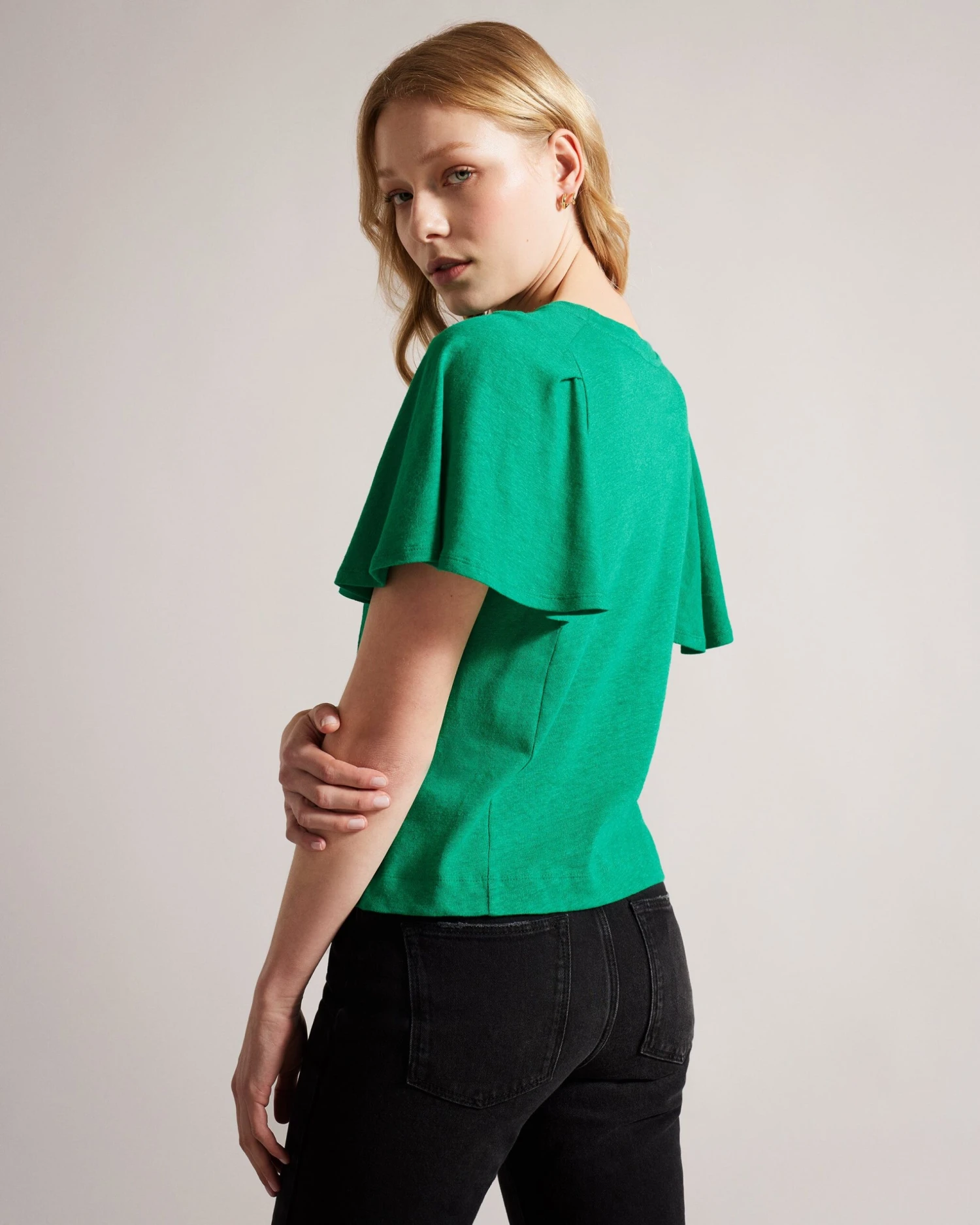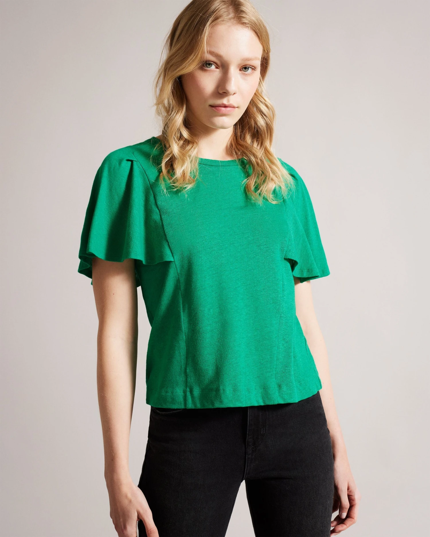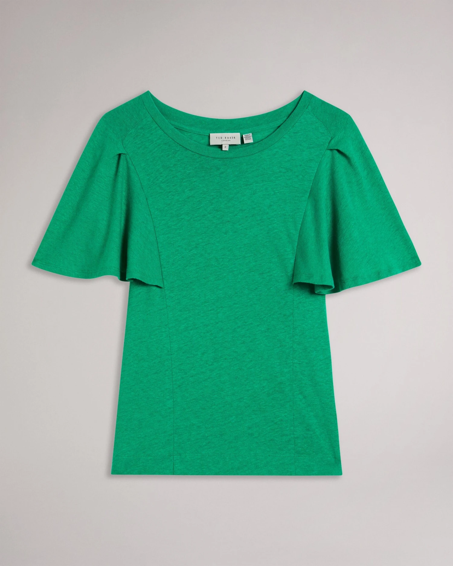 T-shirt Short ruffles sleeved Cotton and linen Crew neck Seam details Jara is 5’10.5″ / 1.79cm and wears Green in a Ted size 1