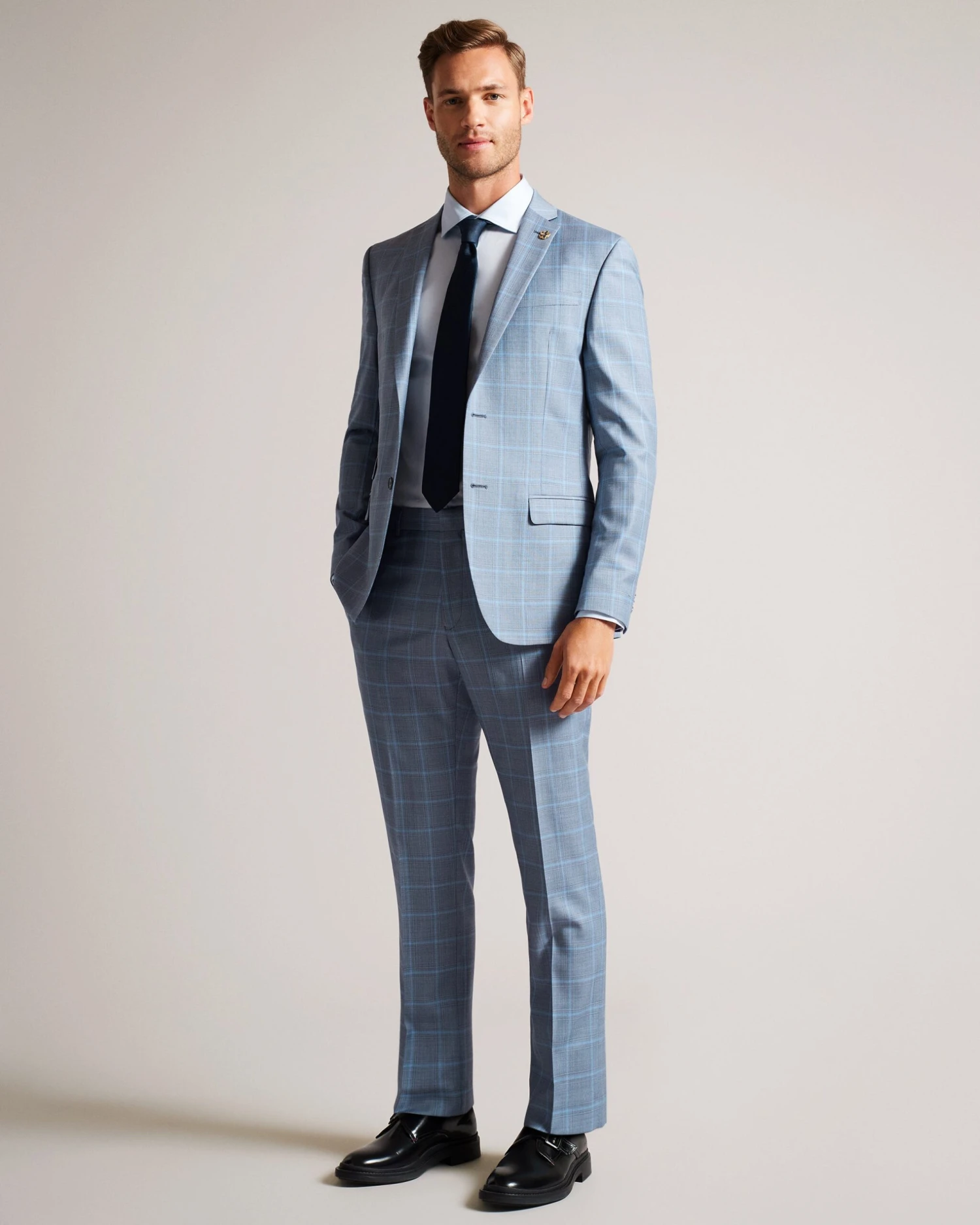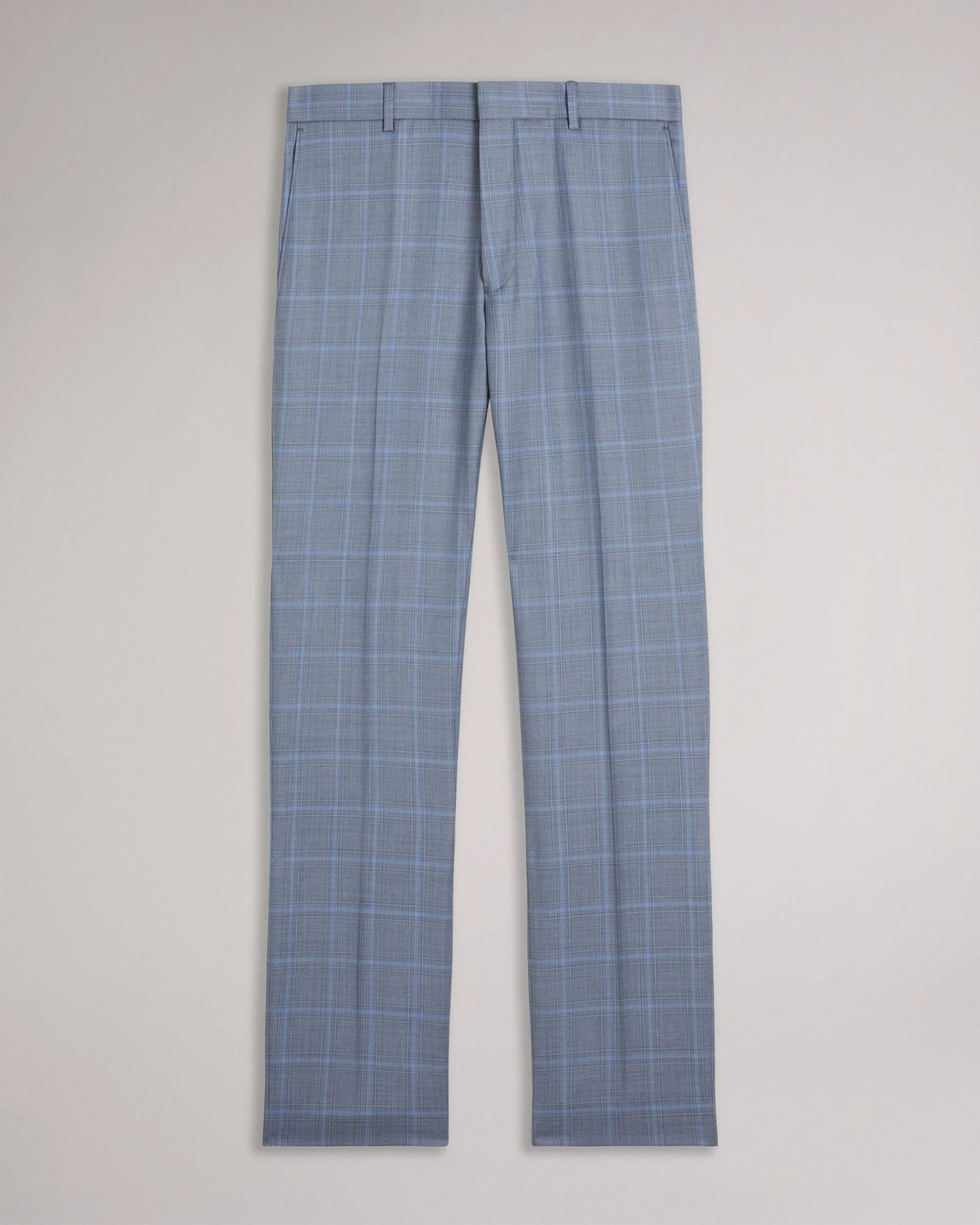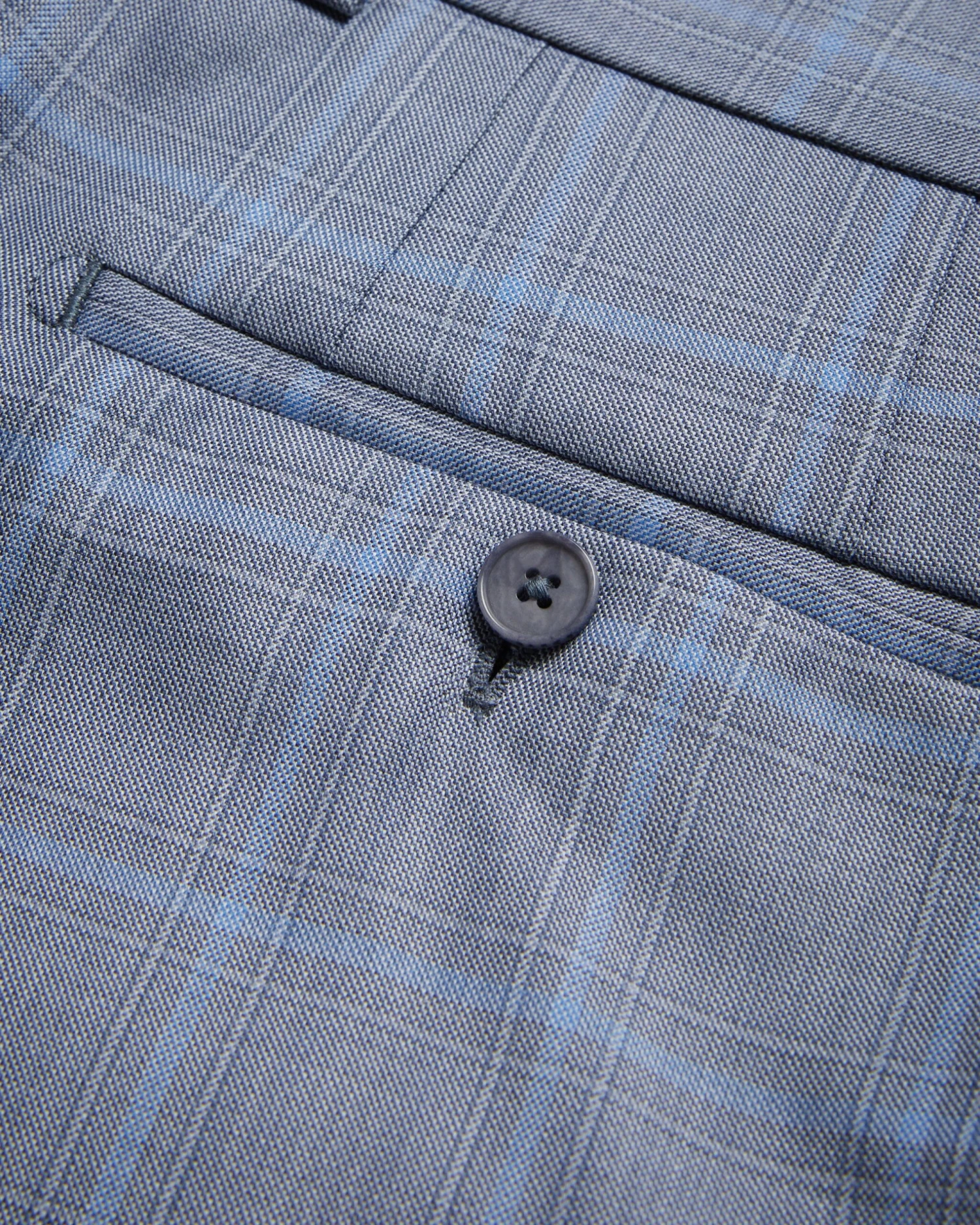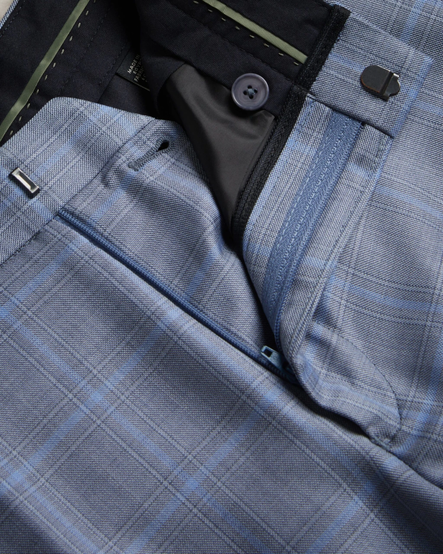 Suit trousers 100% wool Check print Front pleats Zip and hook fastening Belt loops Pockets Edward is 6’3″ / 1.90m and wears Blue in 32 R