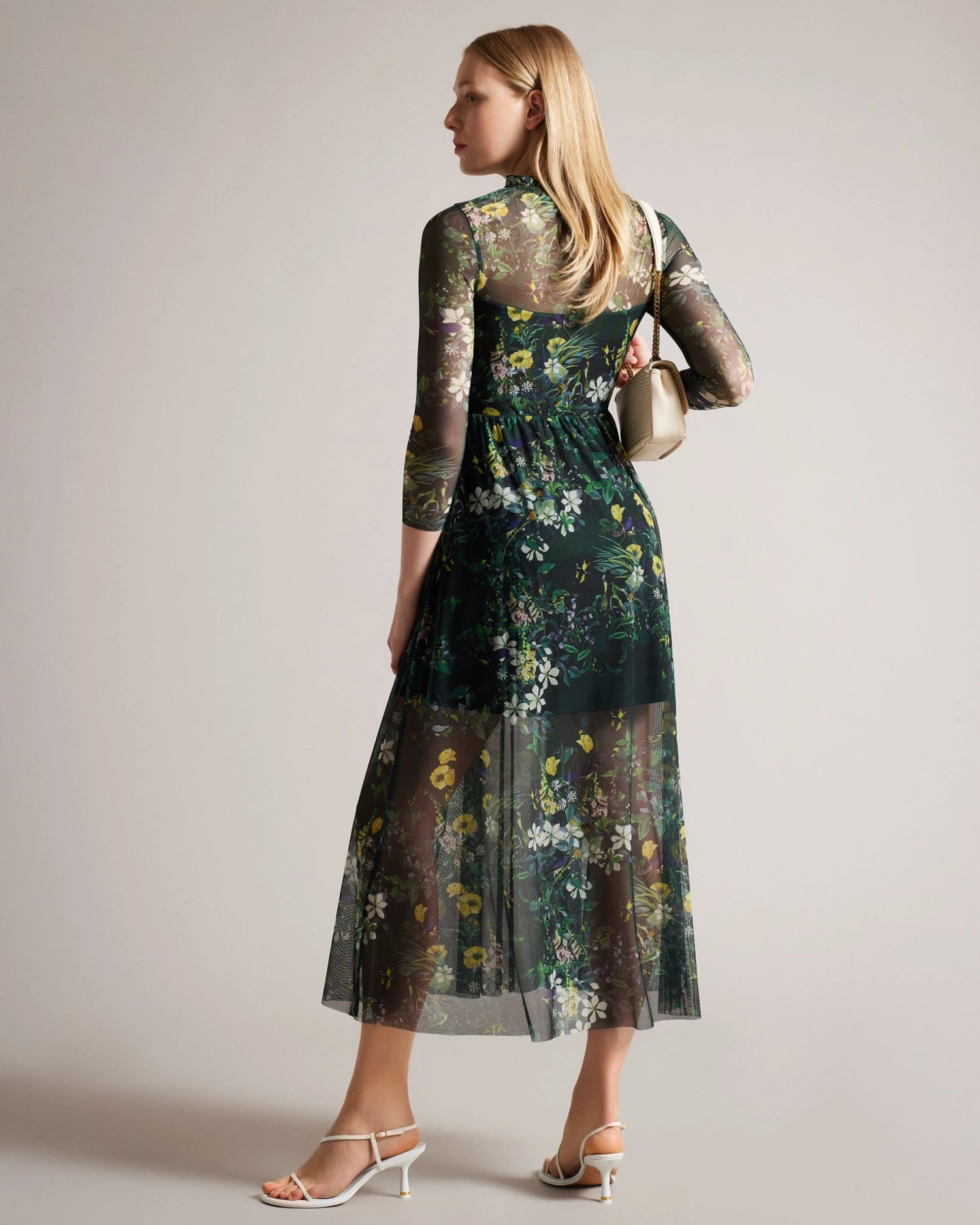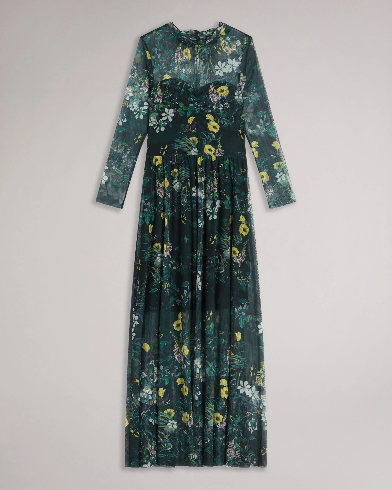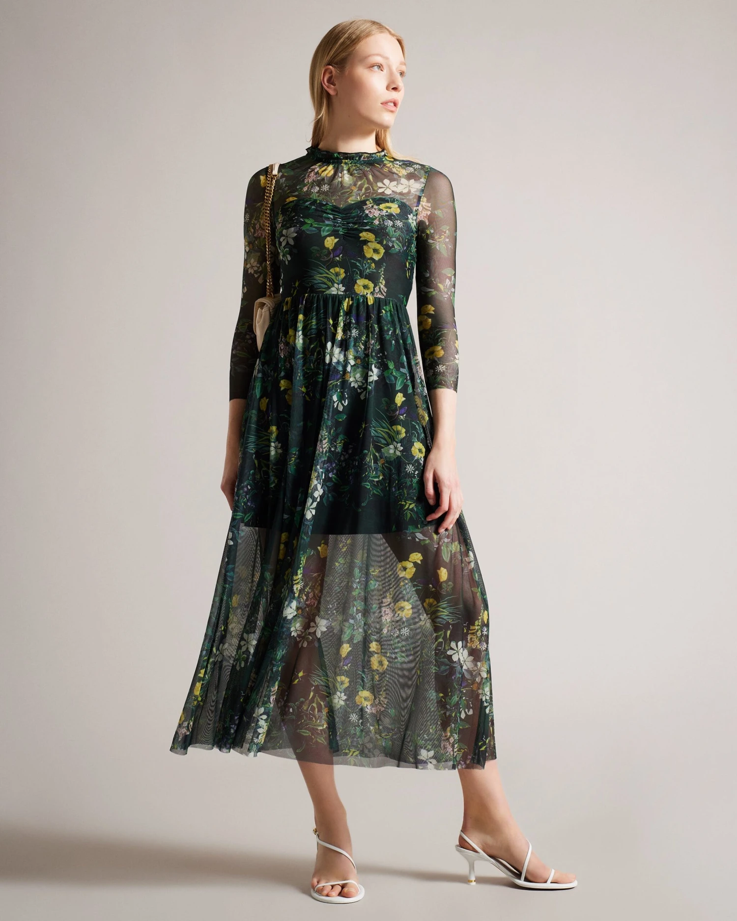 Midi dress Mesh with mini slip Botanical print Frilled neckline 3/4 sleeves Seam details Ruched bodice Jara is 5’10.5″ / 1.79cm and wears Dark Green in a Ted size 1
