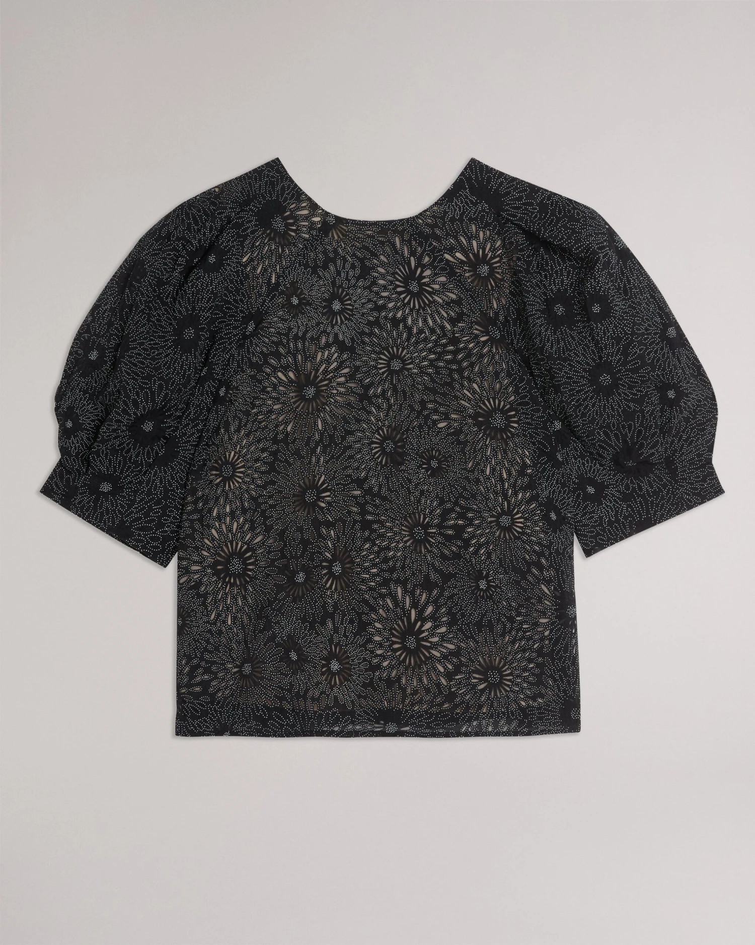 Boxy fit top Short puff sleeves Cut-out floral design Crew neck Bow tied back with cut-out Silvia is 5’11” / 1.8m and wears Black in a Ted size 1