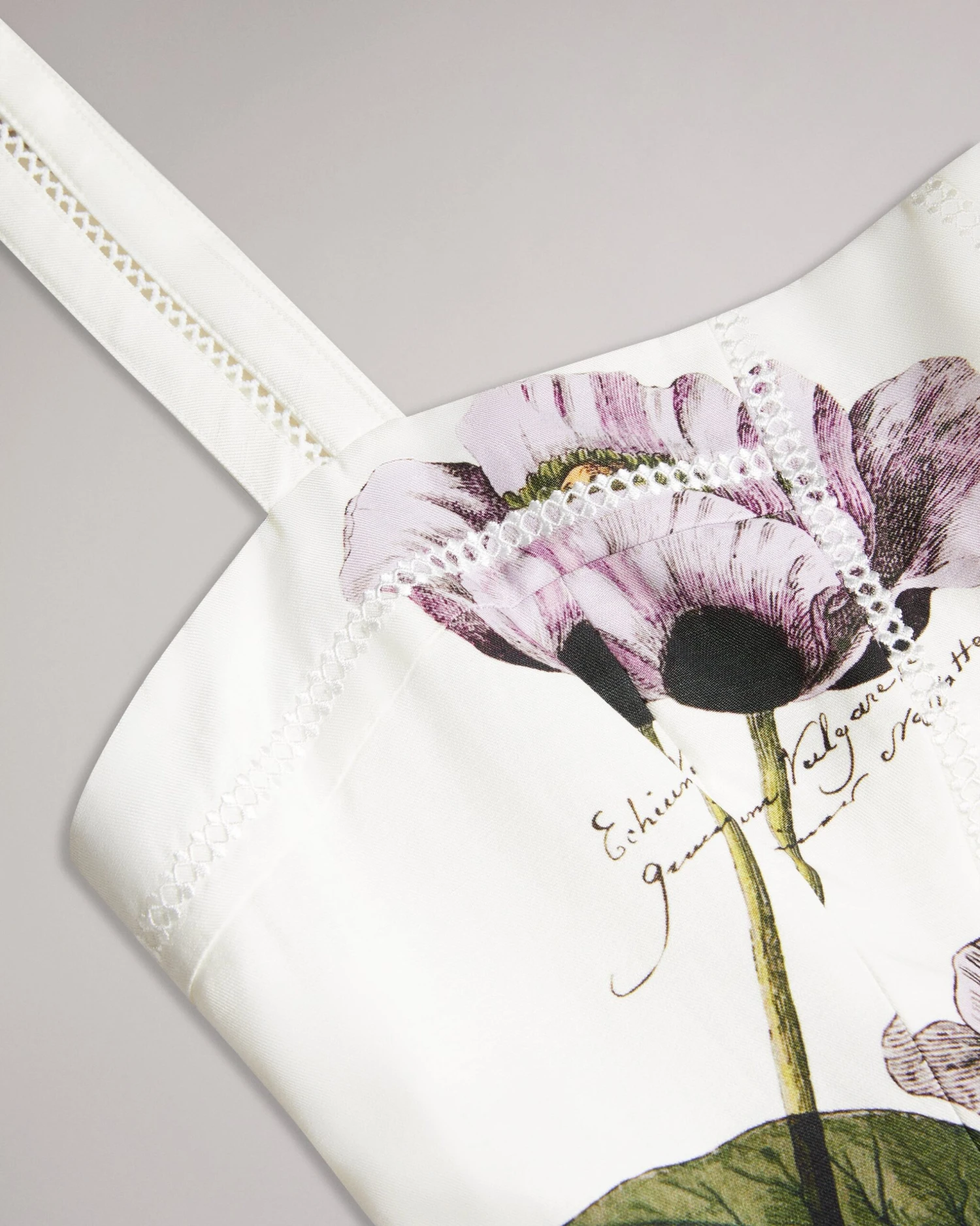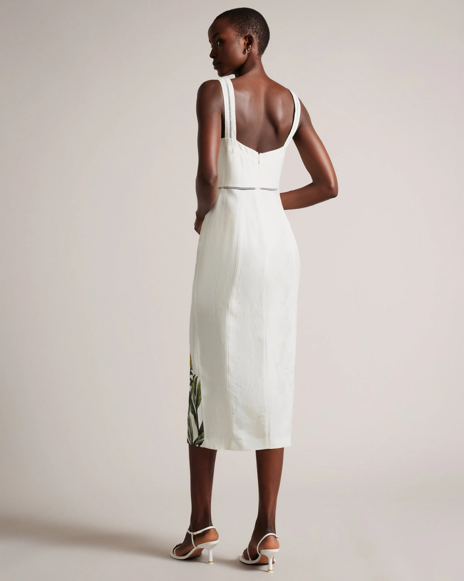 Midi pencil dress Side split Botanical bouquet print Square neck Sleeveless Lace inserts Zip fastening Awuoi is 5’10.5″ / 1.79m and wears White in a Ted size 1