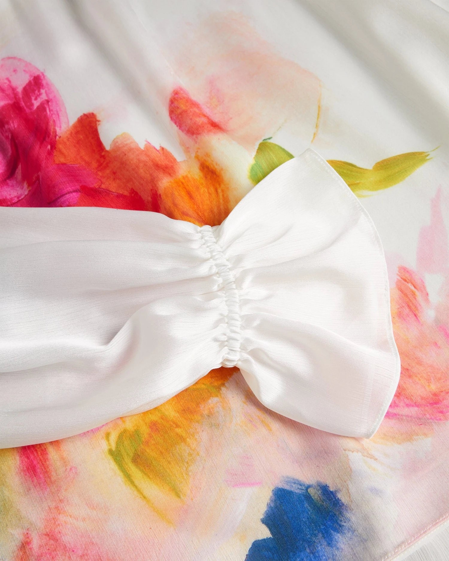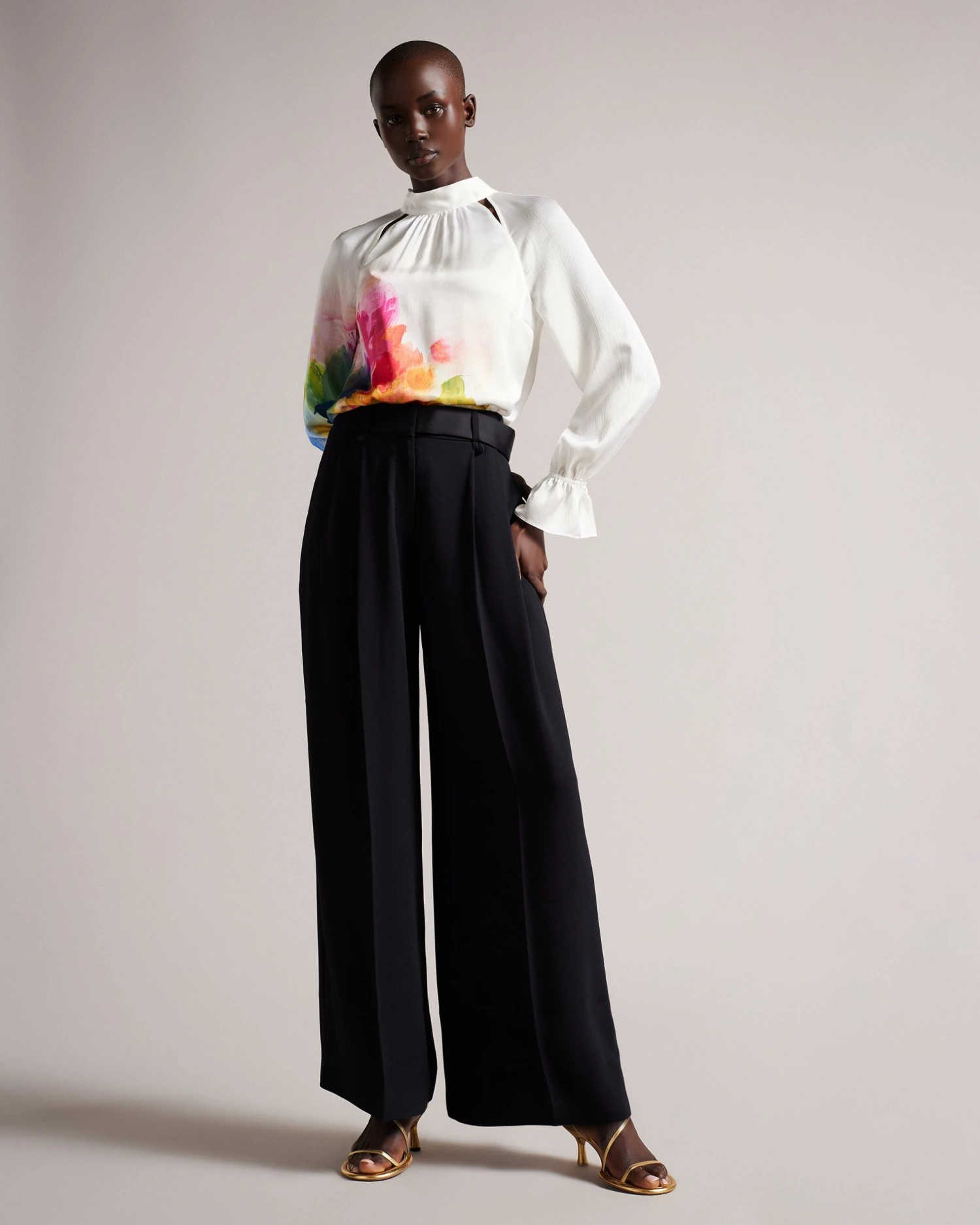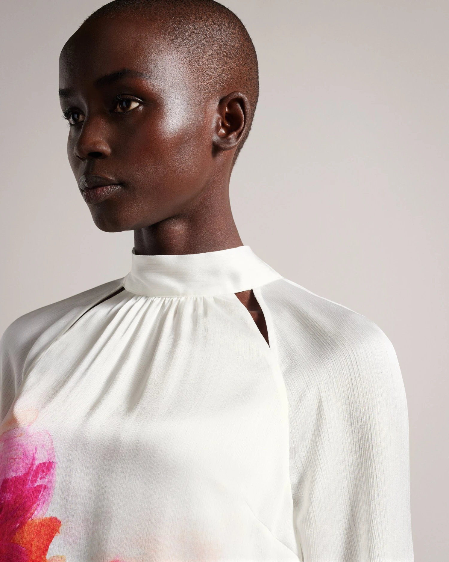 The KATTYIA blouse is a total head turner. A sweet bow tied back, high neck and abstract print make a statement, while the textured fabric and subtle cut-outs add the perfect amount of drama.
