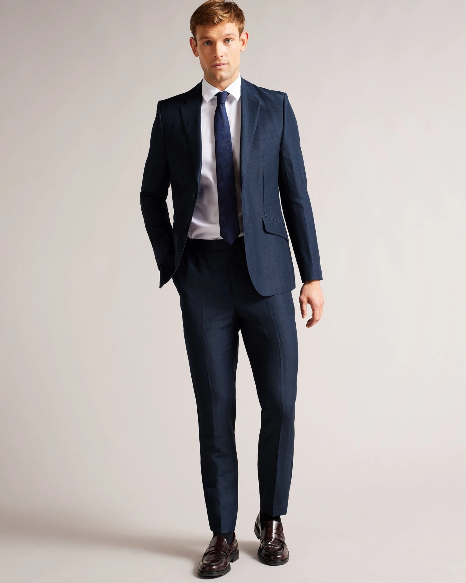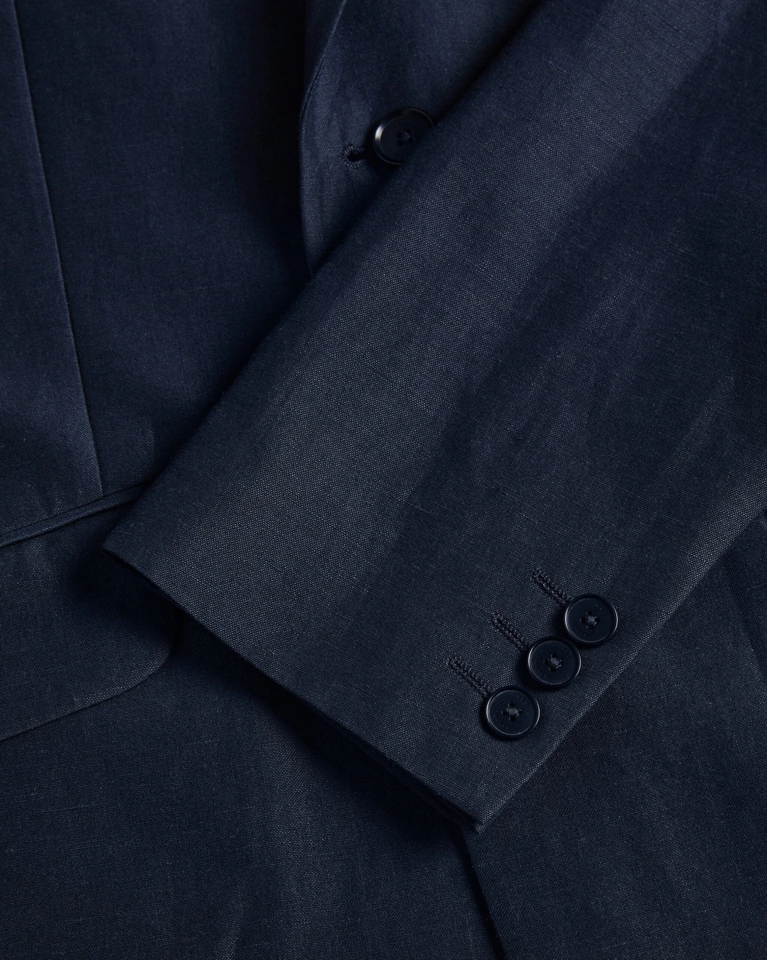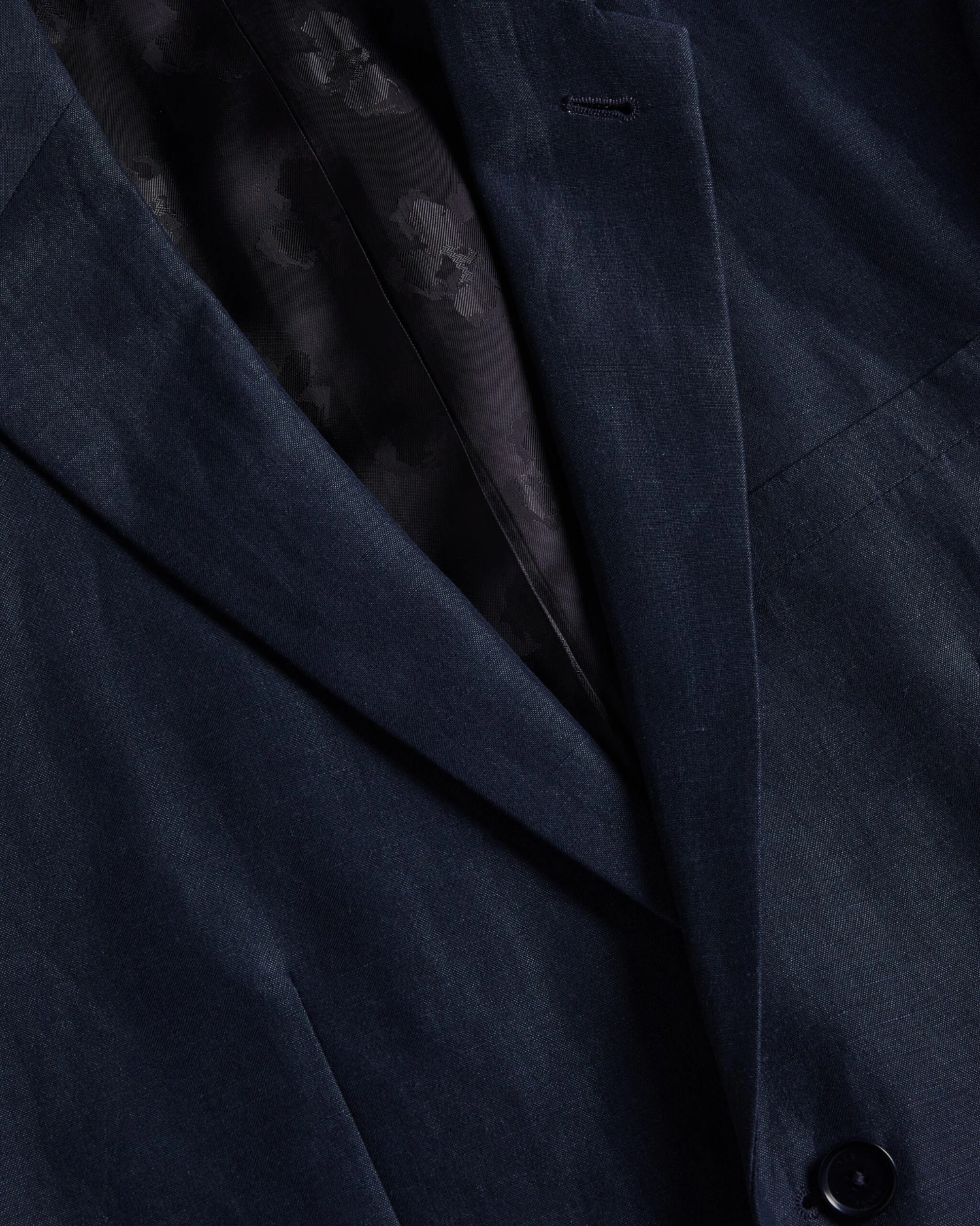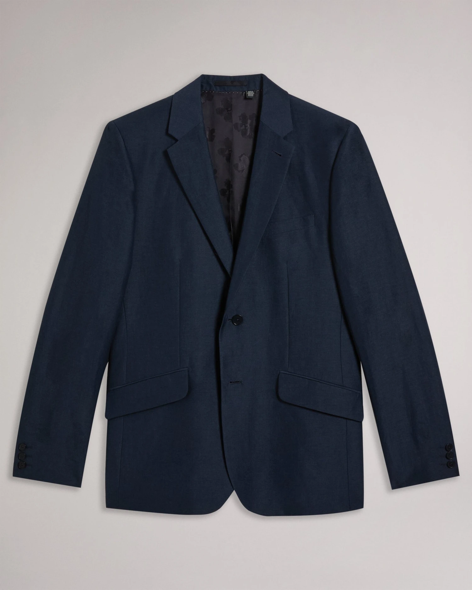 Blazer Wool and linen blend Long sleeved Jacquard magnolia lining Single breasted buttons Elliot is 6’2″ / 1.88m and wears Navy in a Ted size 3