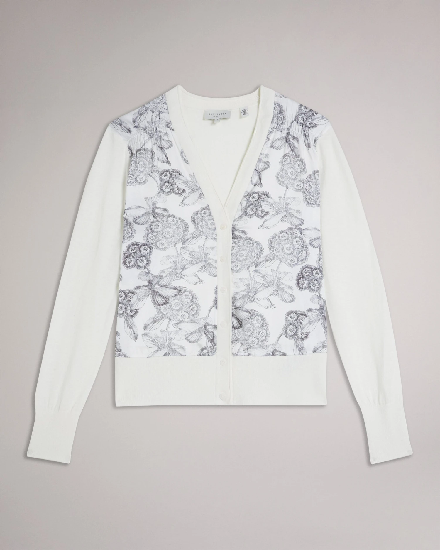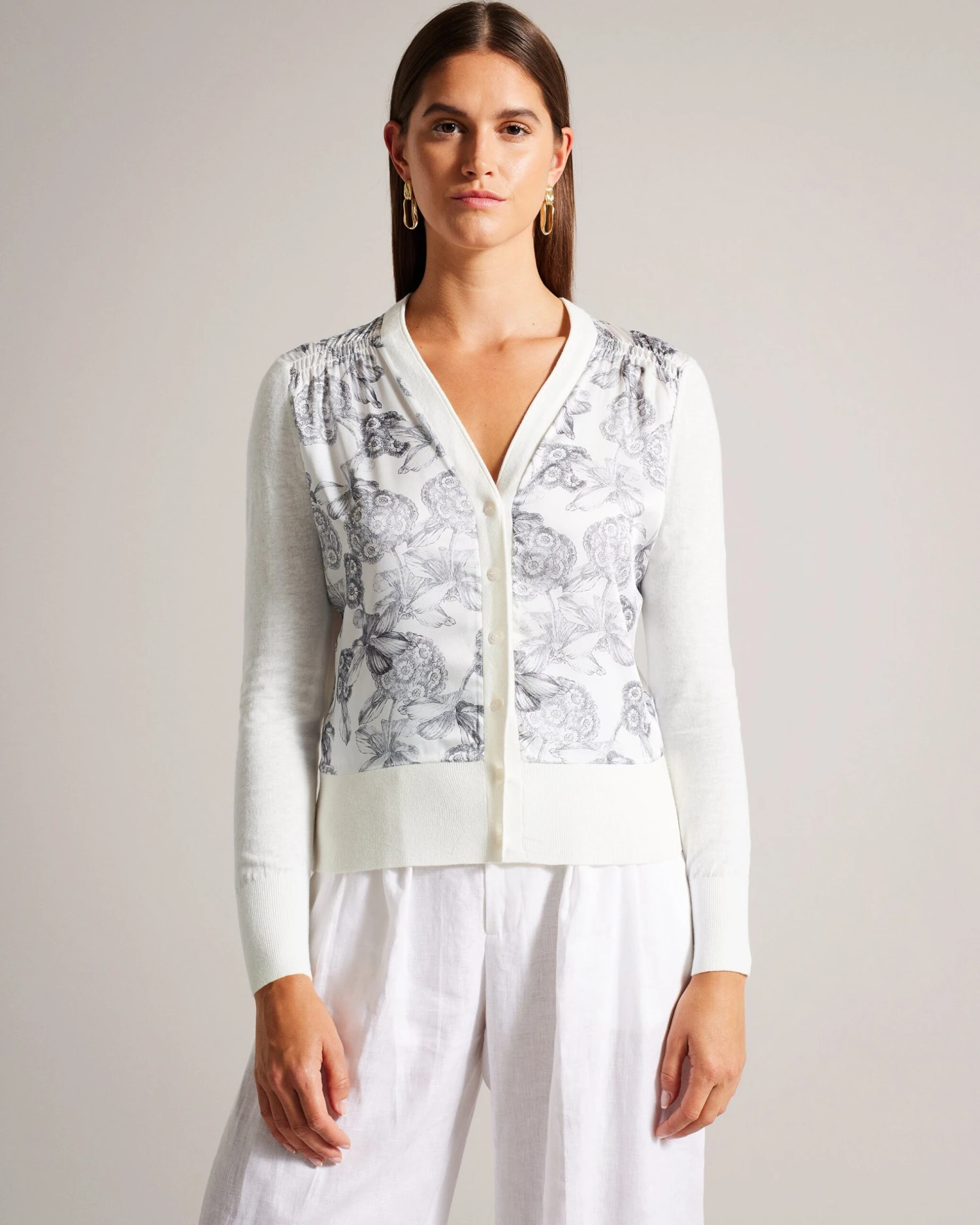 Cardigan Cotton and linen blend Woven floral print front Slim fit V-neck Button fastening