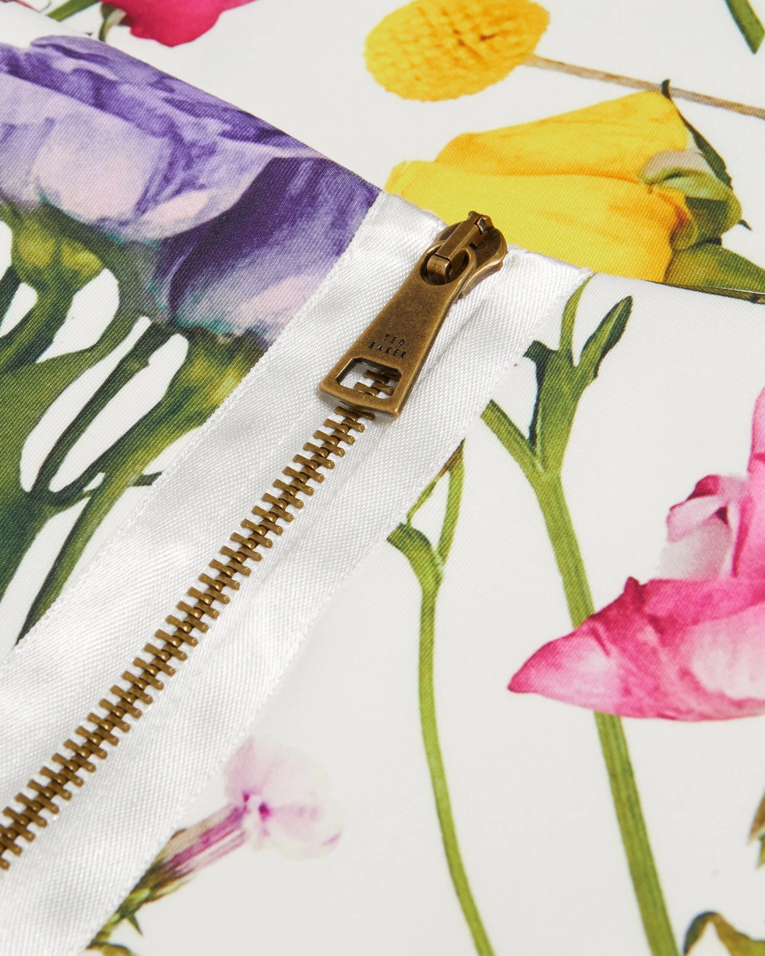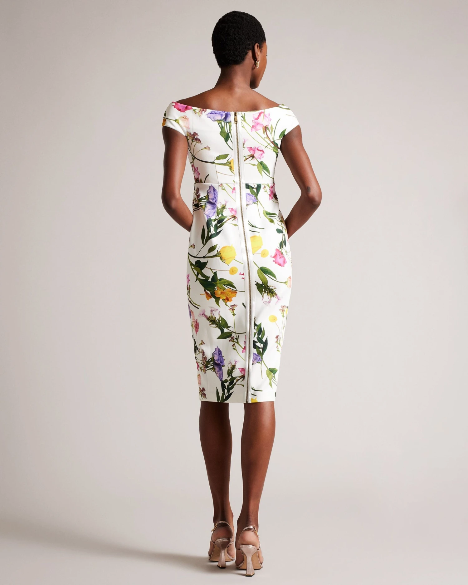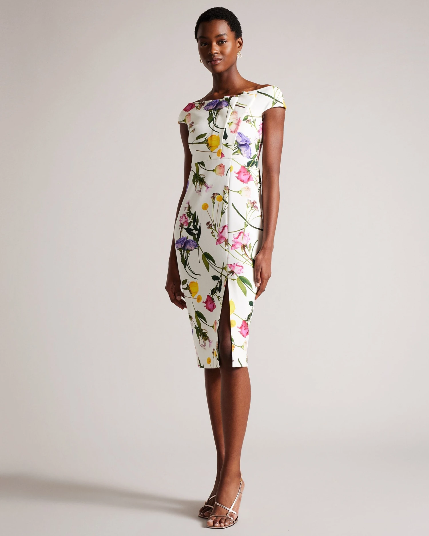 Bodycon dress Midi length Scattered bouquet print Bardot sleeve Full length zip fastening Front split Amy is 5’9.5″ / 1.77m and wears Black in a Ted size 1