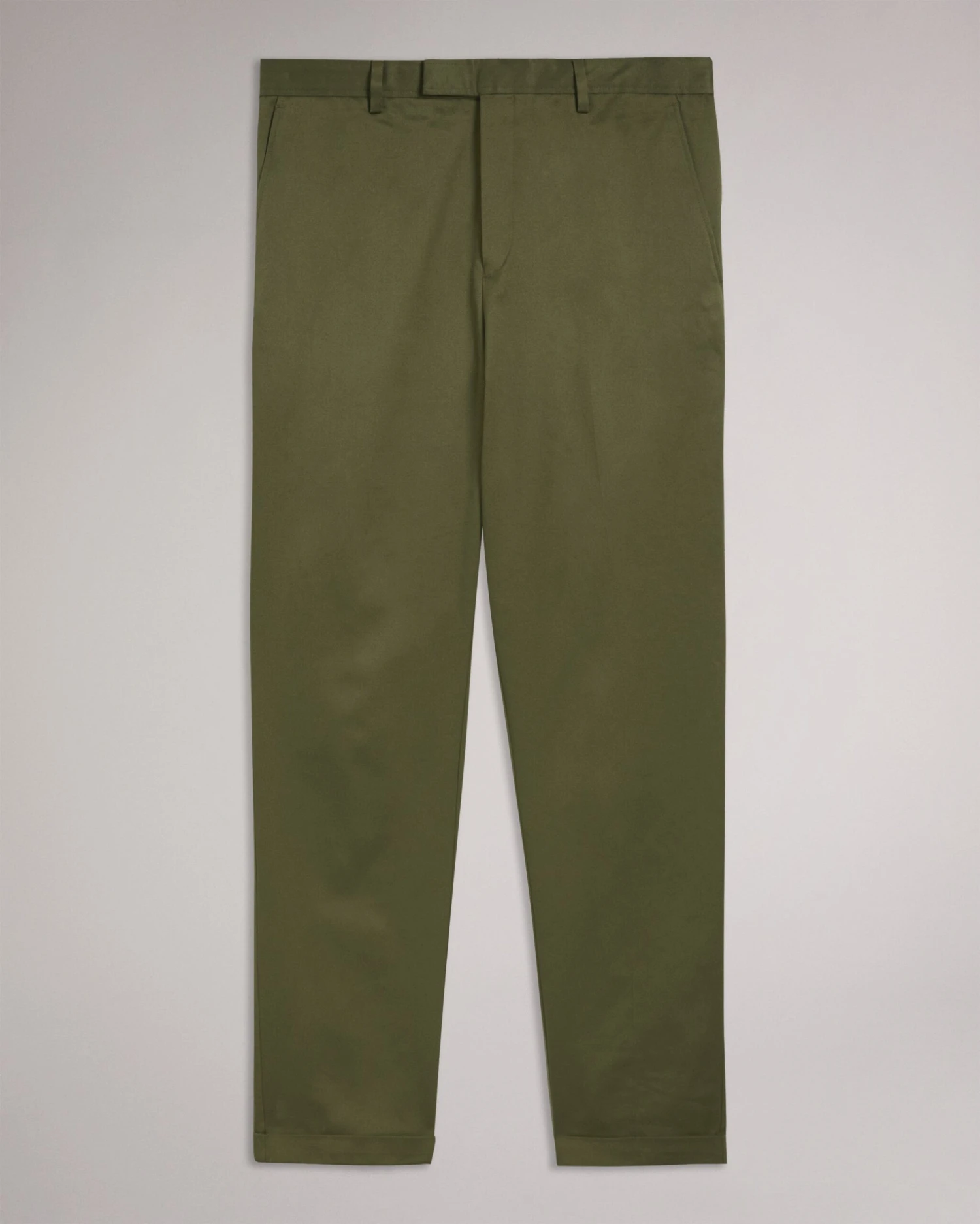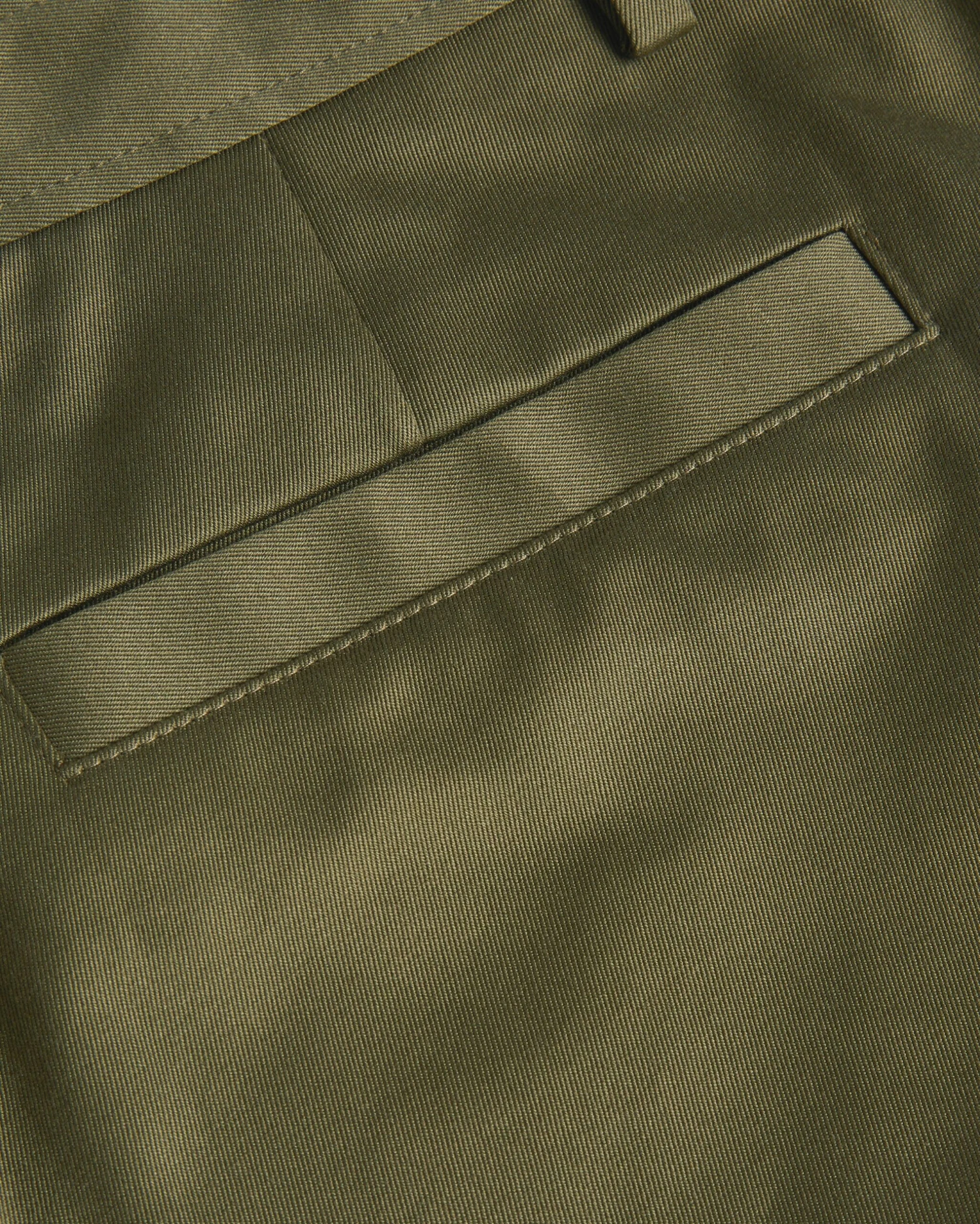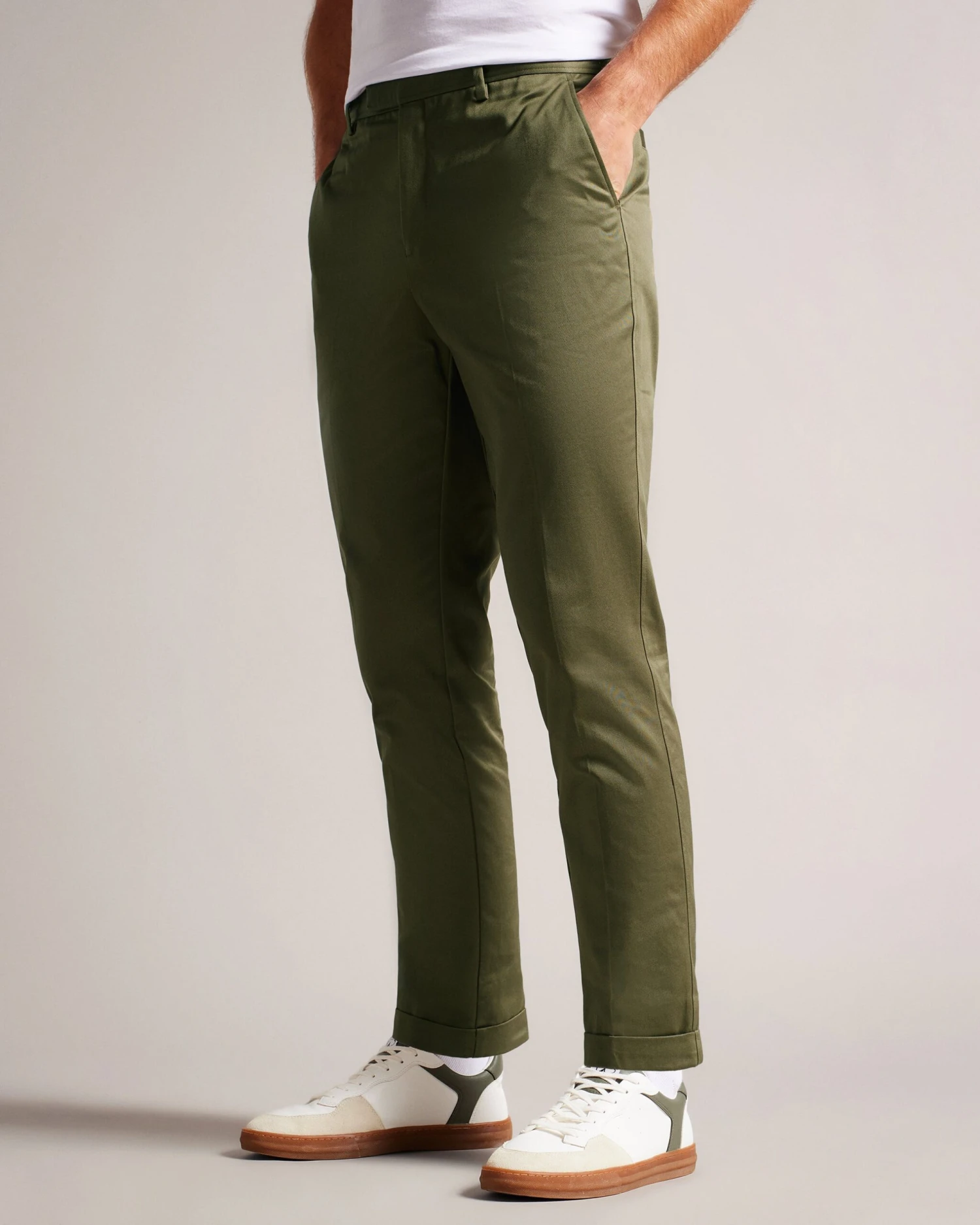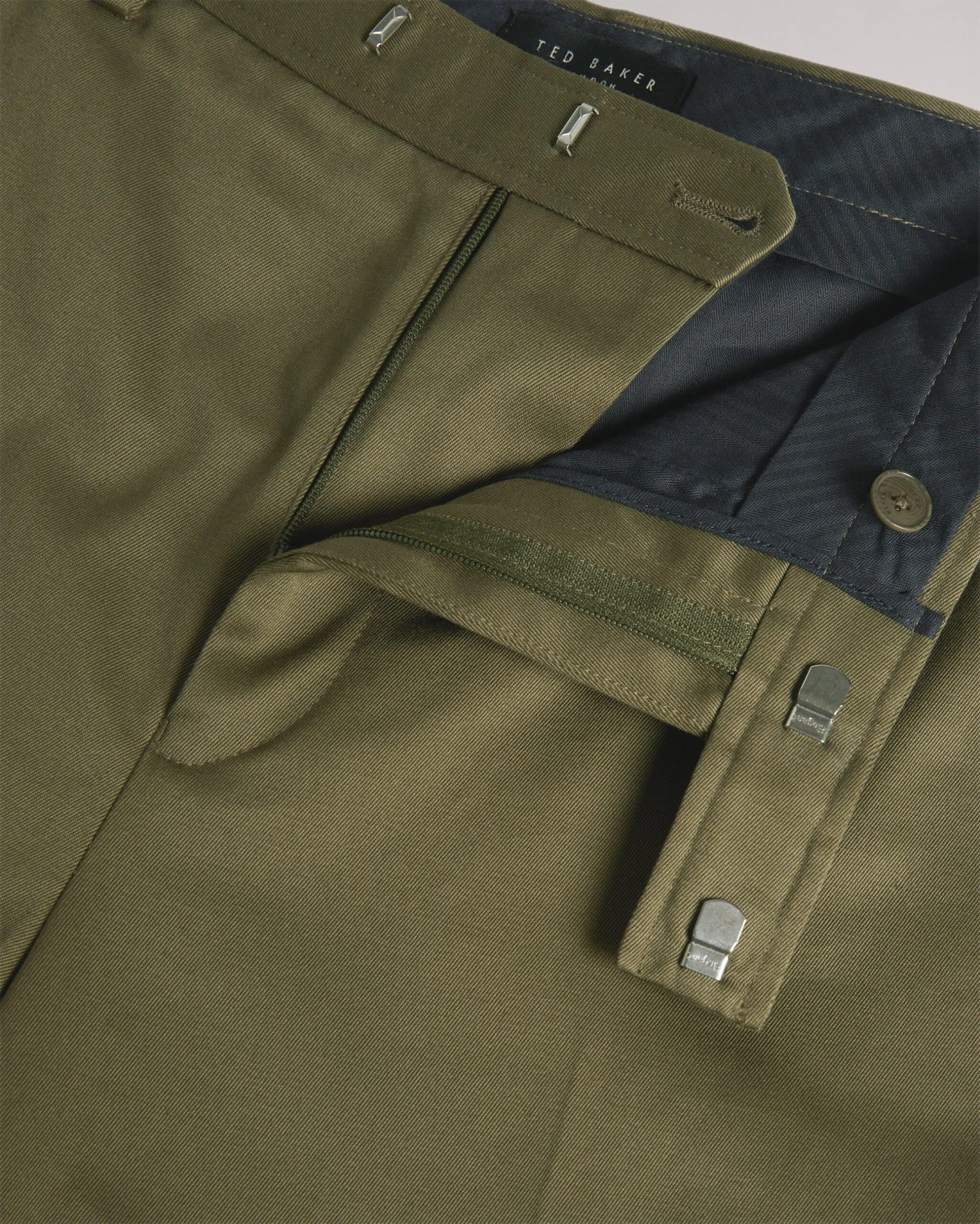 Trousers Cotton twill Slim fit Zip and hook fastening Belt loops Pockets Elliot is 6’2″ / 1.88m and wears Dark Green in 32 R