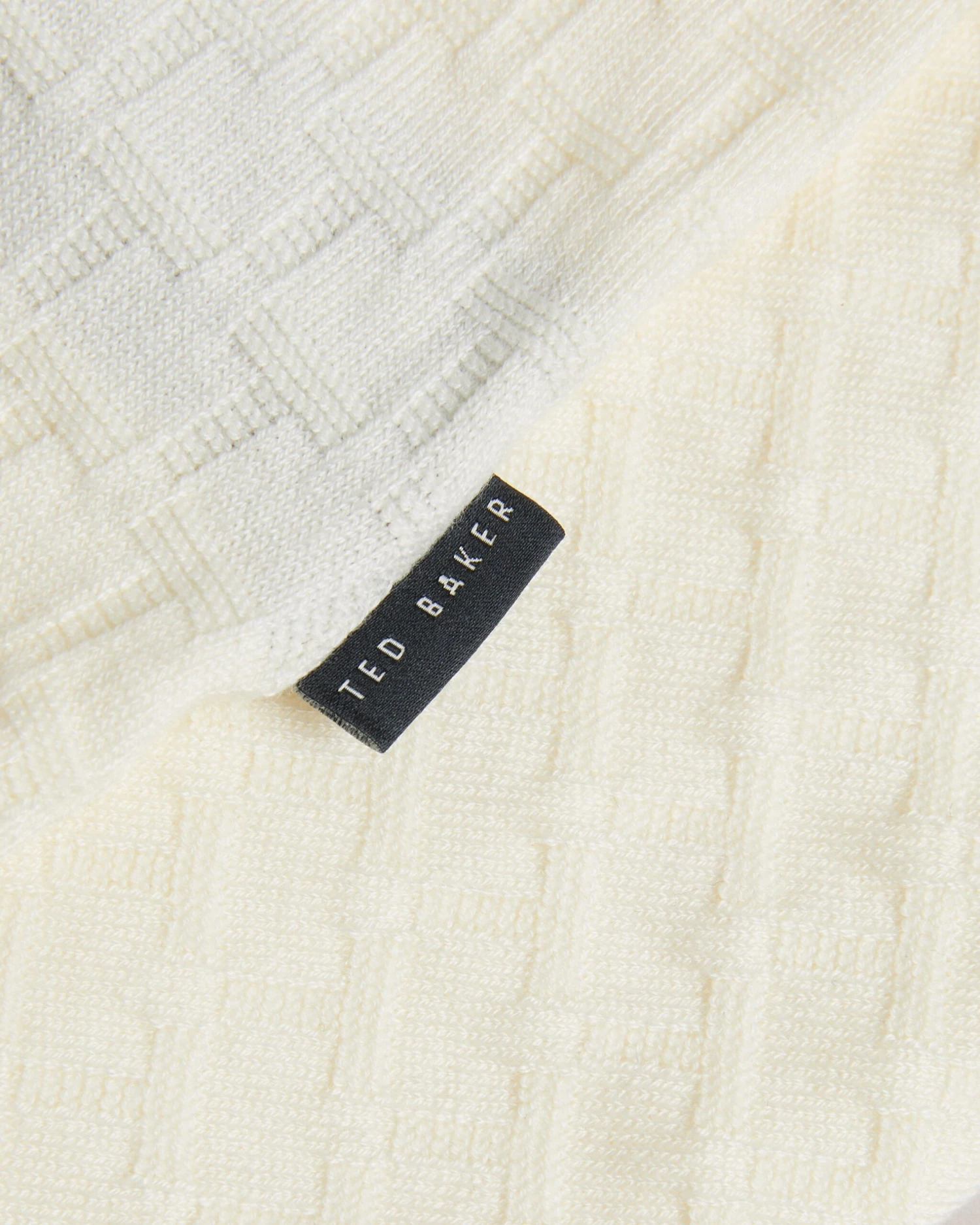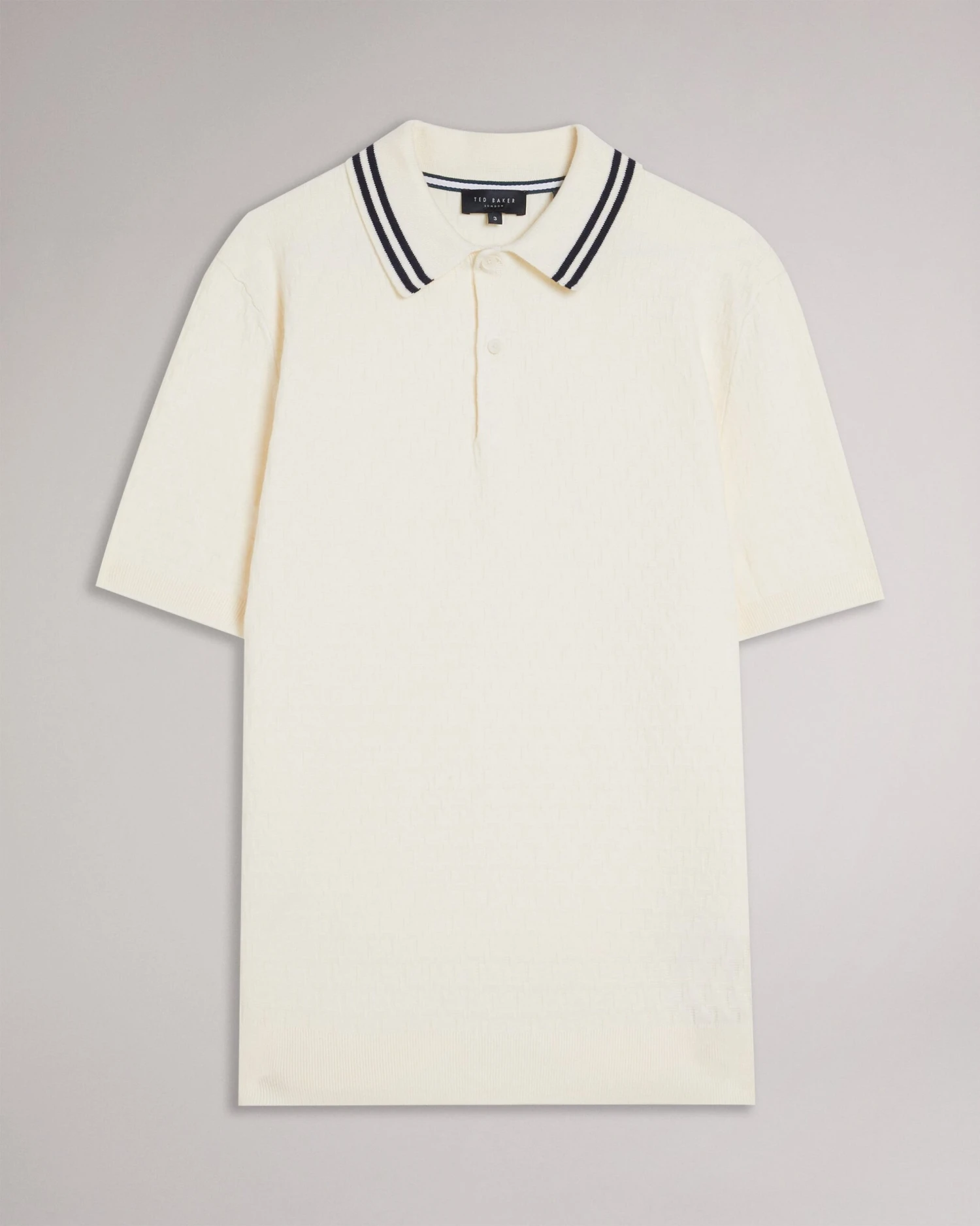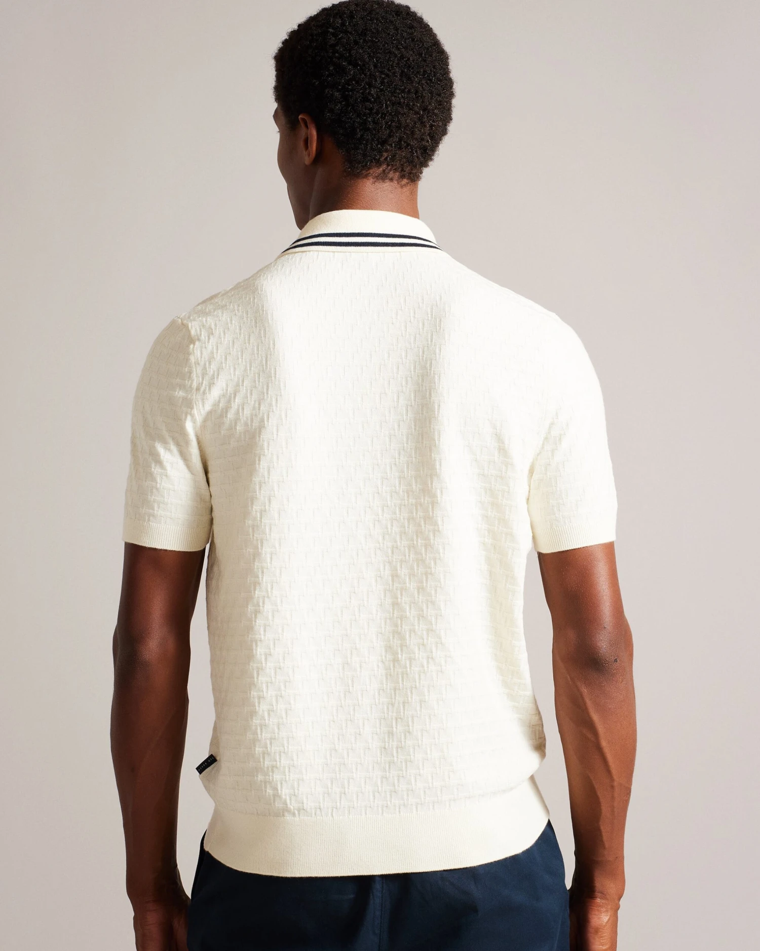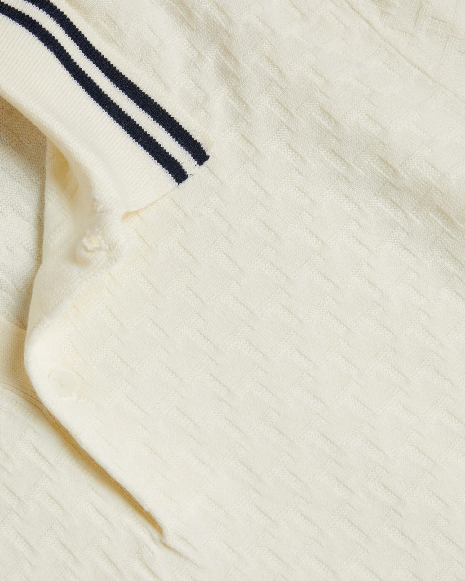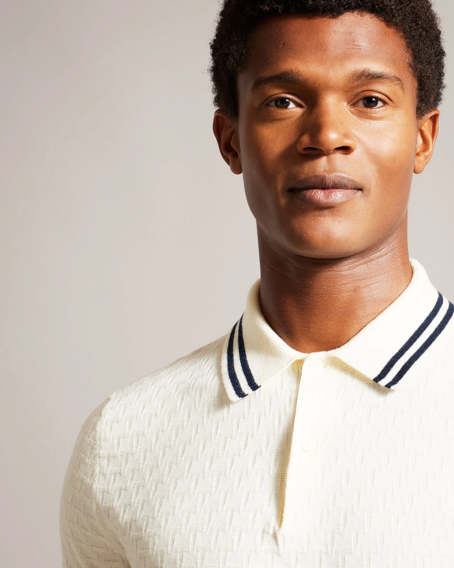 Polo shirt Short sleeved Striped collar Button placket Wool blend T textured stitch Joseph is 6’1″ / 1.85m and wears White in a Ted size 3