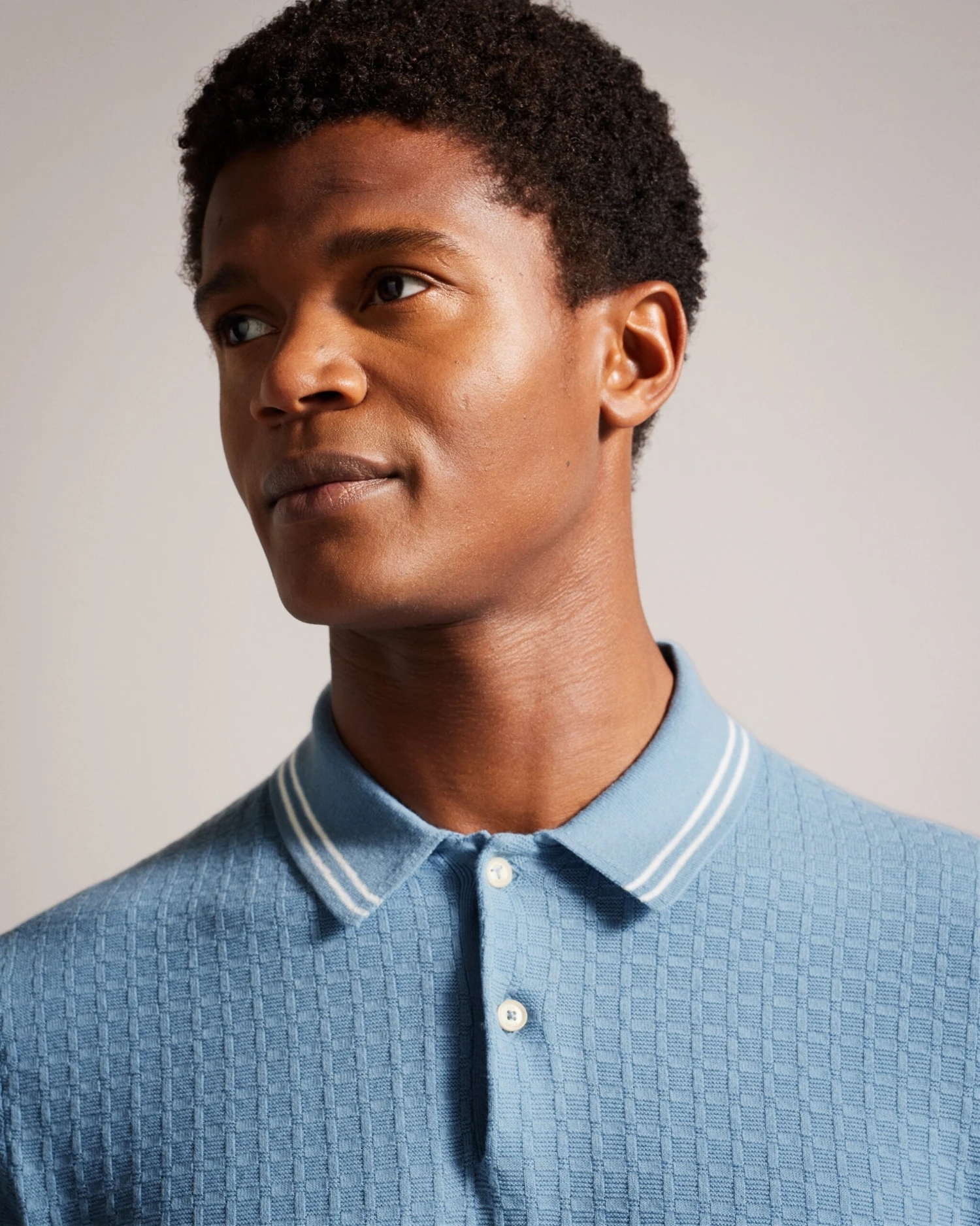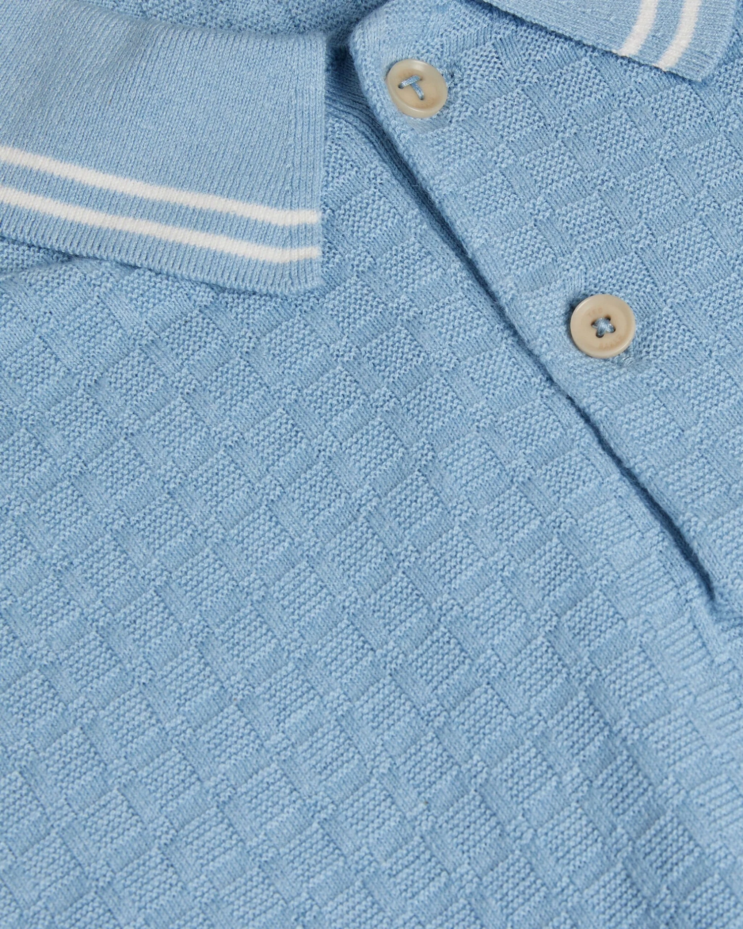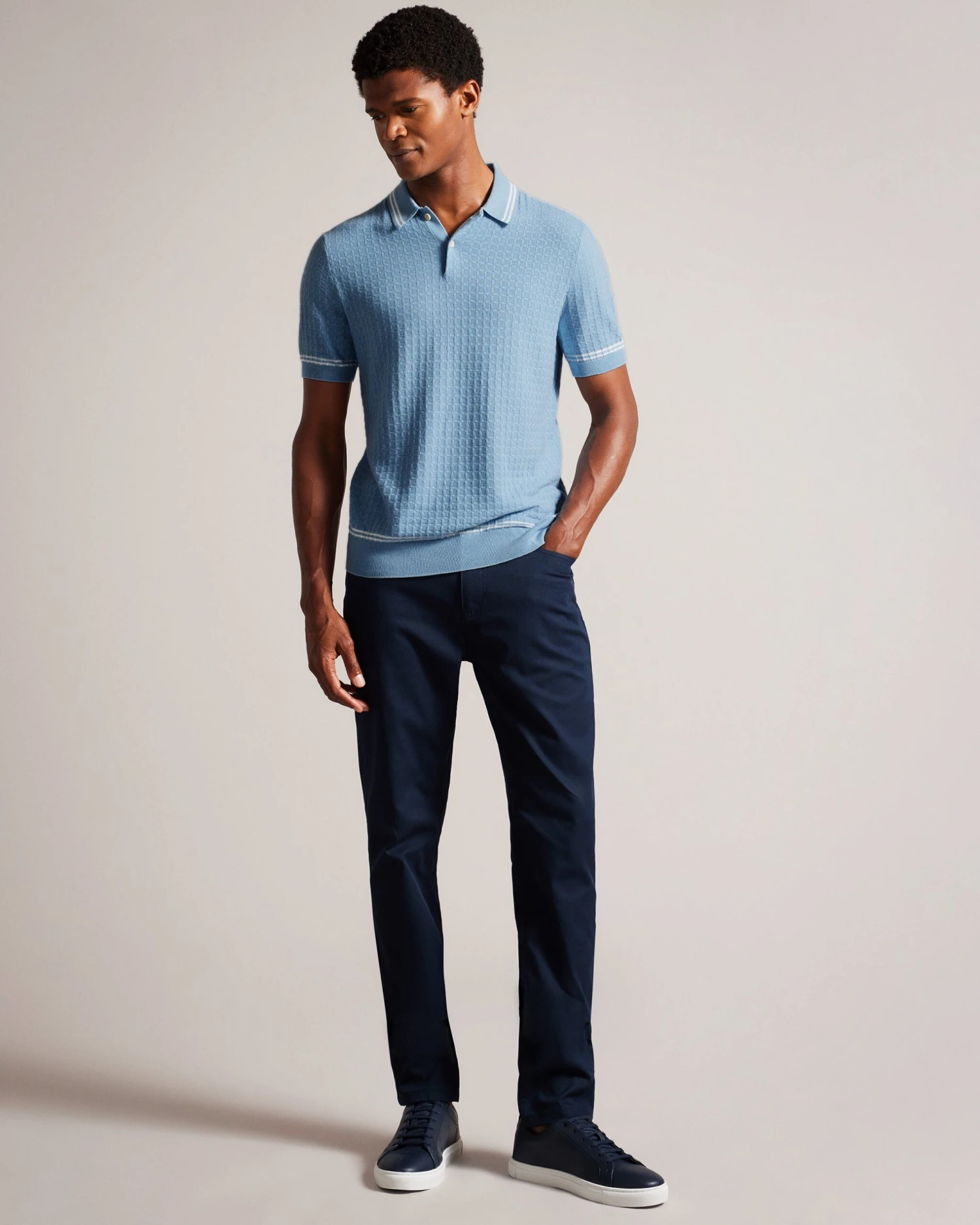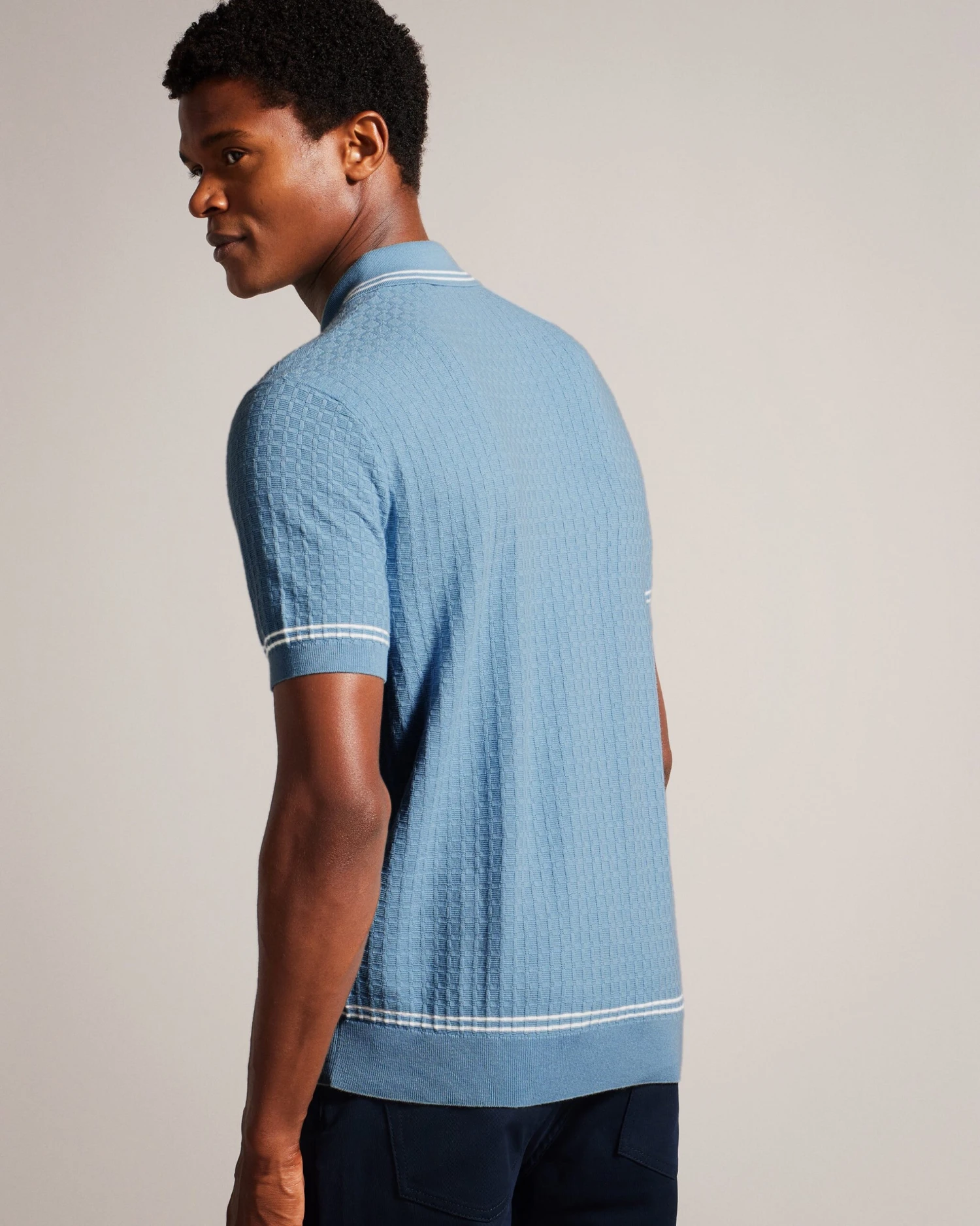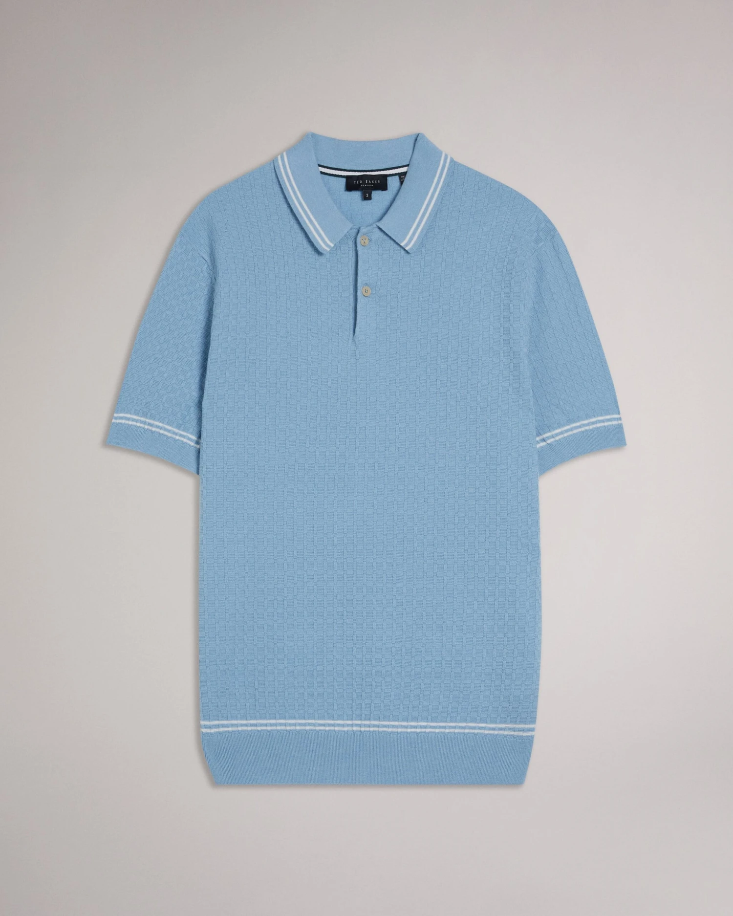Polo shirt Classic collar Cotton blend Textured knit Contrast stripe details Short sleeved Mukasa is 6’2.5″ / 1.89m and wears Sky Blue in a Ted size 3
