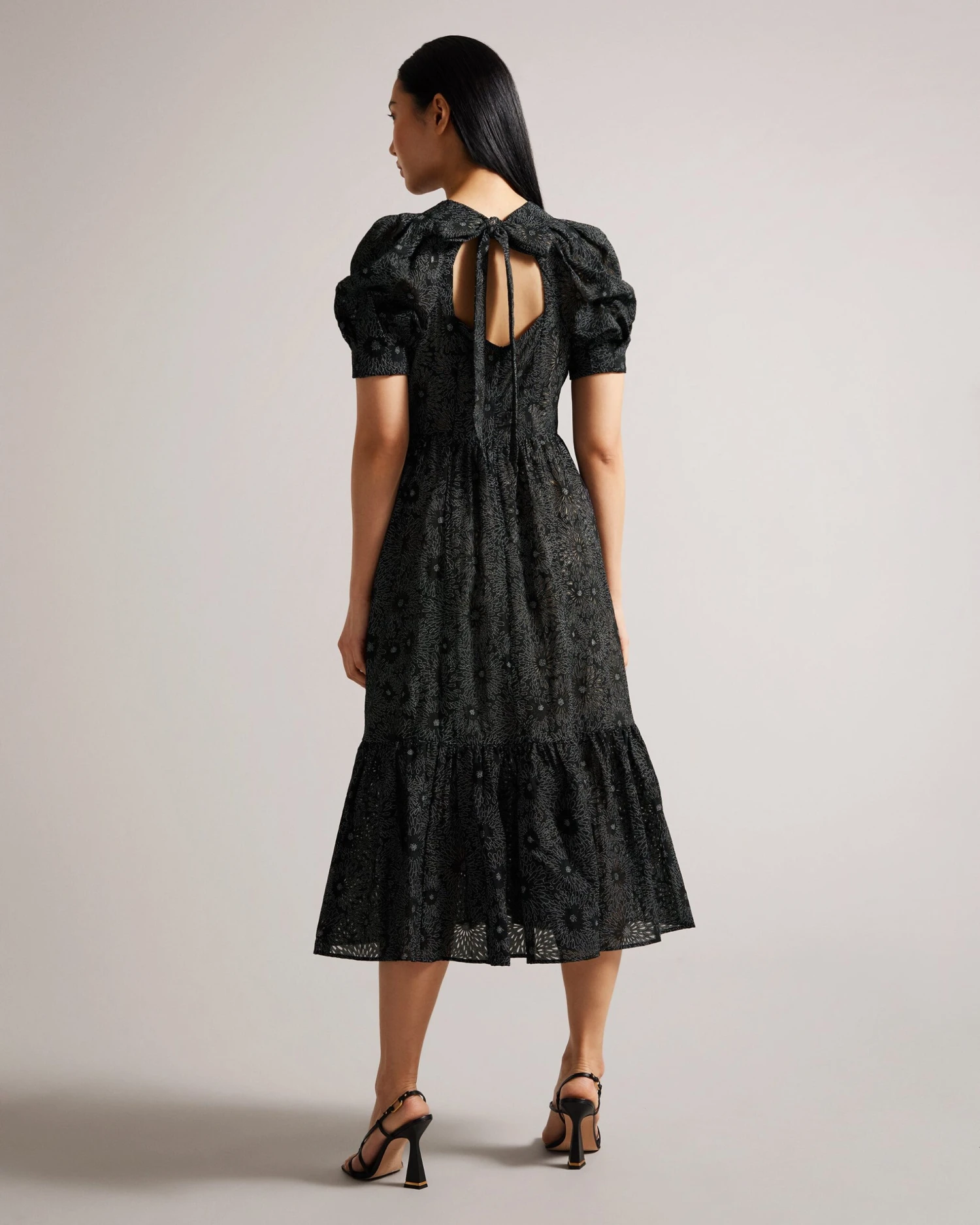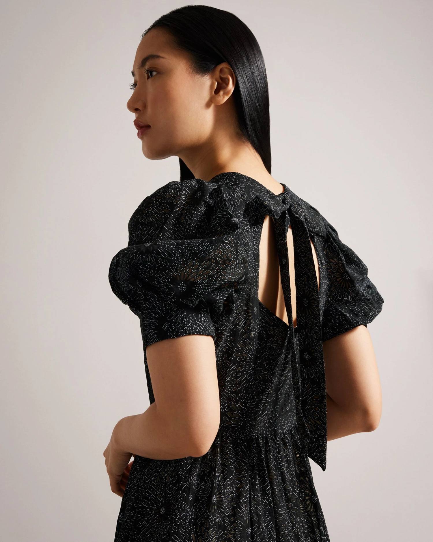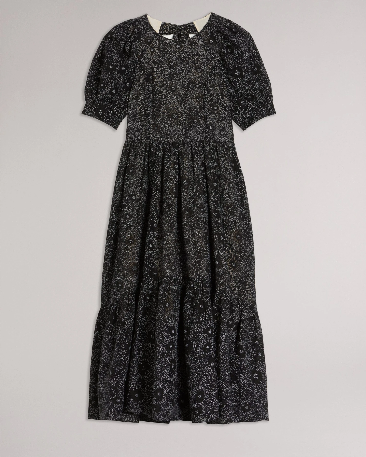 Maxi dress Floral print Tiered skirt Short puff sleeves A-line Crew neck