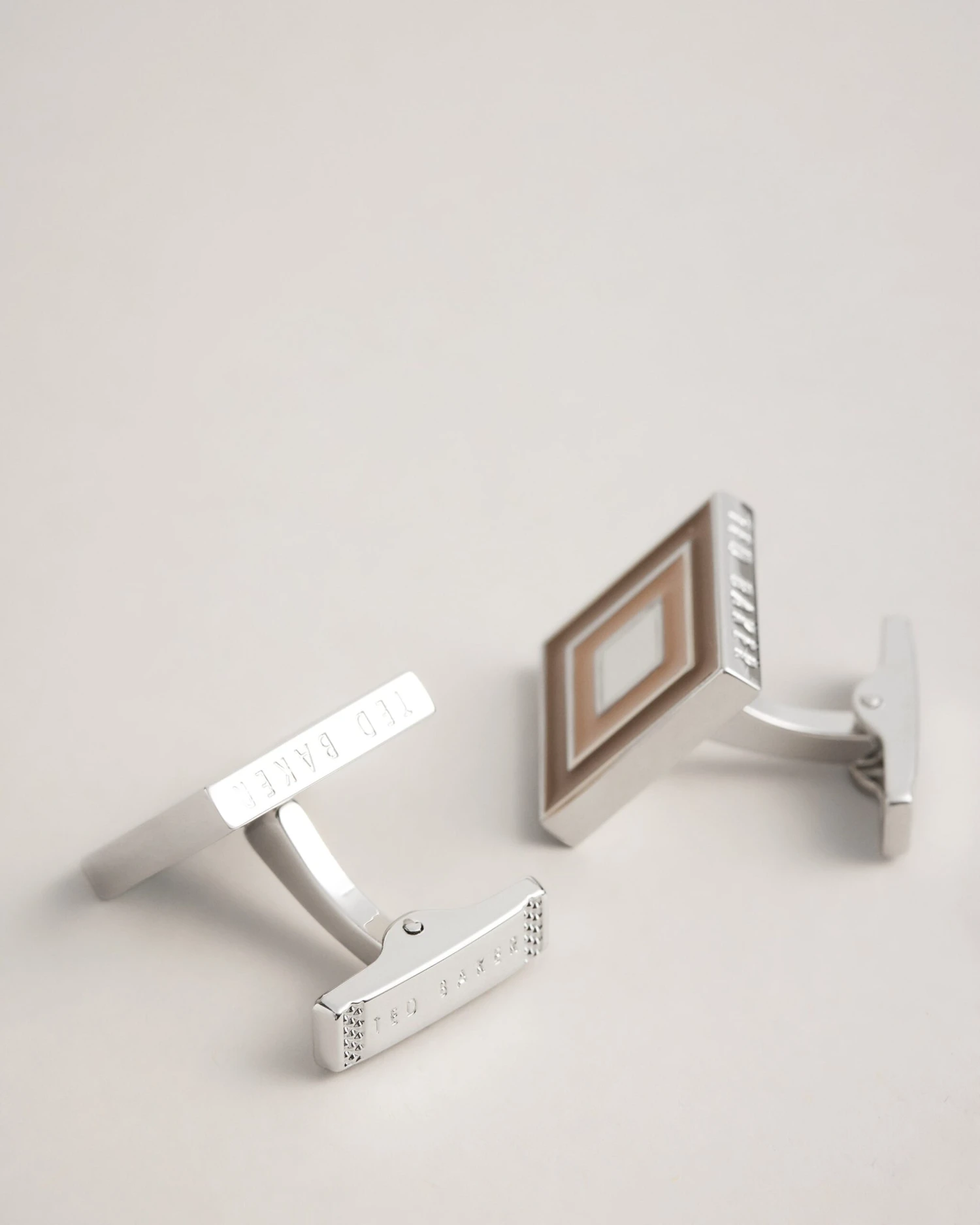 Square cufflinks Contrasting layered squares Engraved logo Comes in Ted Baker branded gift box