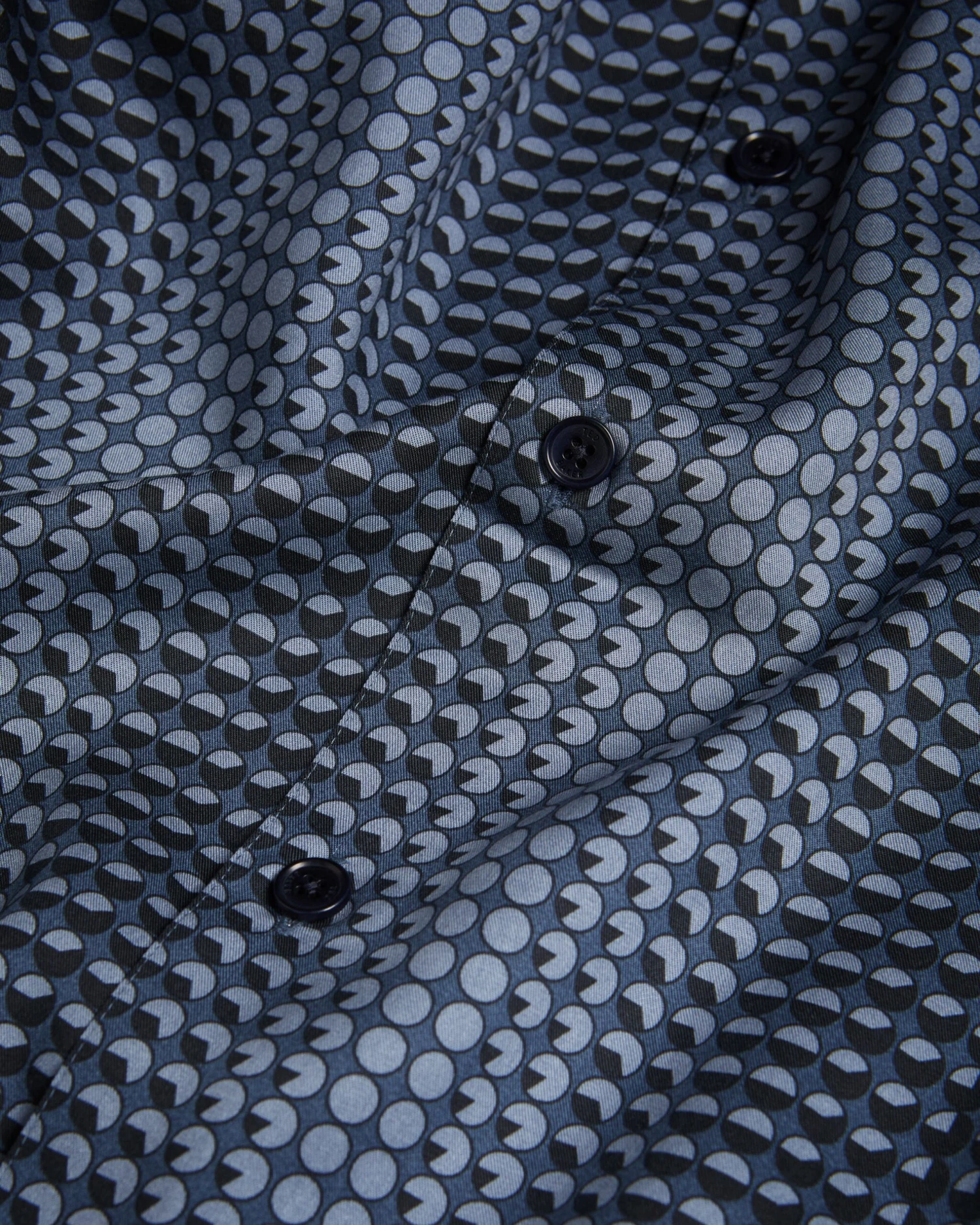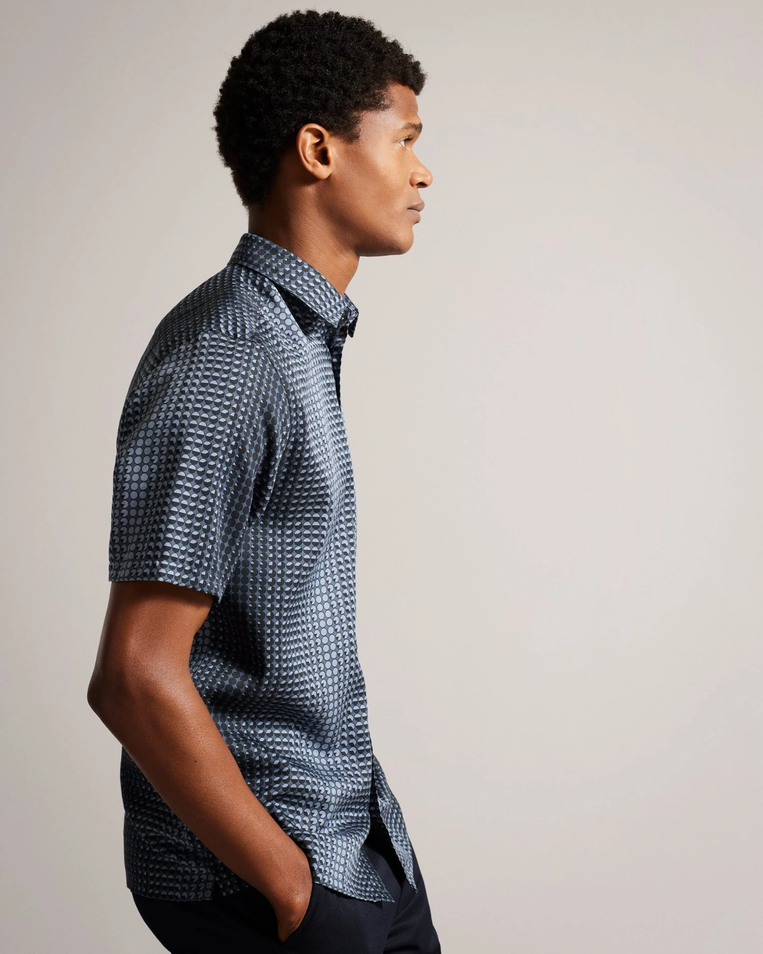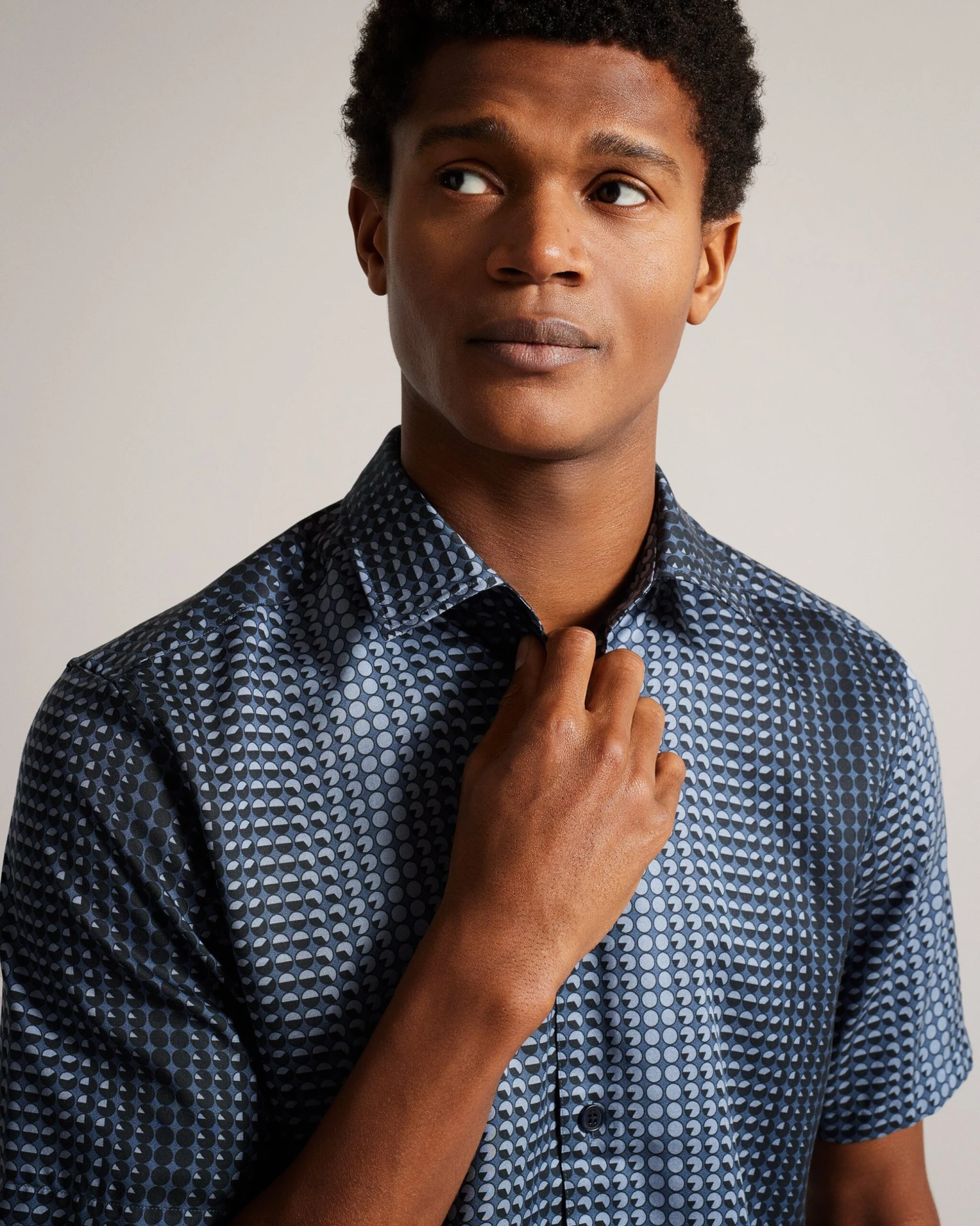 Button up shirt 100% lyocell Mini geometric circle print Short sleeved Regular fit Classic collar O’Shea is 6’2.5″ / 1.89m and wears Navy in a Ted size 3