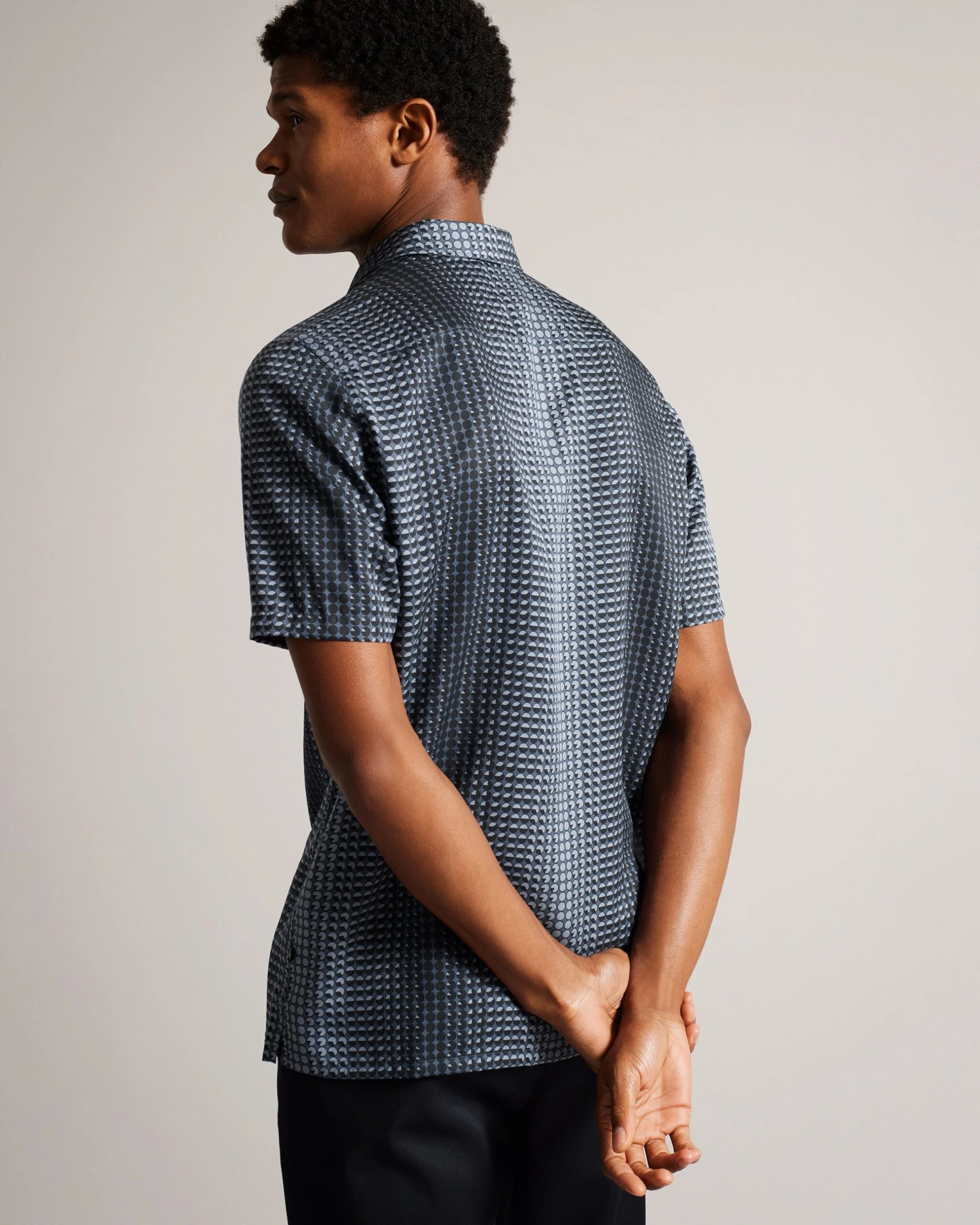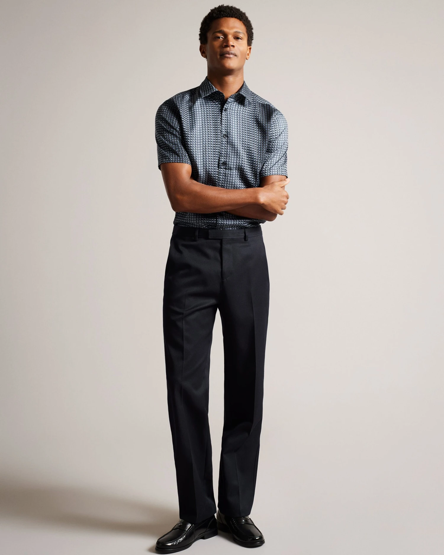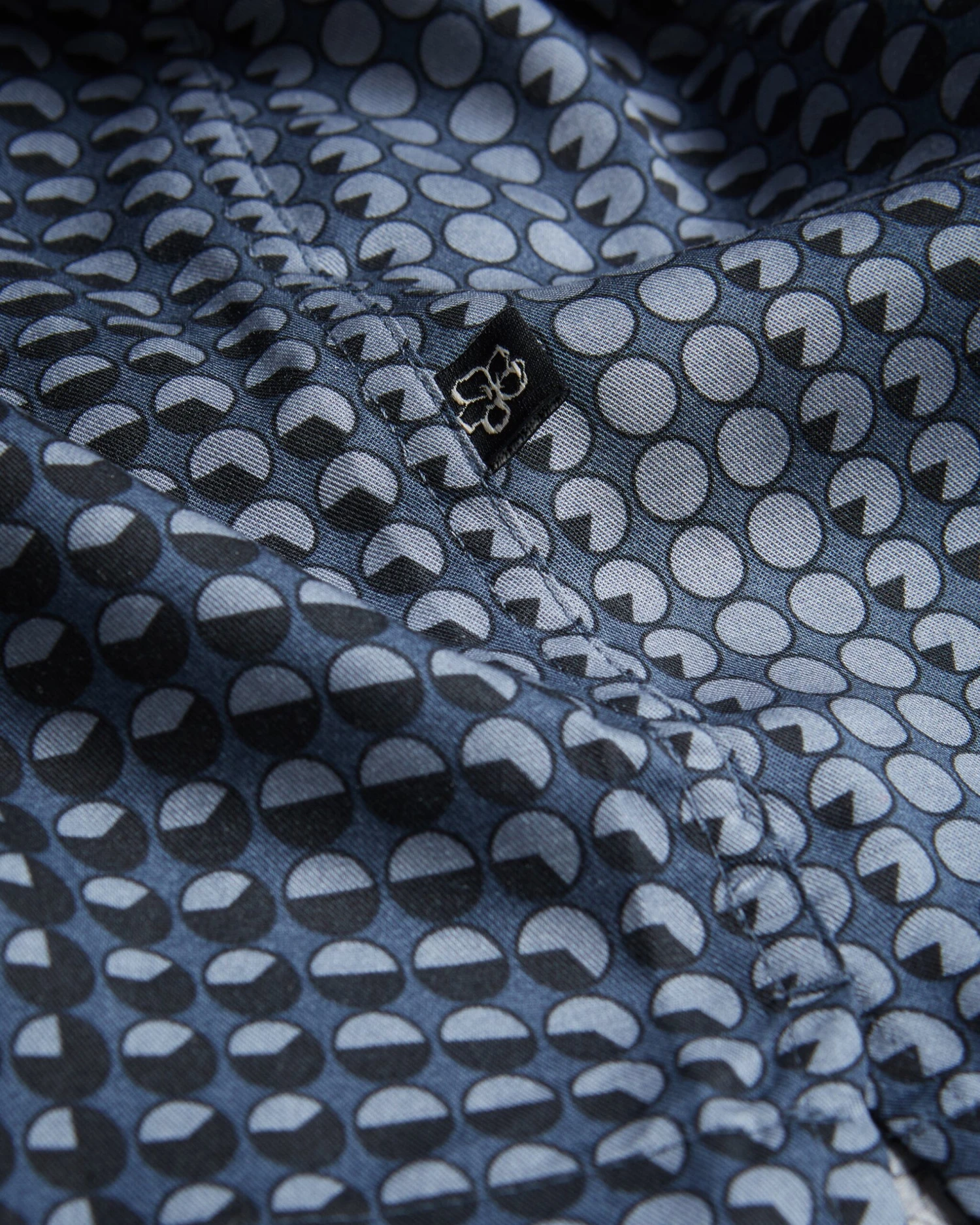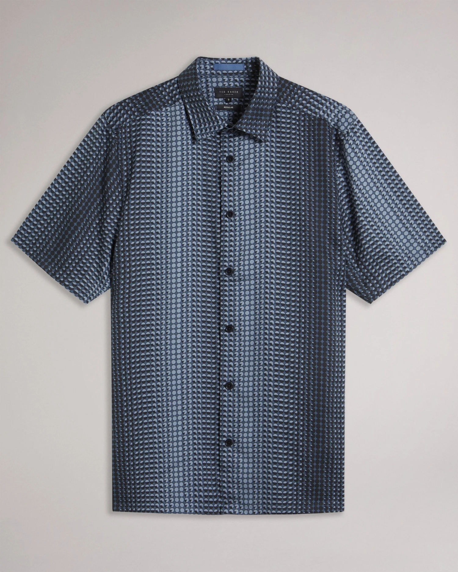Button up shirt 100% lyocell Mini geometric circle print Short sleeved Regular fit Classic collar O’Shea is 6’2.5″ / 1.89m and wears Navy in a Ted size 3