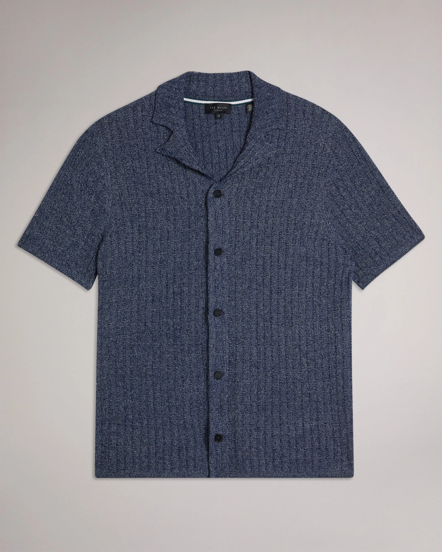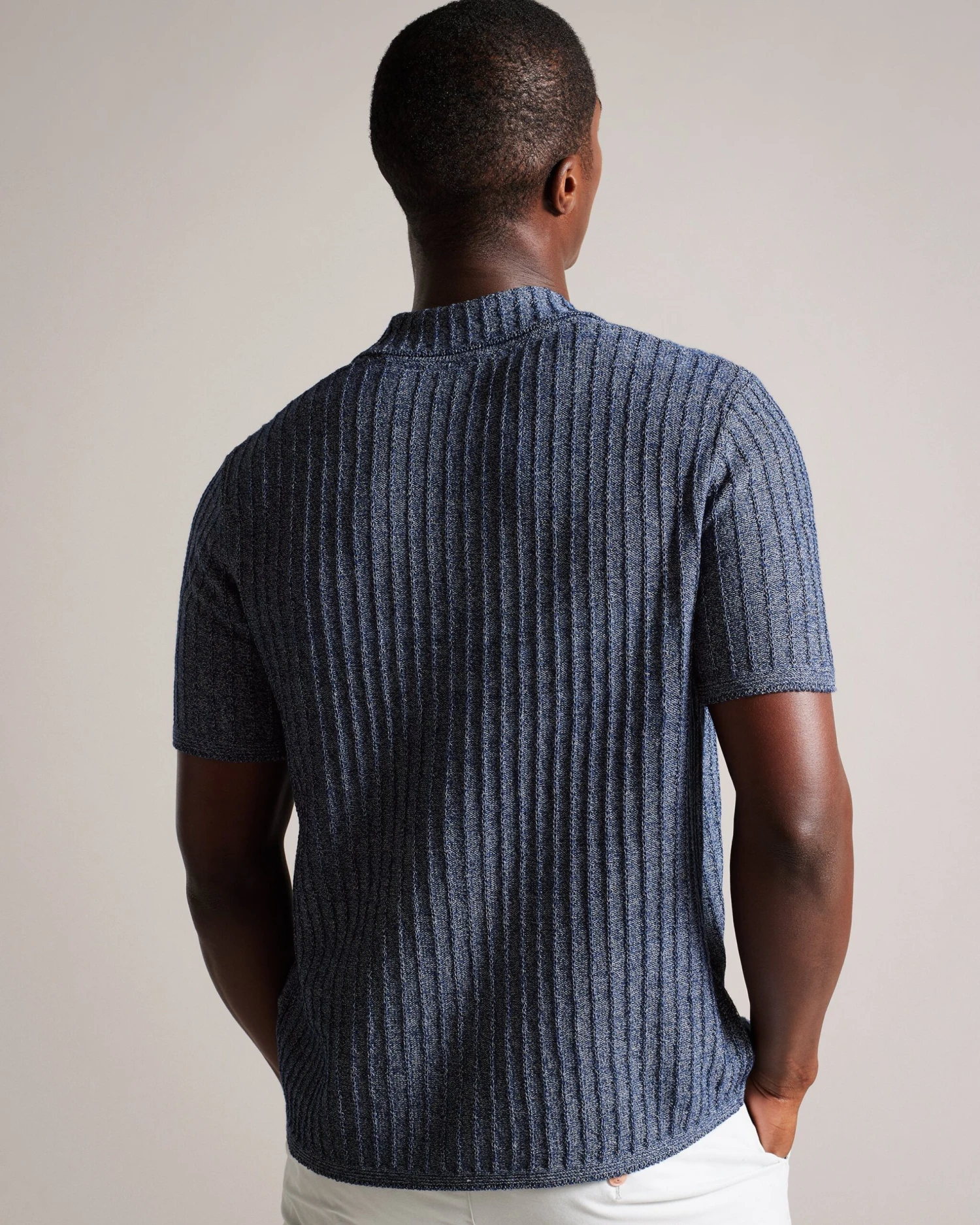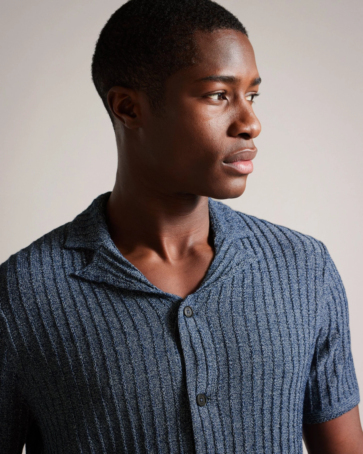 Shirt Short sleeved Modal blend Striped knit Cuban collar Button fastening Joseph is 6’1″ / 1.85m and wears Navy in a Ted size 3