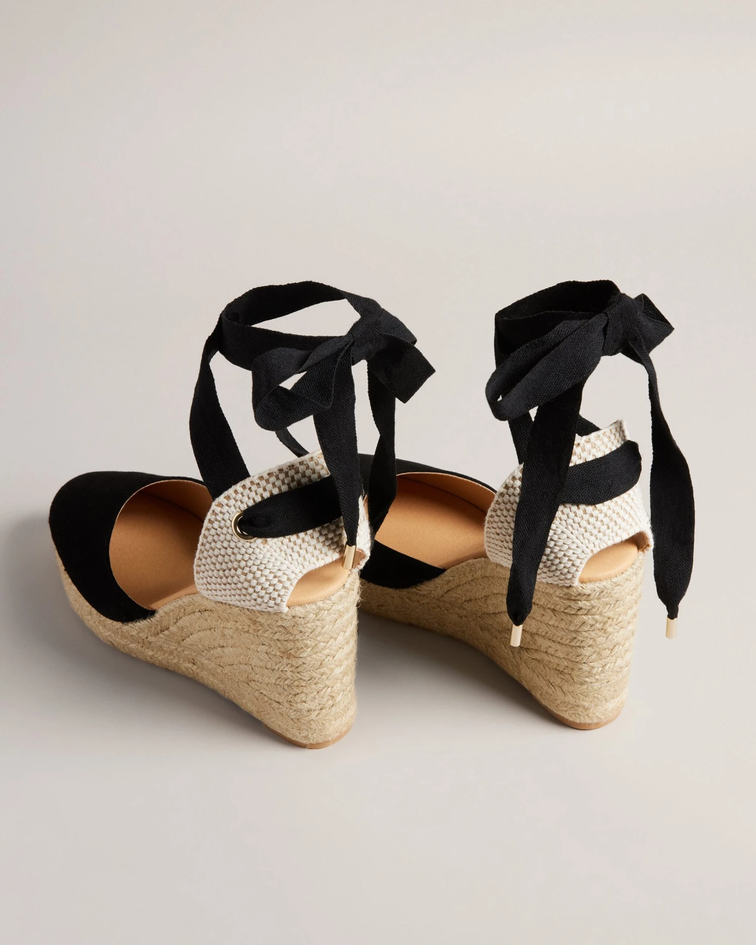 Wedge espadrille sandals Suede leather upper Ribbon tied ankle Closed round toe Woven heel and midsole
