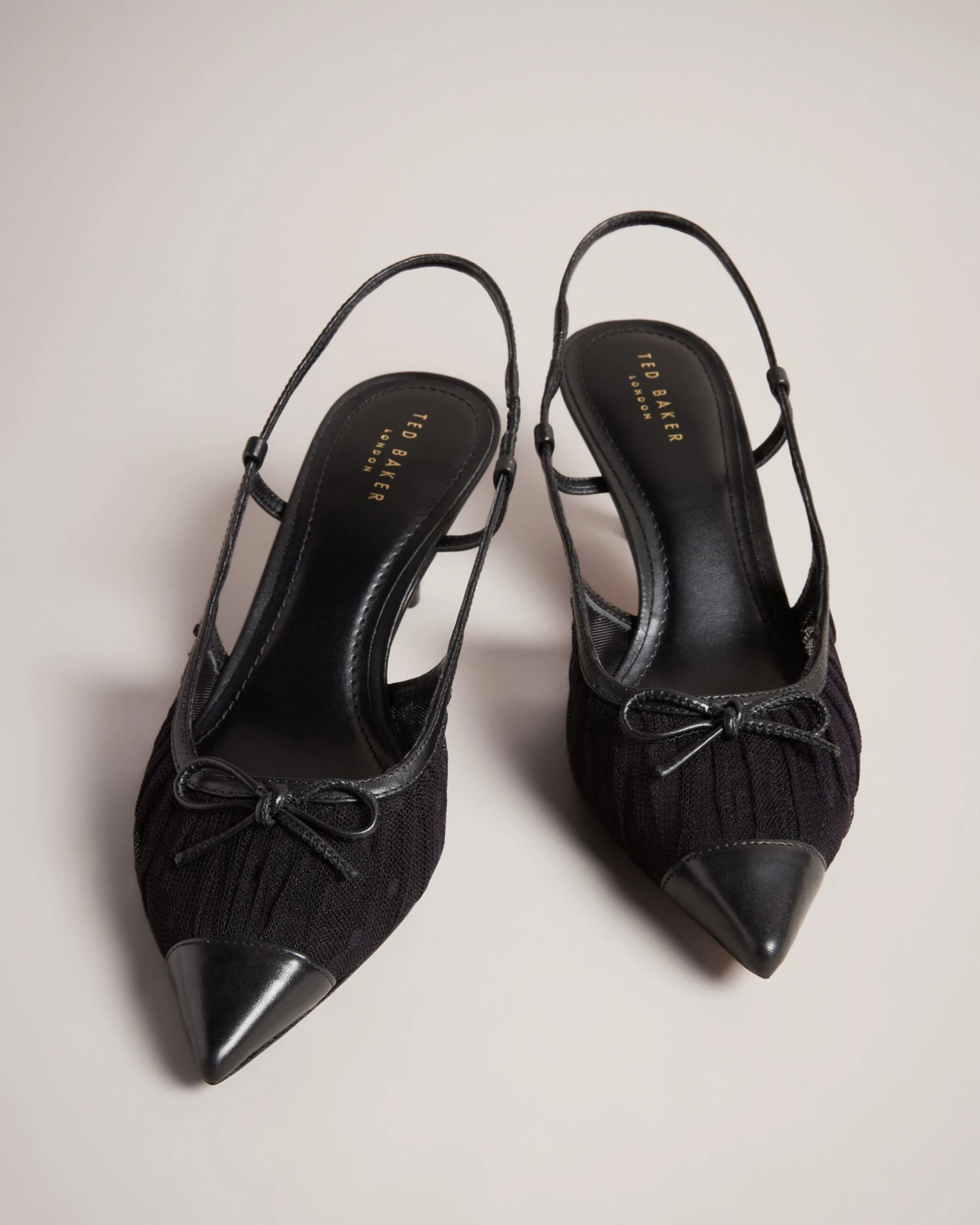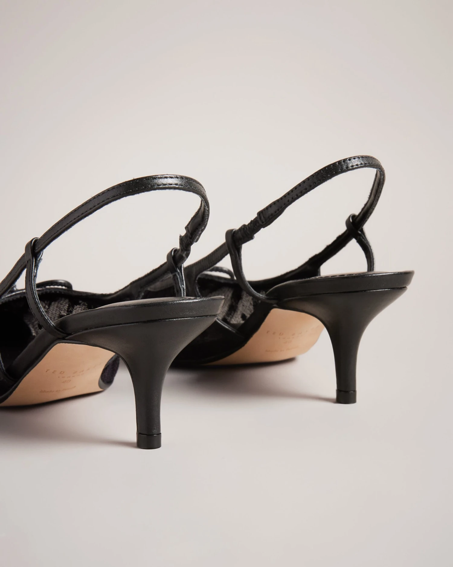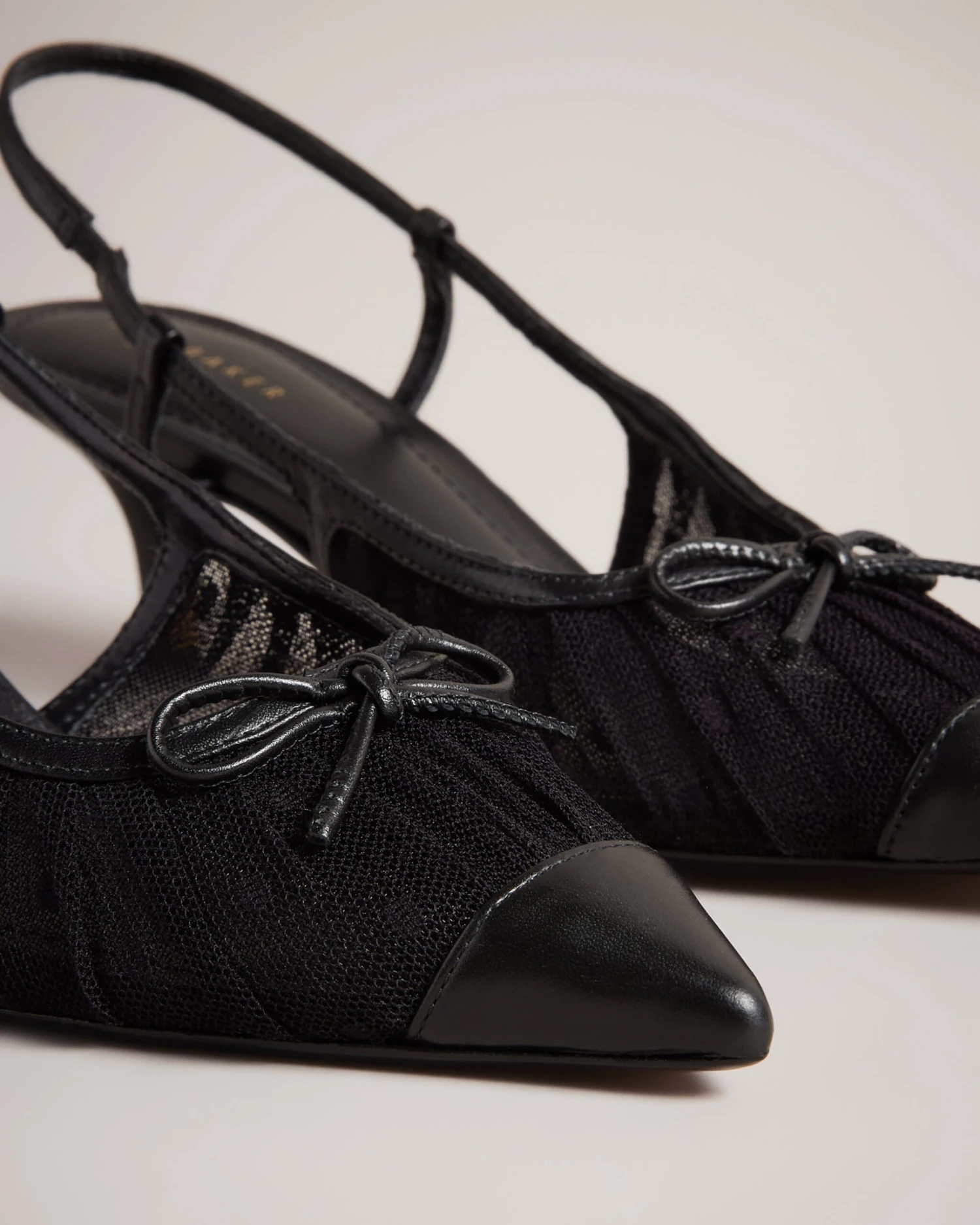 Kitten heels Mesh and leather Slingback heel Slip on Lace bow detail Pointed toe