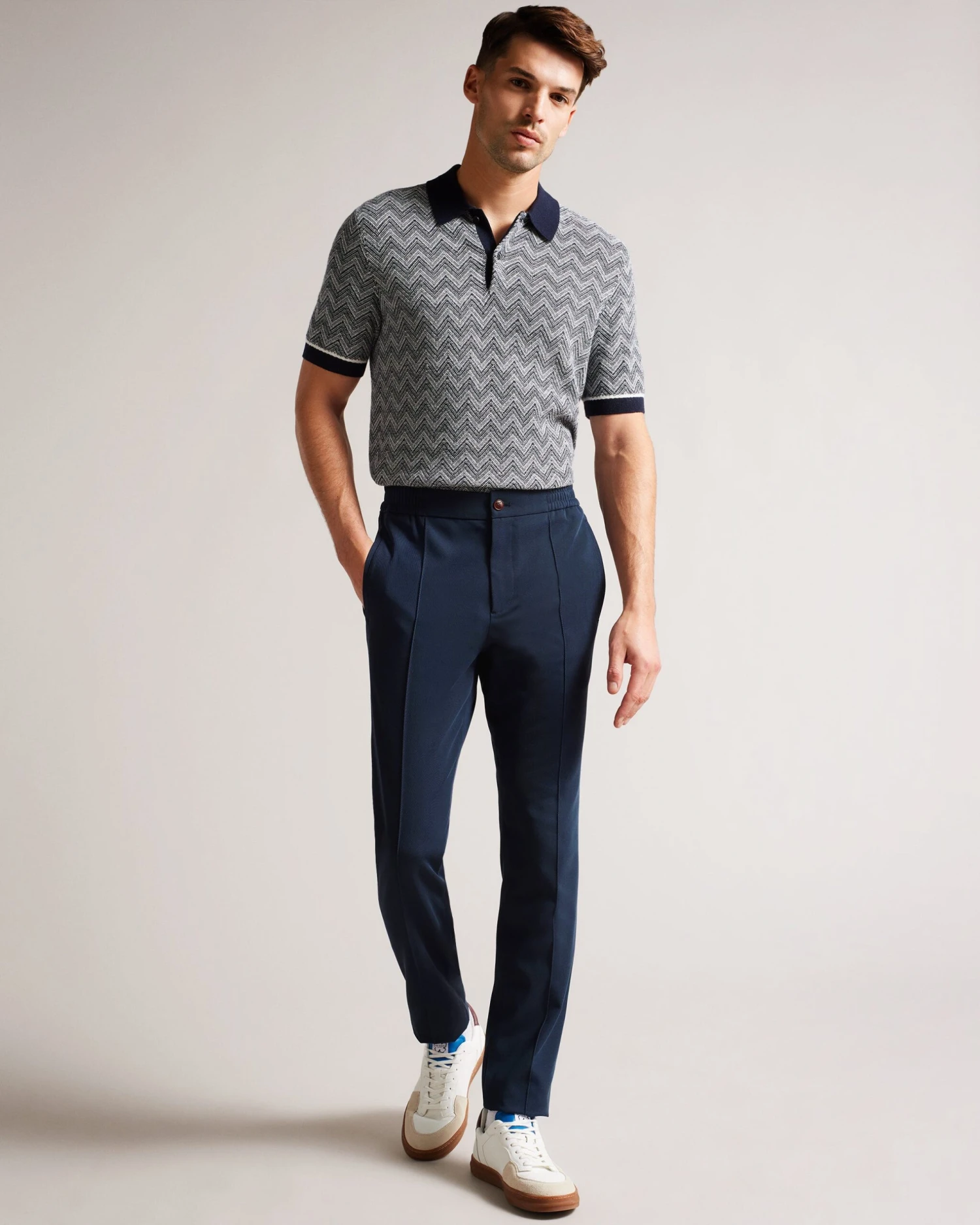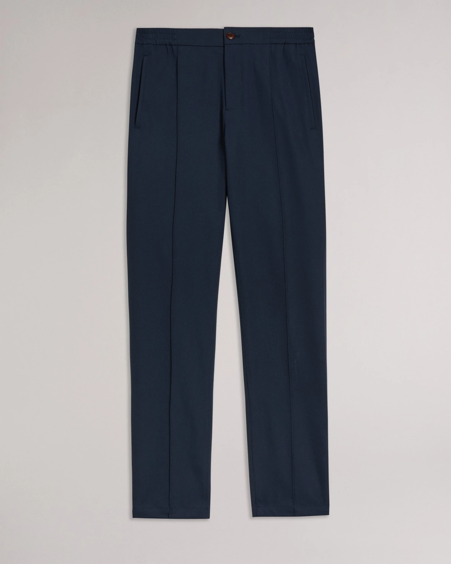 Trousers Slim fit Zip and button fastening Elasticated waist Pockets Braided piping Joseph is 6’1″ / 1.85m and wears Navy in 32 R