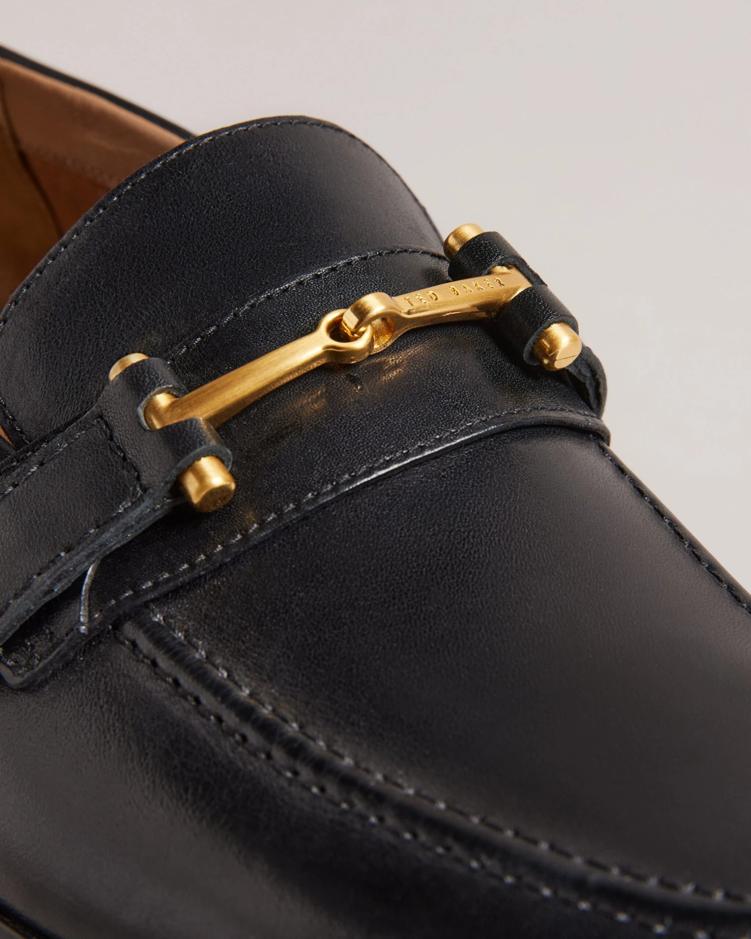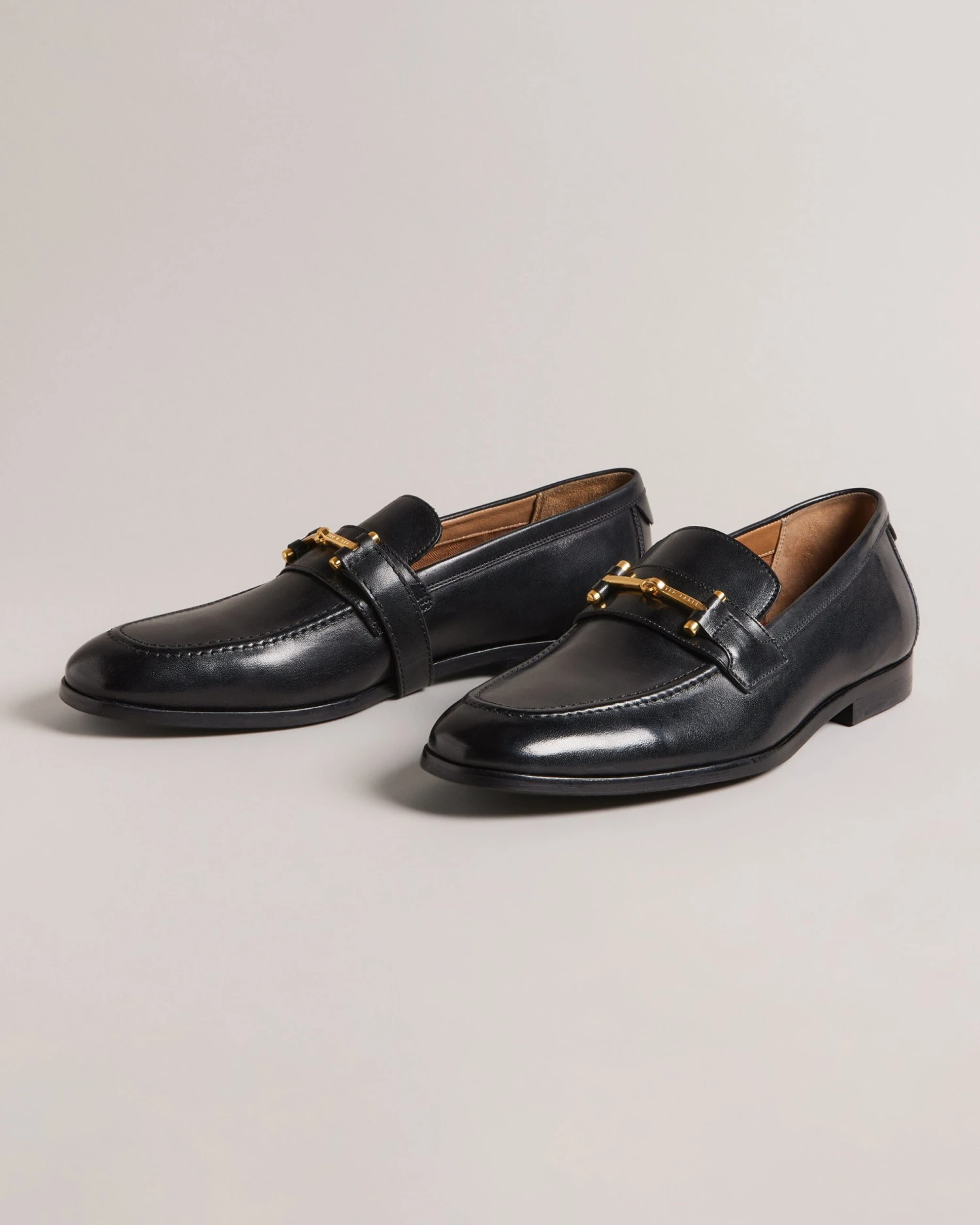 Snaffle loafers Top grain leather T hinge hardware Almond toe Slip on Engraved logo