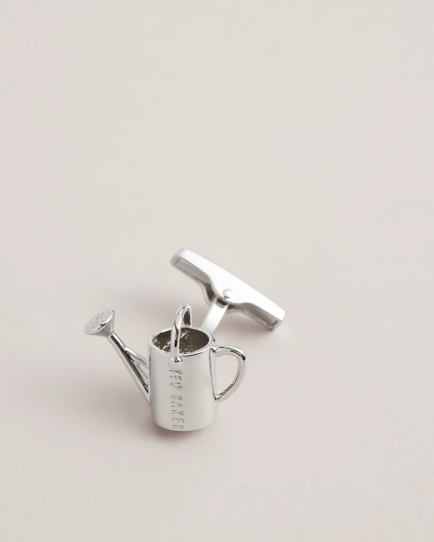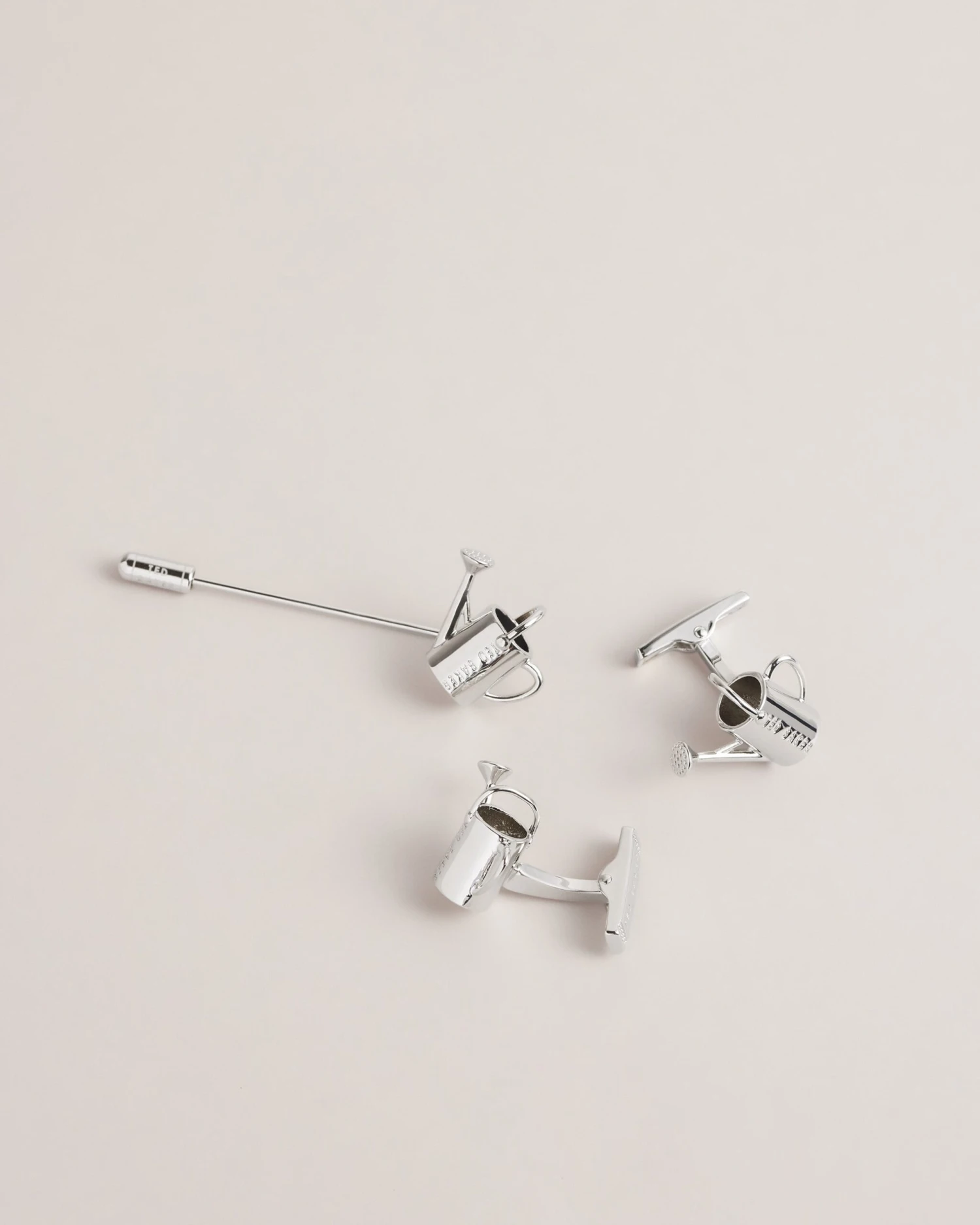 Cufflinks and lapel pin Watering can design Polished metal Engraved logo Comes in Ted Baker branded gift box
