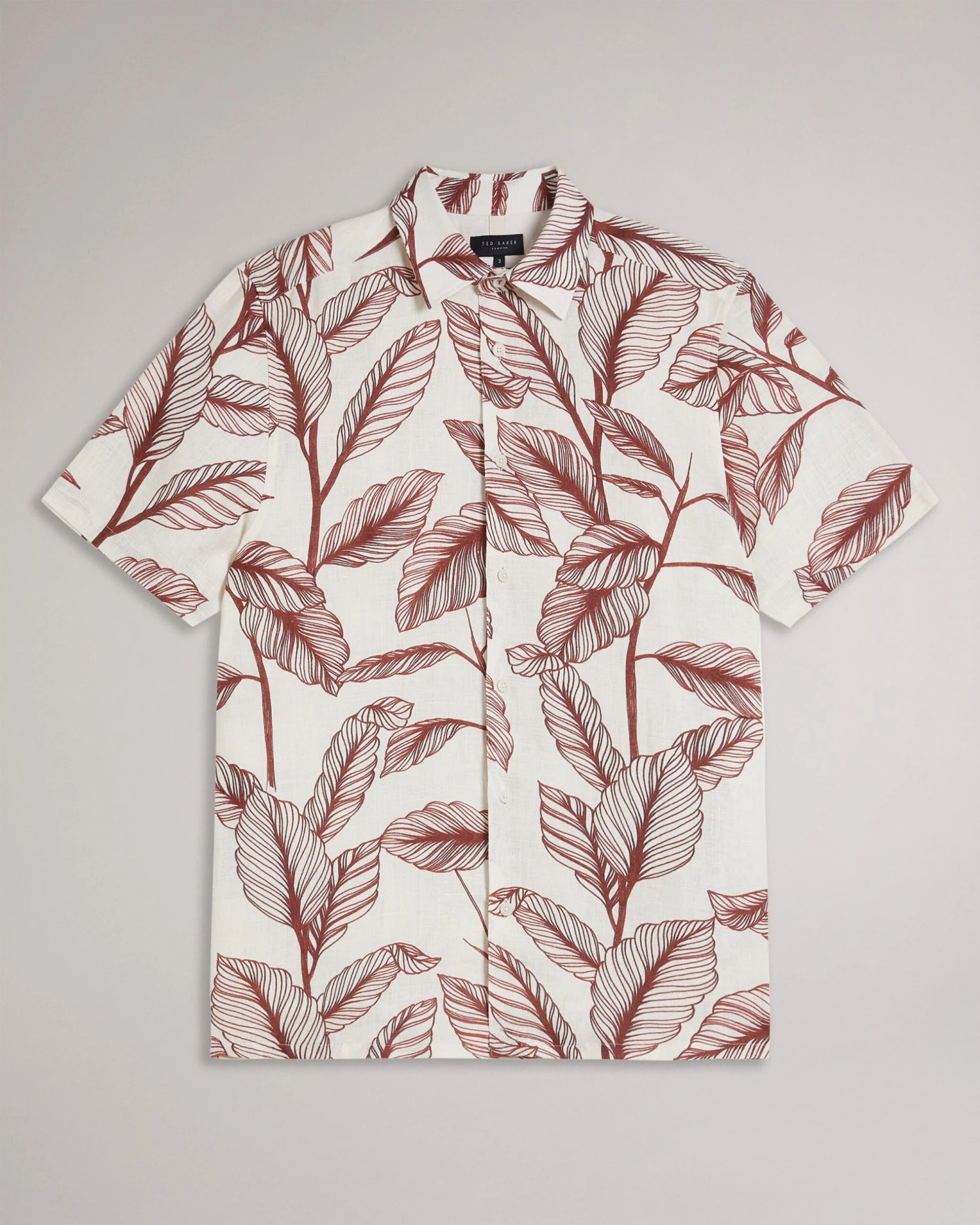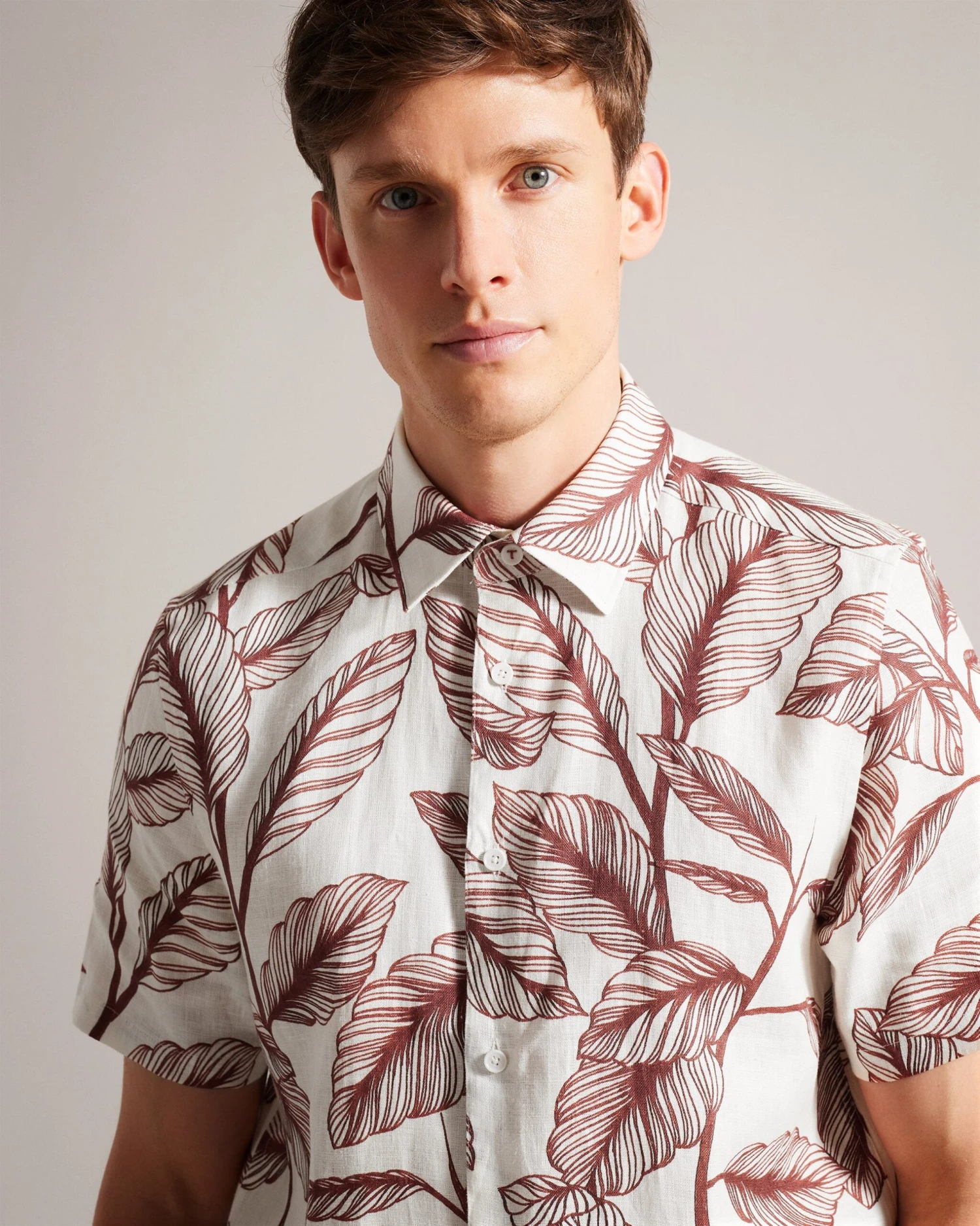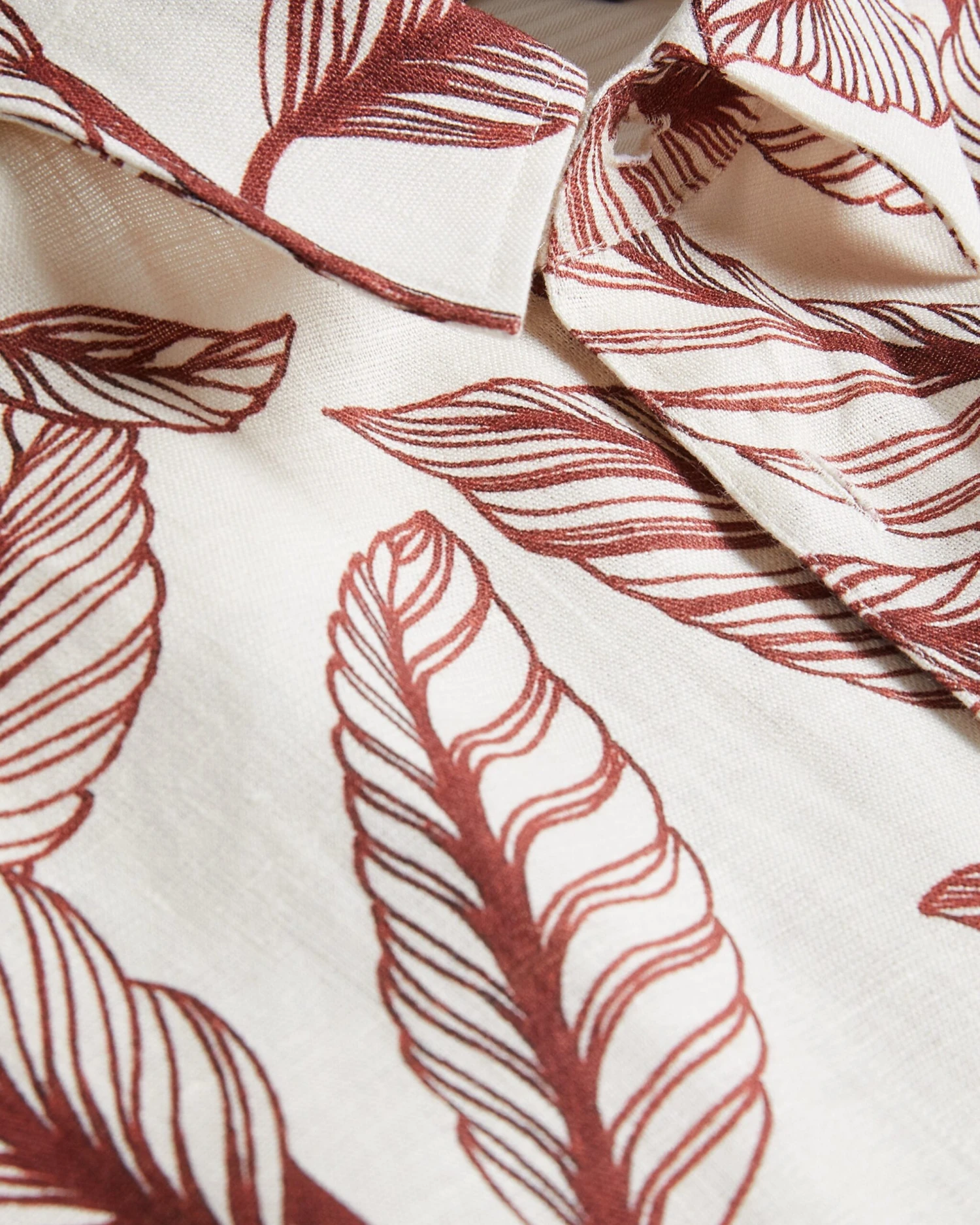 Button up shirt 100% linen Leaf print Short sleeved Classic collar