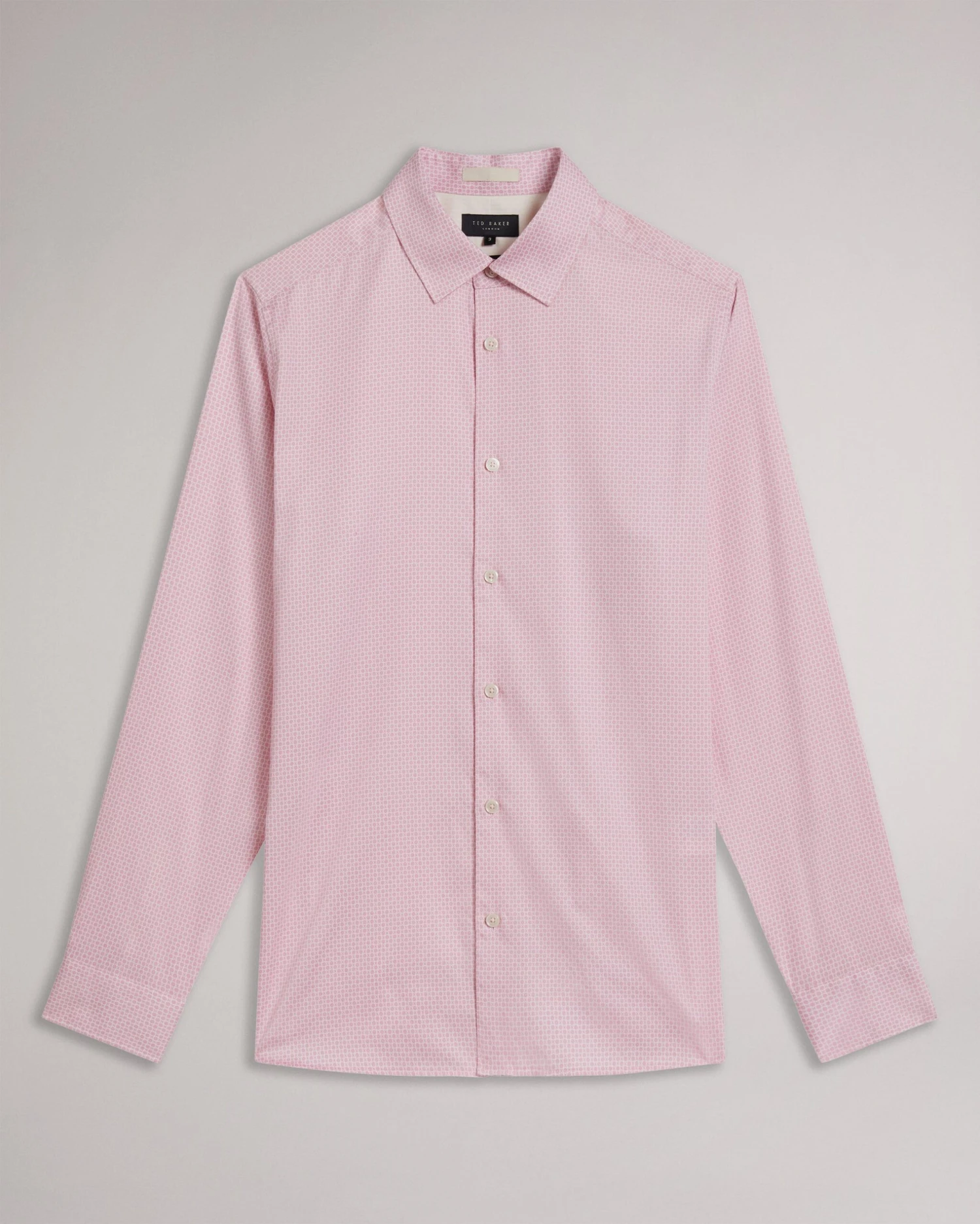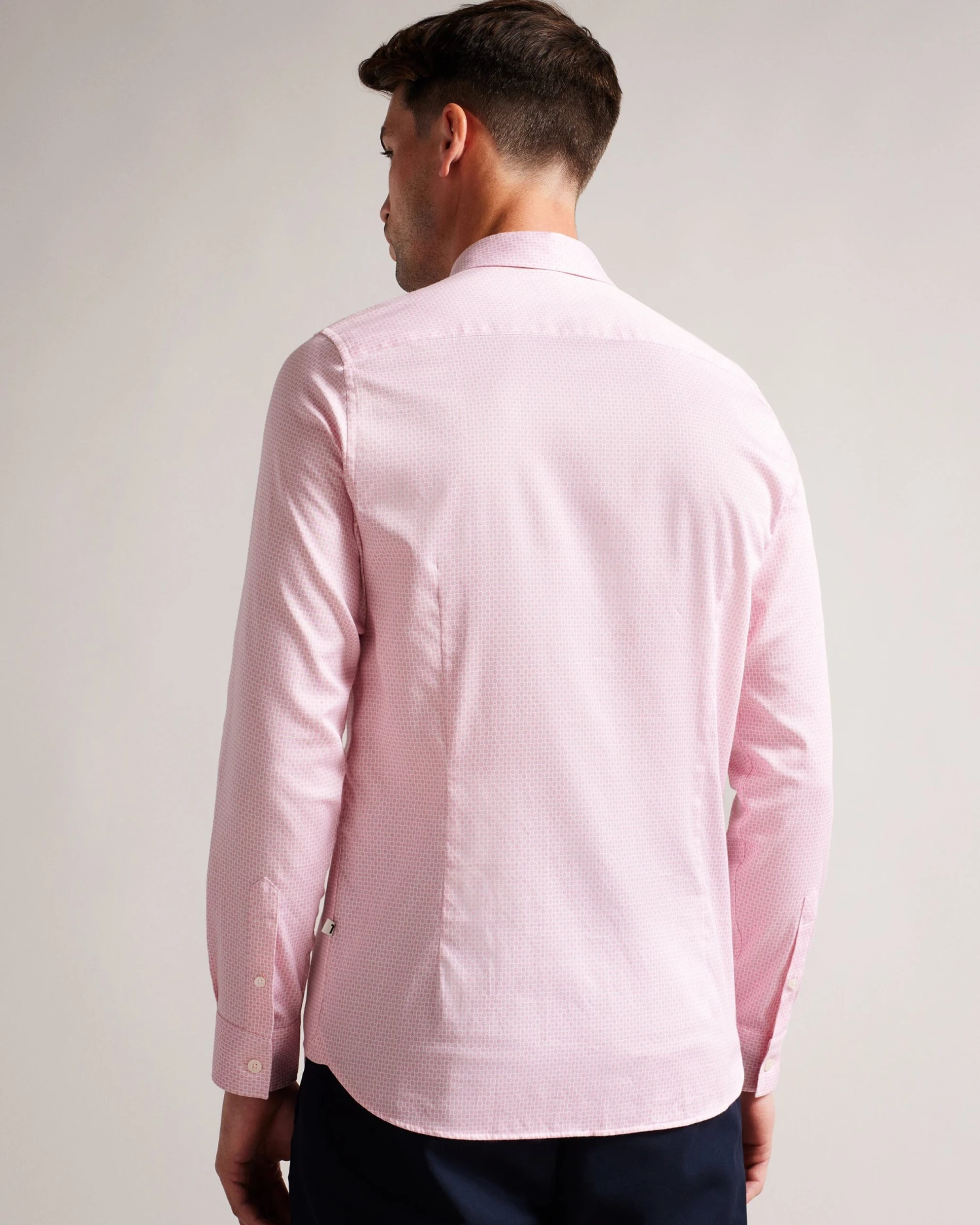 Button up shirt Cotton blend Long sleeved Mini geometric print Classic collar Joseph is 6’1″ / 1.85m and wears Pale Pink in a Ted size 3
